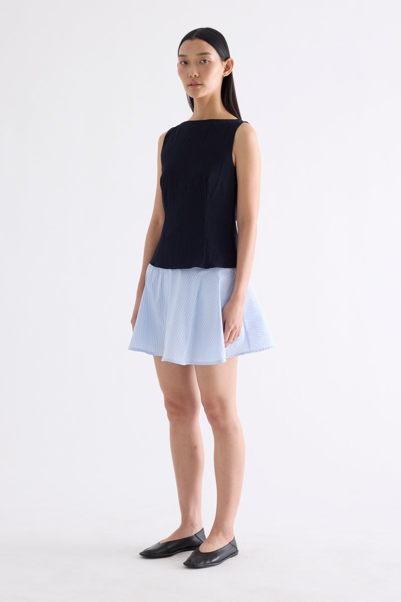 With an element of surprise. Made from smooth and softly structured fabric, this sleeveless tank features a boat neckline, panelled construction and buttoned keyhole opening at the back. Worn in a slim fit with a side zip closure.