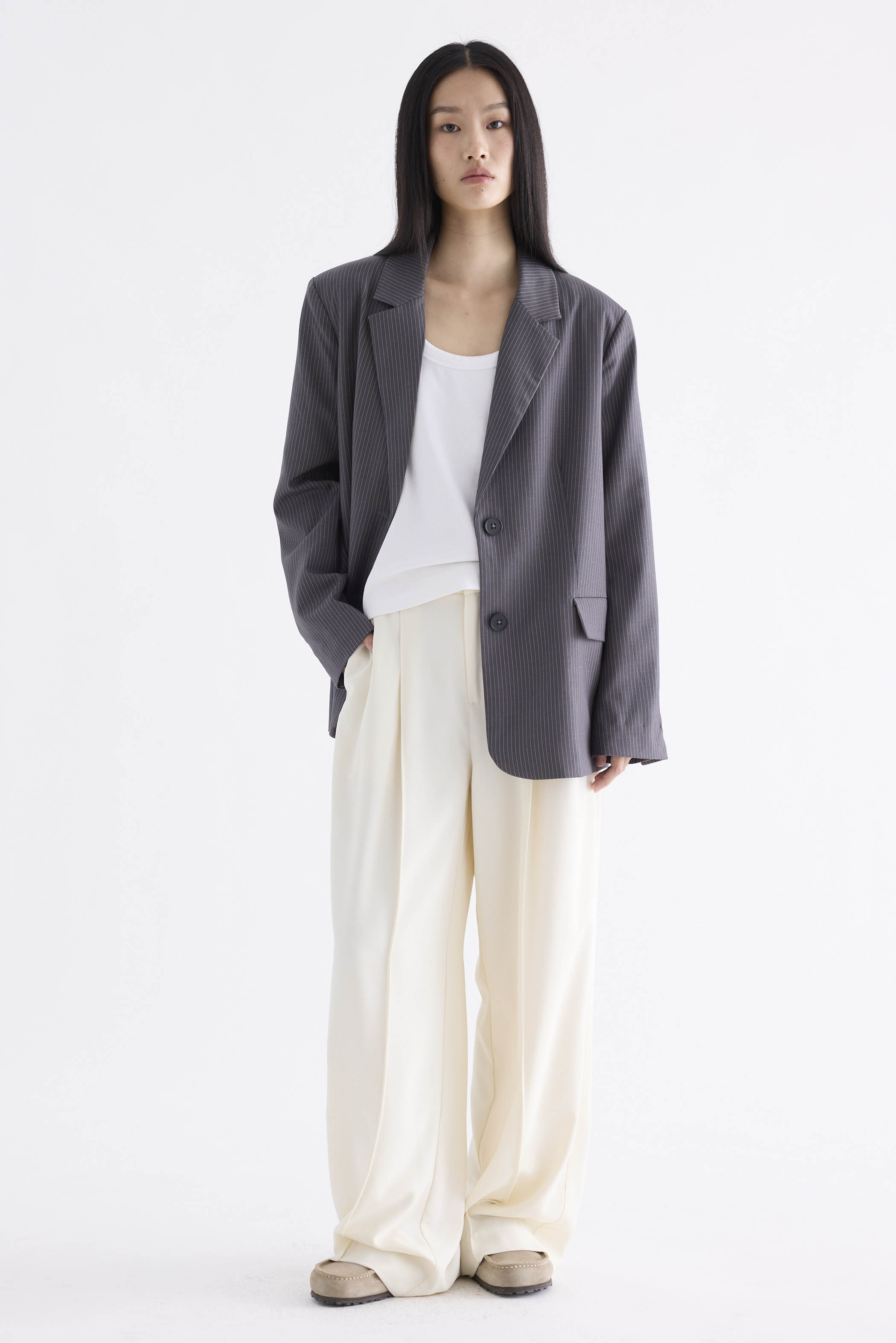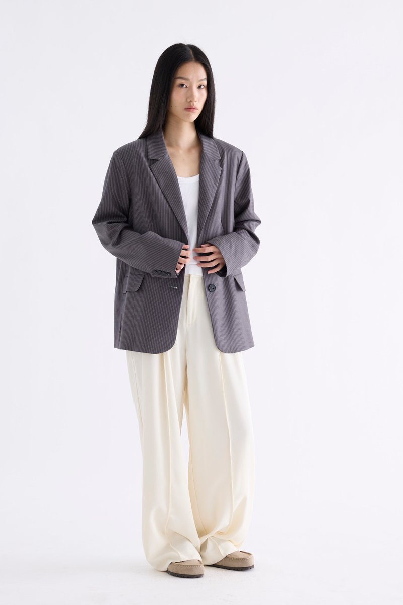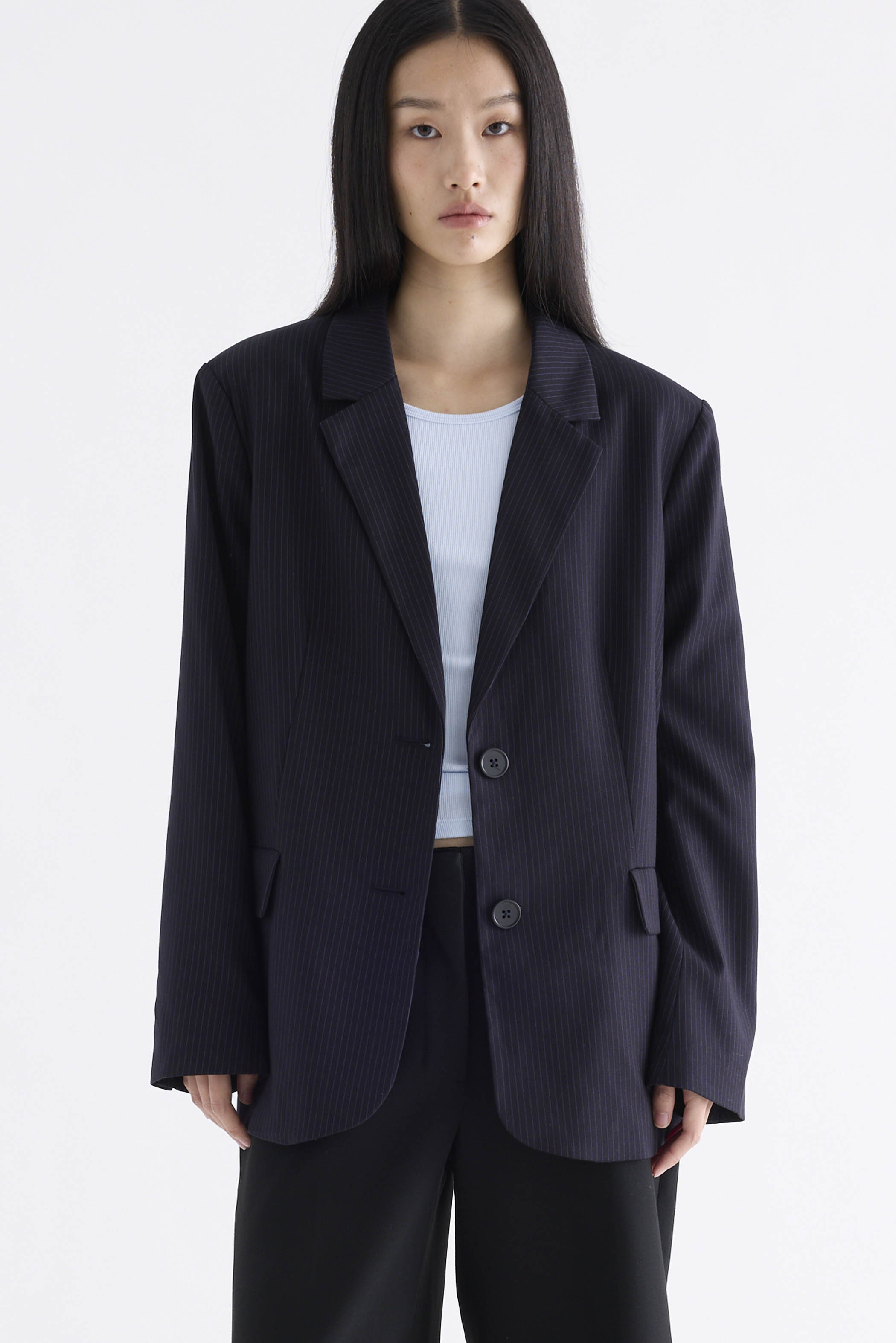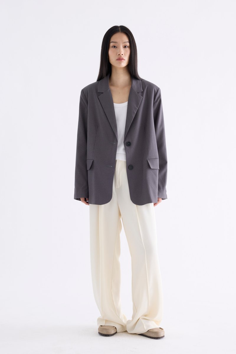 From the Postscript collection. This blazer features a softly tailored silhouette with padded shoulders, notch lapels, buttoned cuffs and functional flap pockets. Fits relaxed with two front buttons.