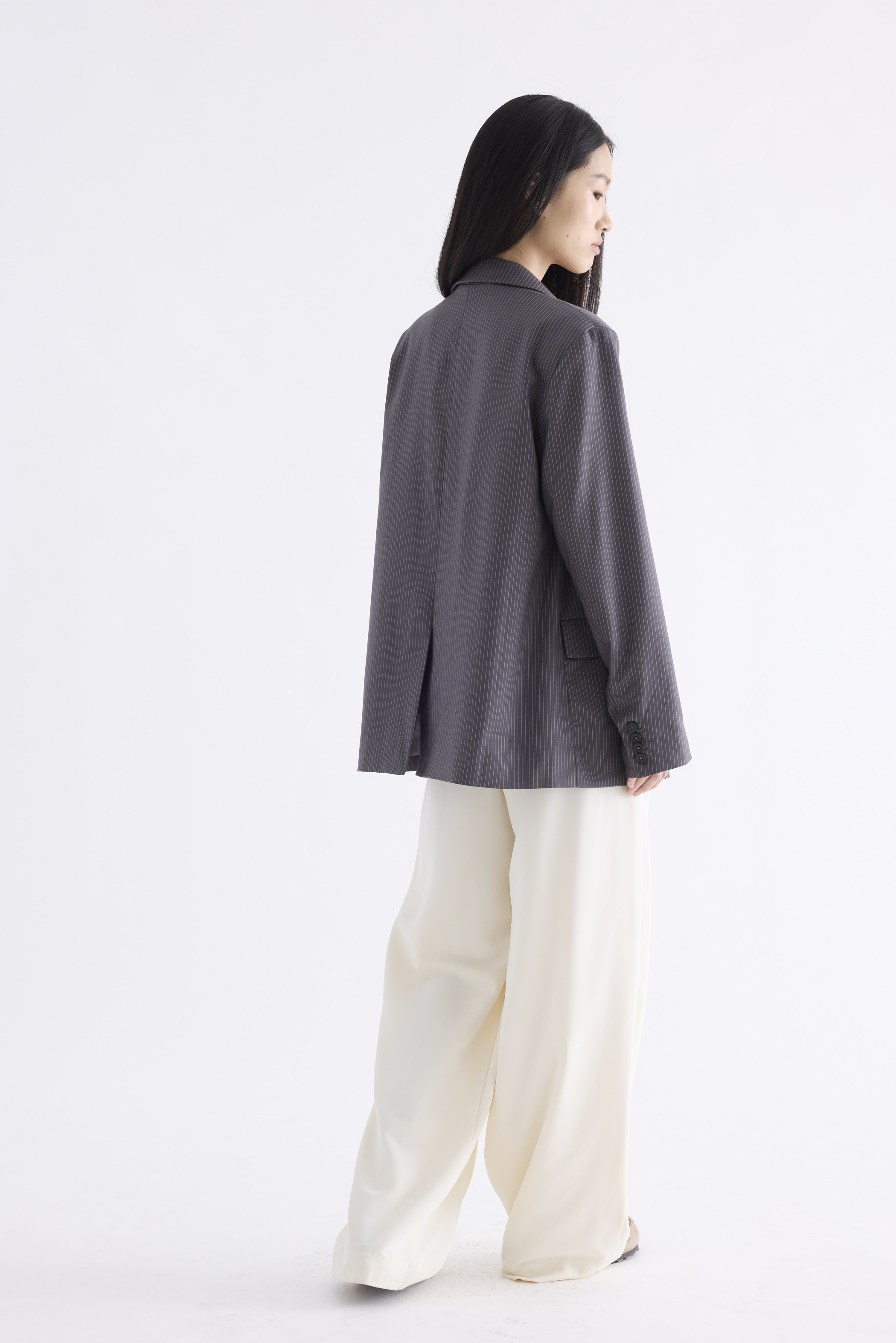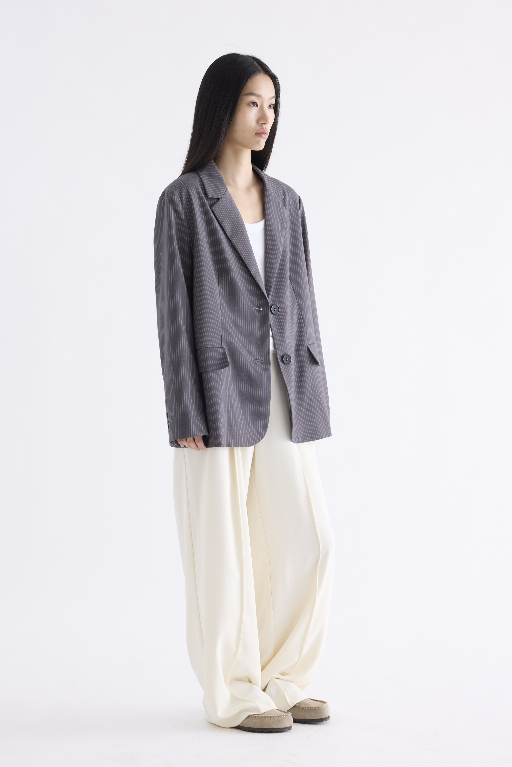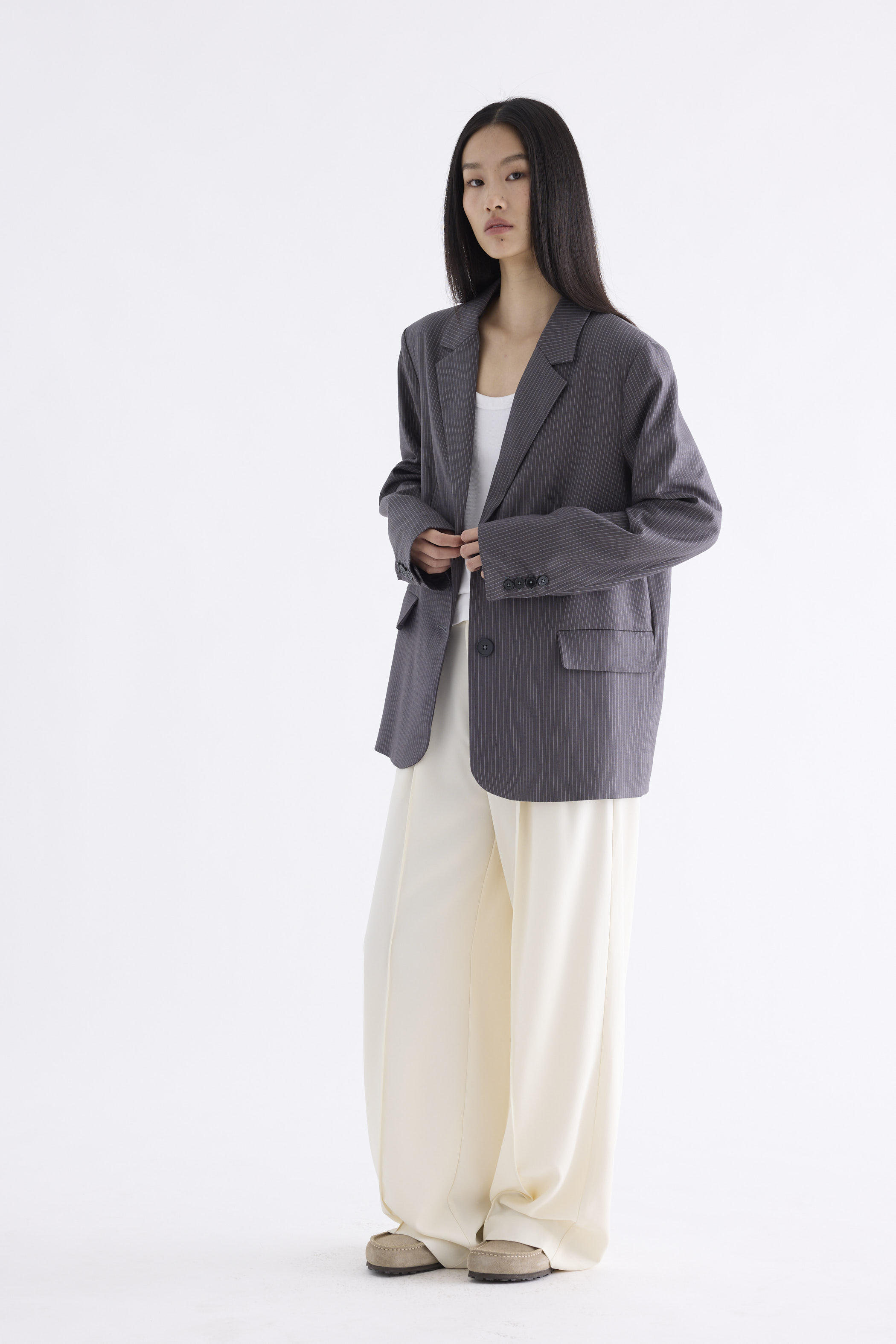From the Postscript collection. This blazer features a softly tailored silhouette with padded shoulders, notch lapels, buttoned cuffs and functional flap pockets. Fits relaxed with two front buttons.