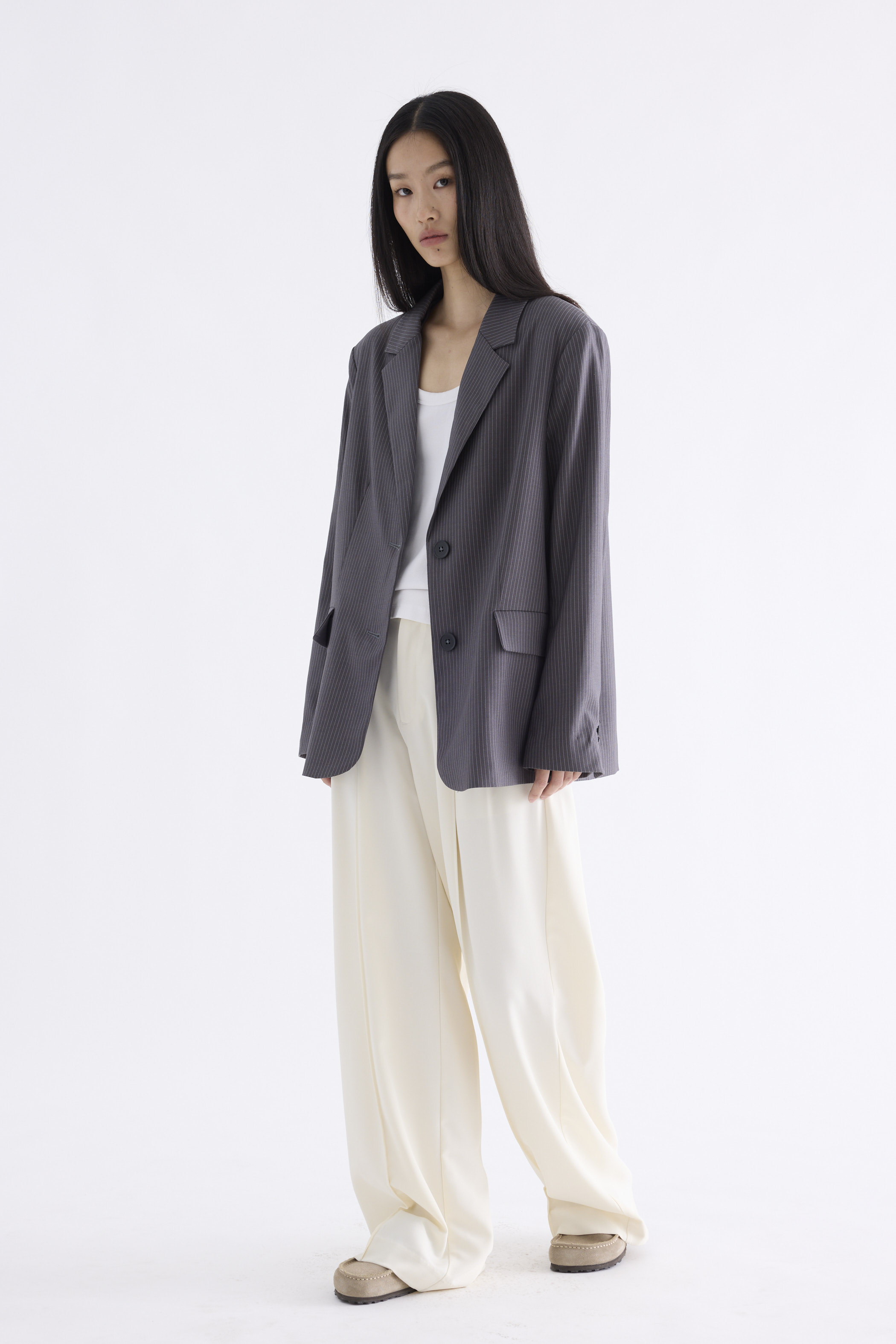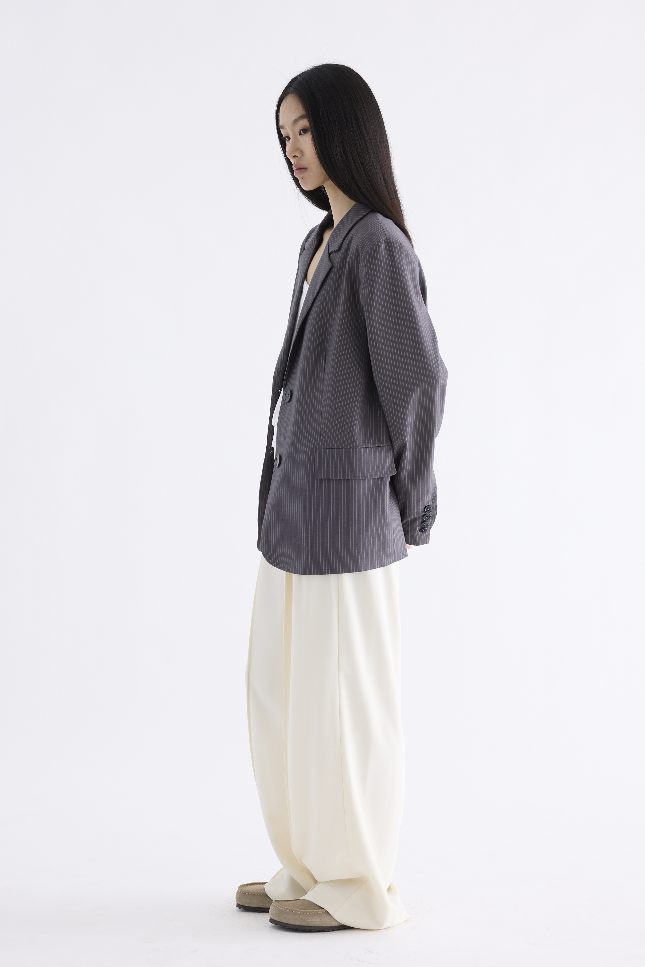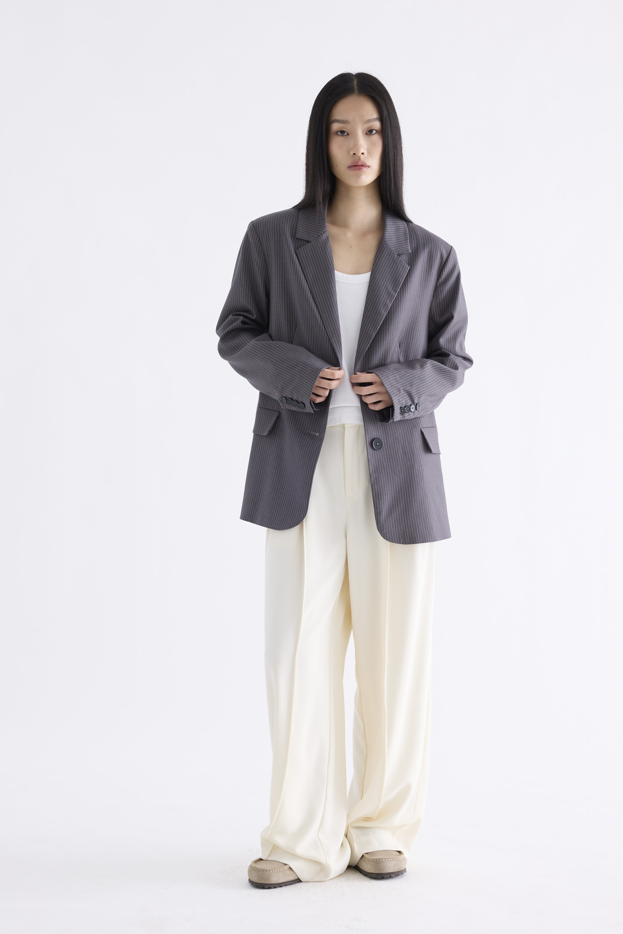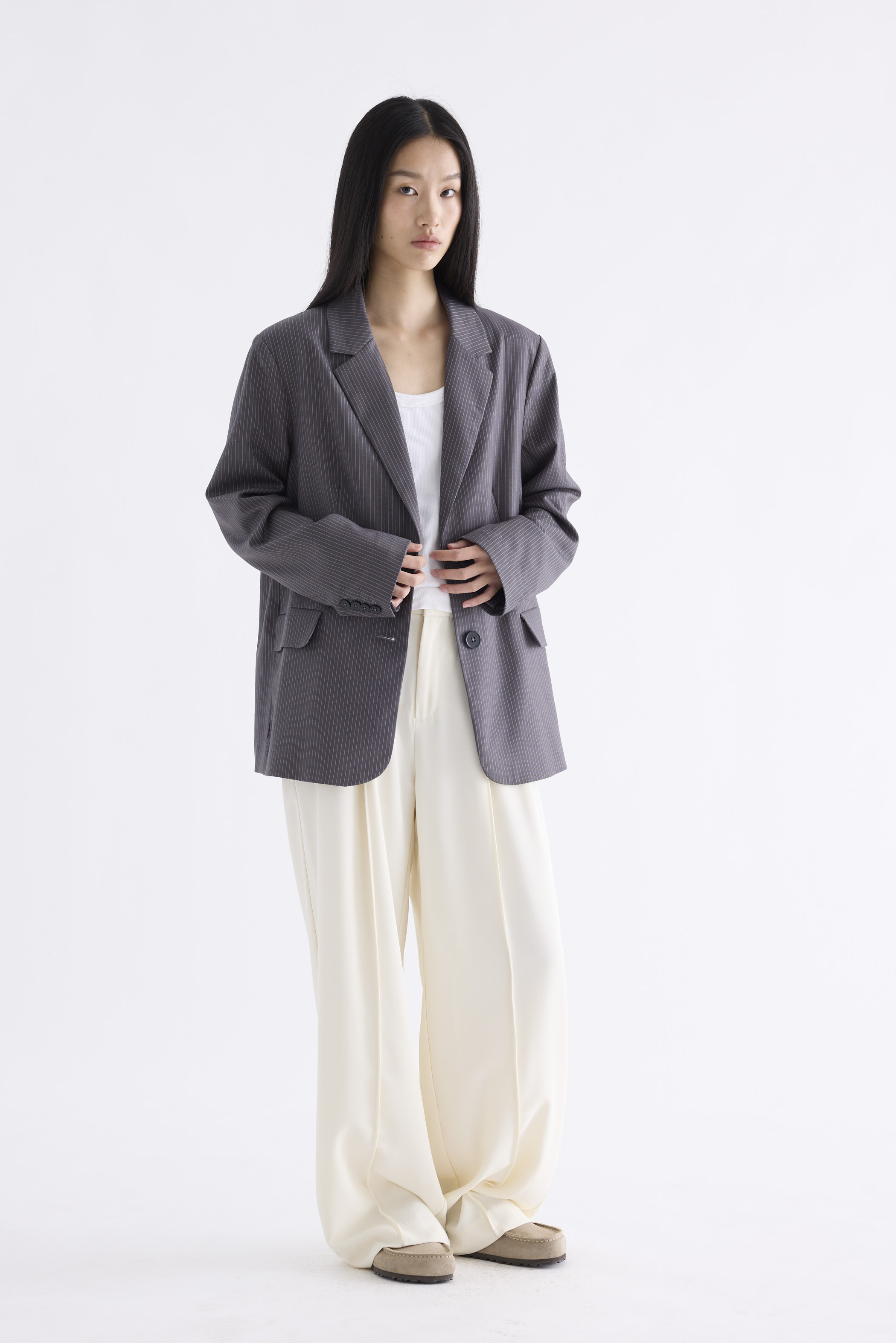From the Postscript collection. This blazer features a softly tailored silhouette with padded shoulders, notch lapels, buttoned cuffs and functional flap pockets. Fits relaxed with two front buttons.