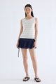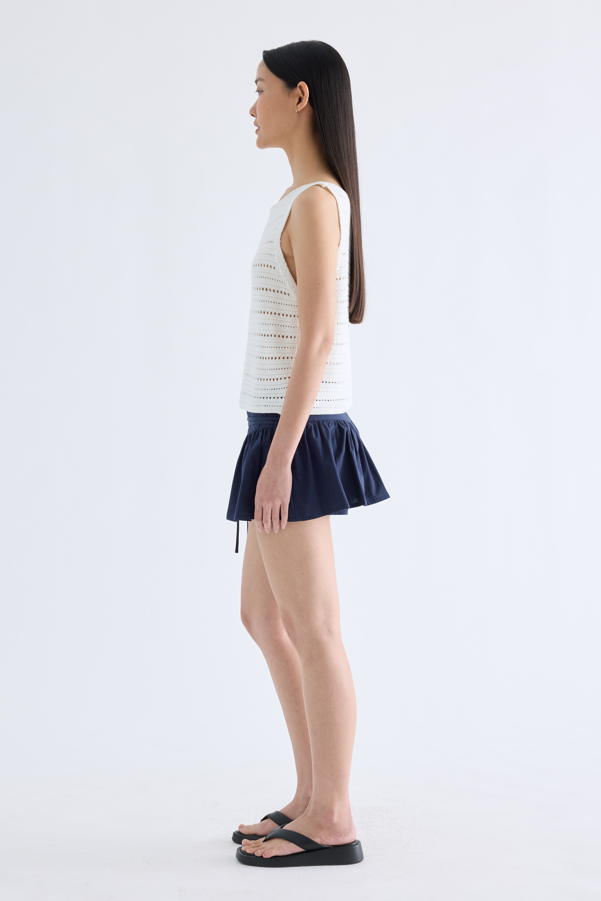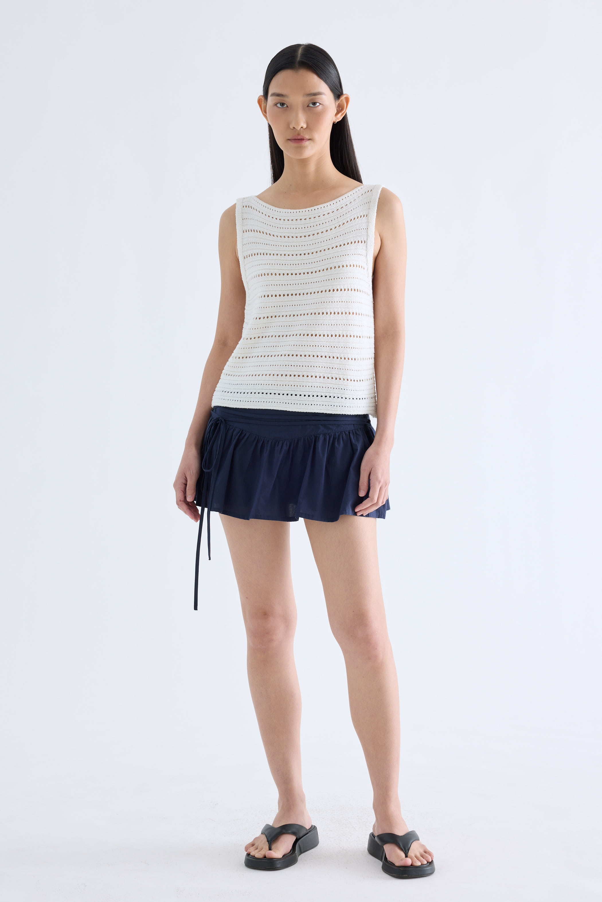 Transitional textures. Made from light and airy crochet knit, this sleeveless tank features a wide neckline and cut-in shoulders. Worn in a slim fit.