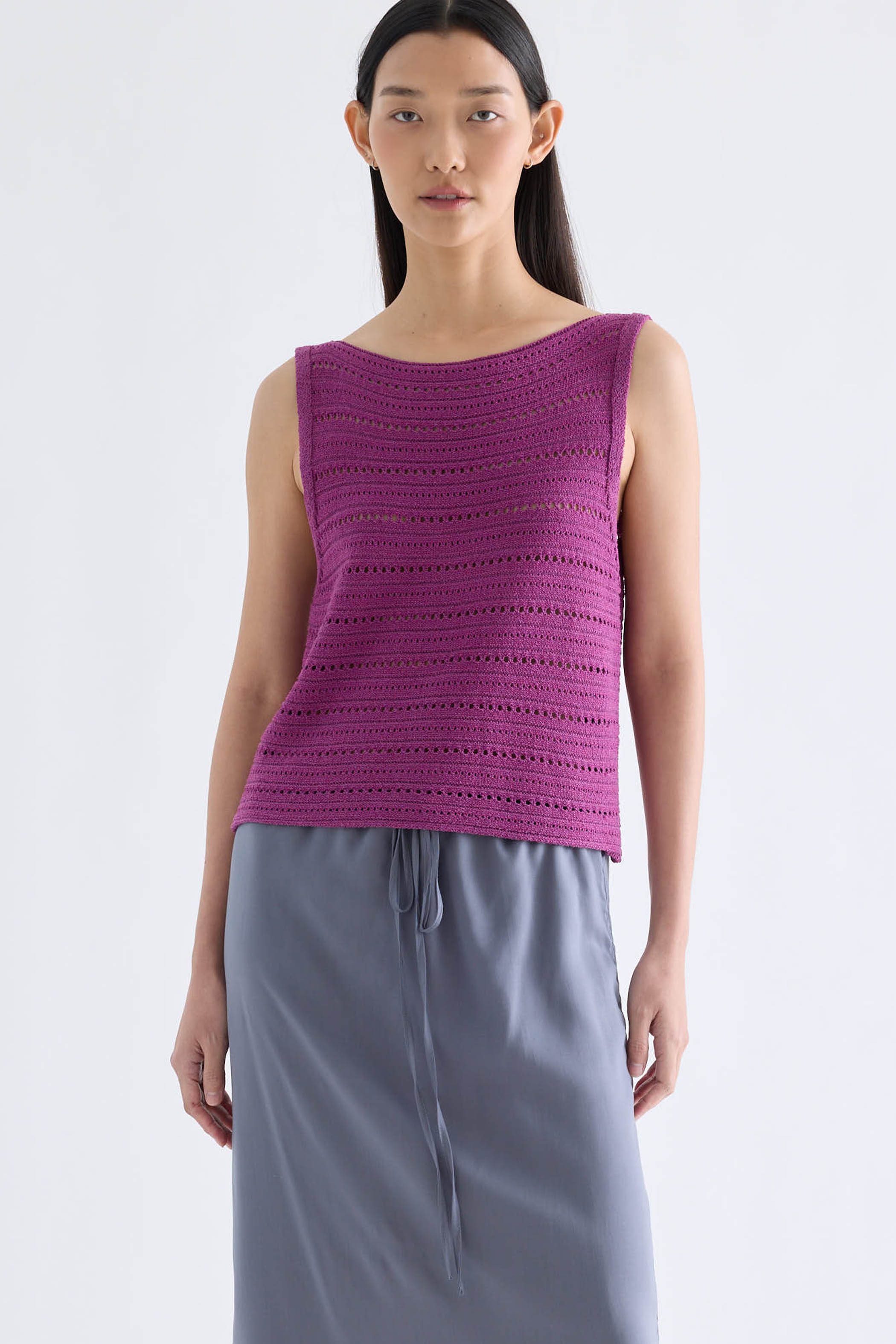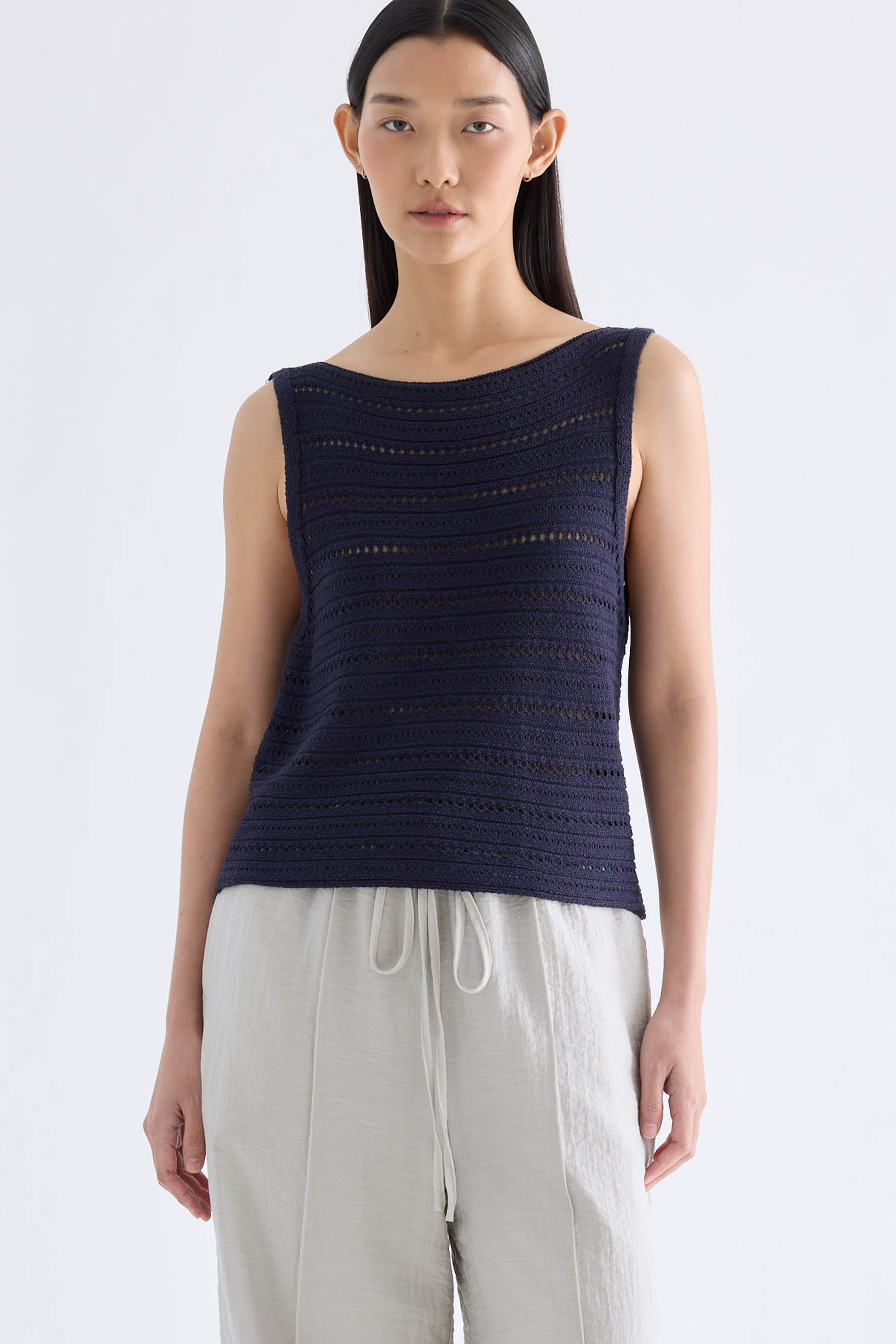 Transitional textures. Made from light and airy crochet knit, this sleeveless tank features a wide neckline and cut-in shoulders. Worn in a slim fit.