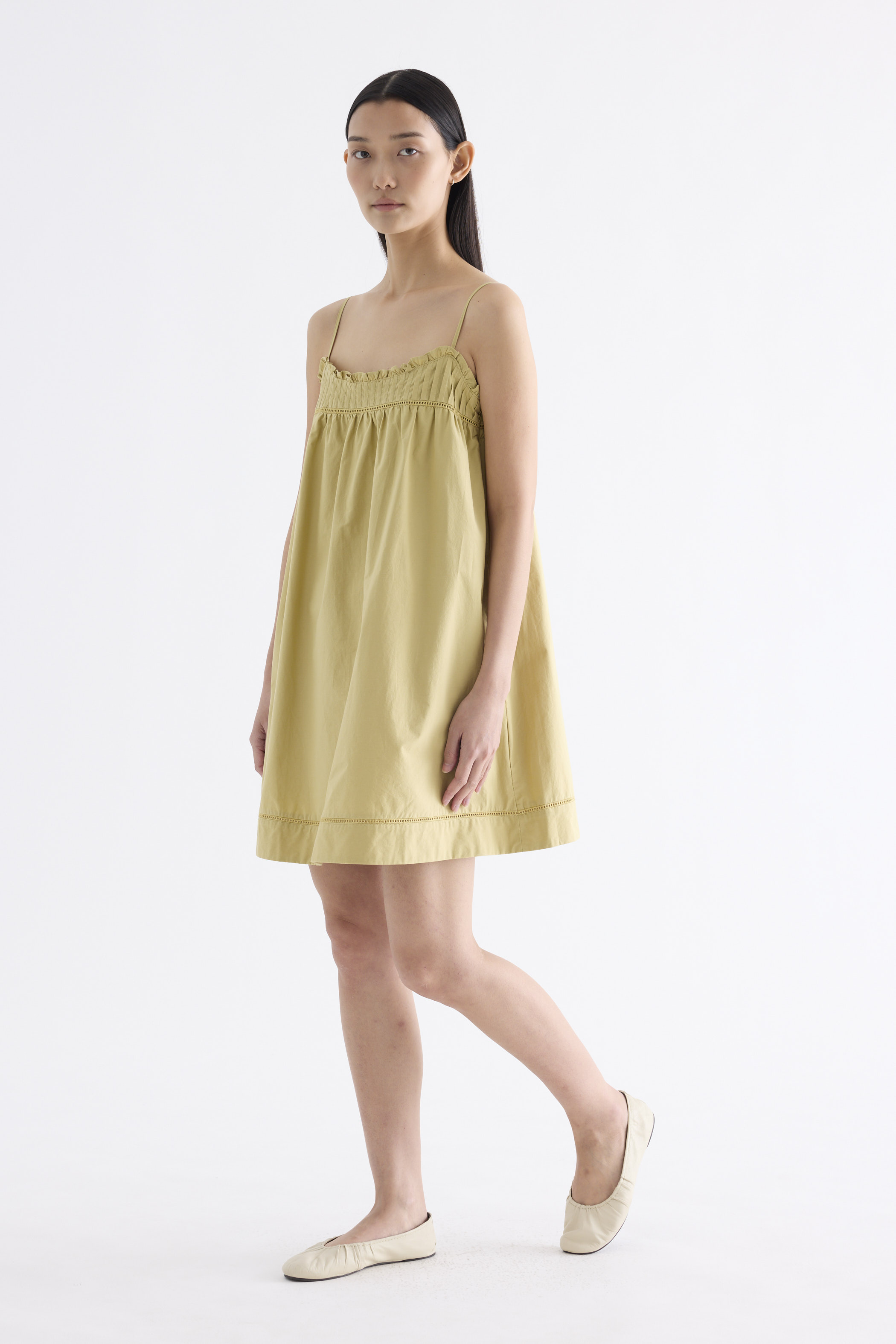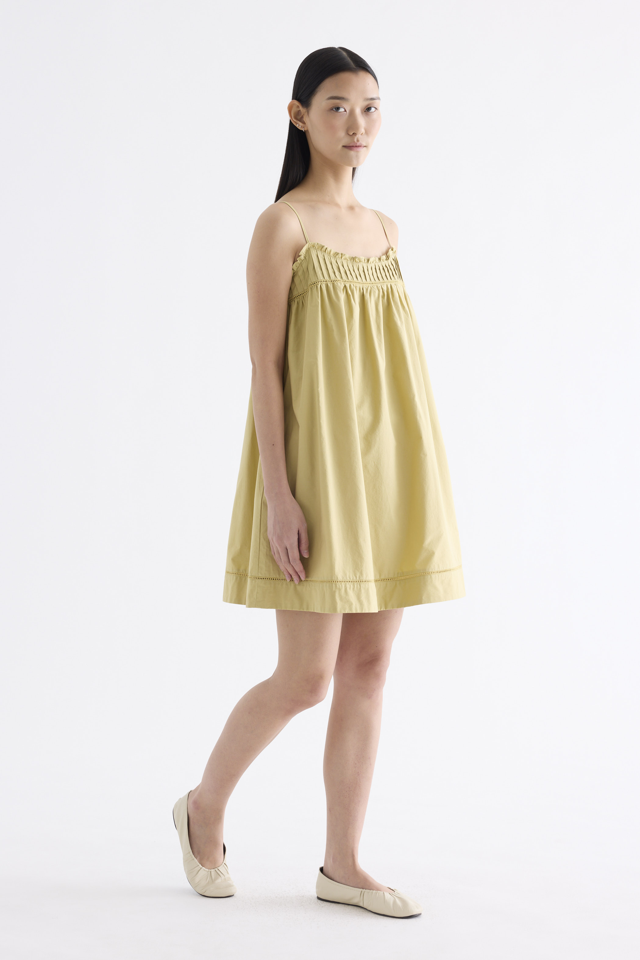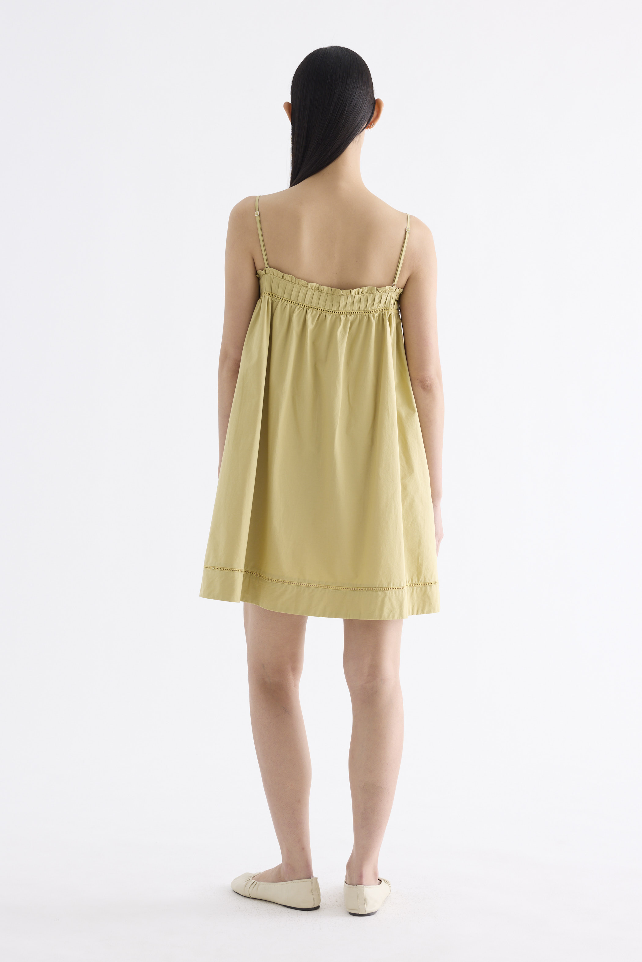 Cooler picks. Made from crisp and softly structured cotton, this sleeveless dress features an empire silhouette with slim adjustable shoulder straps, a frill-trimmed neckline, a pleated bust and lace detailing. Fits above the knee with a side zip closure.