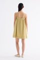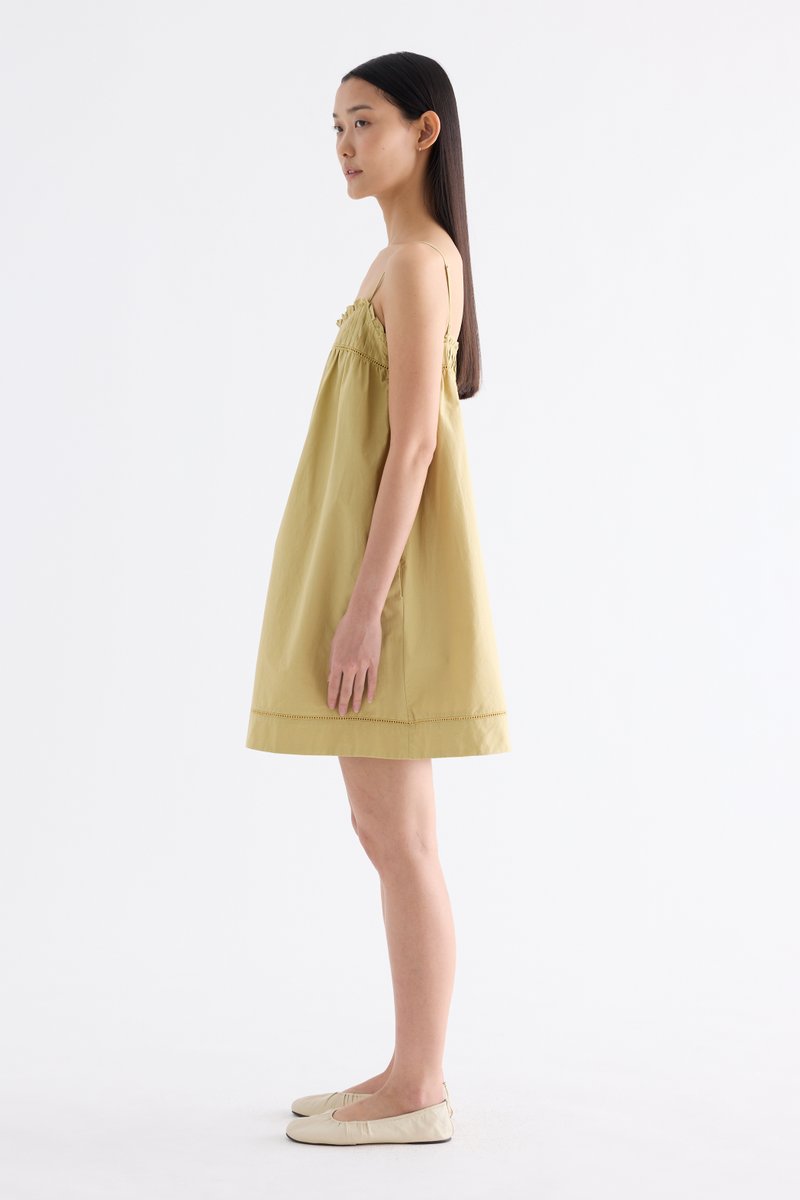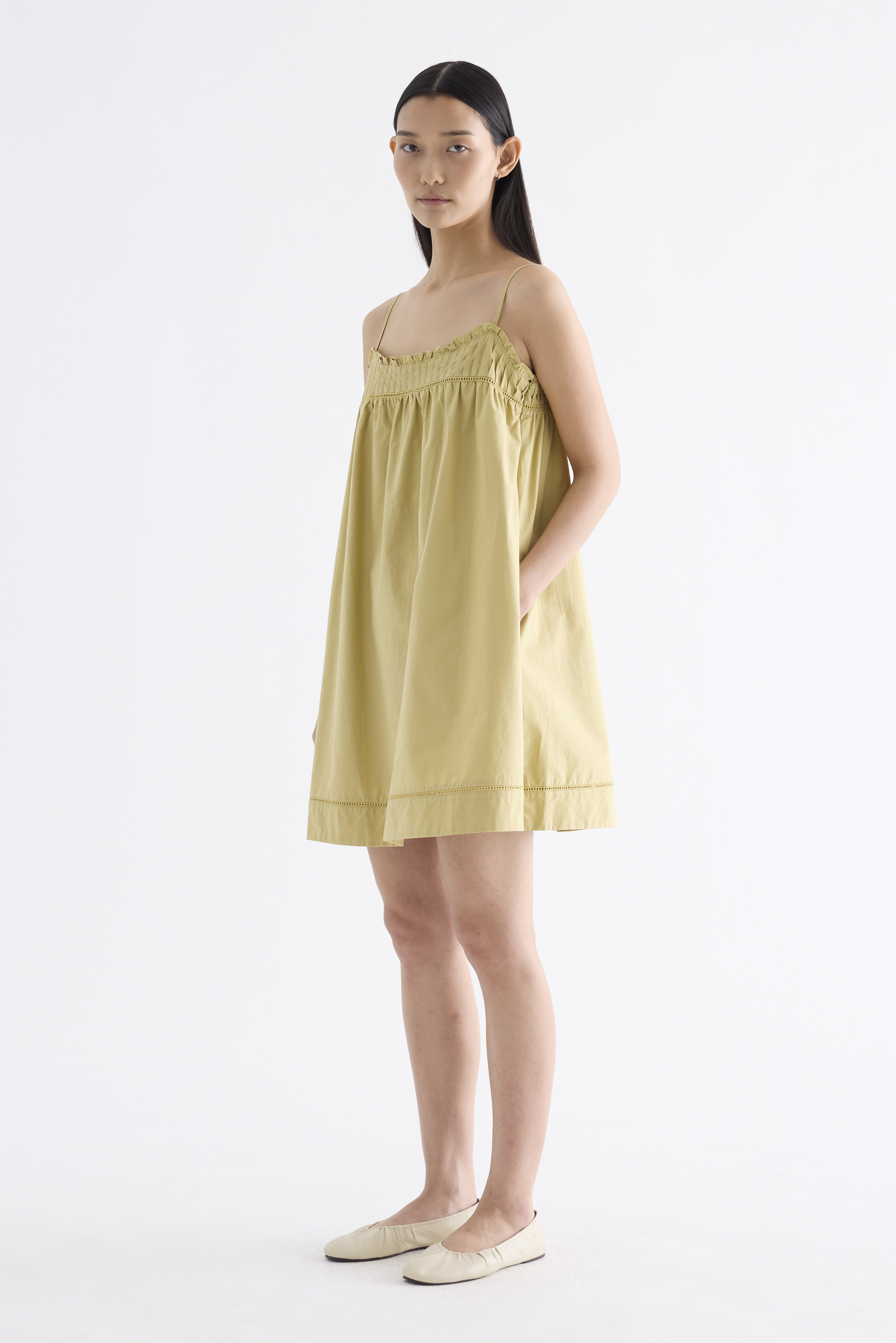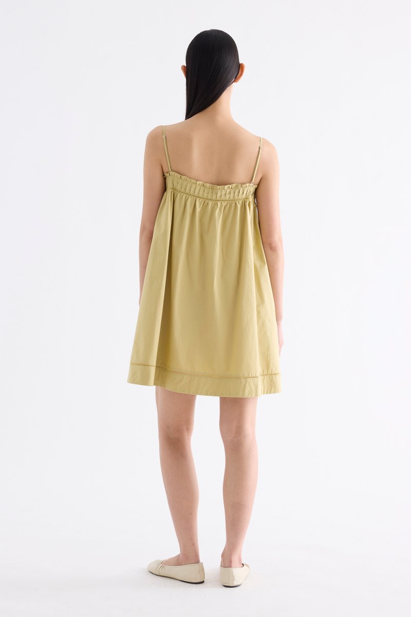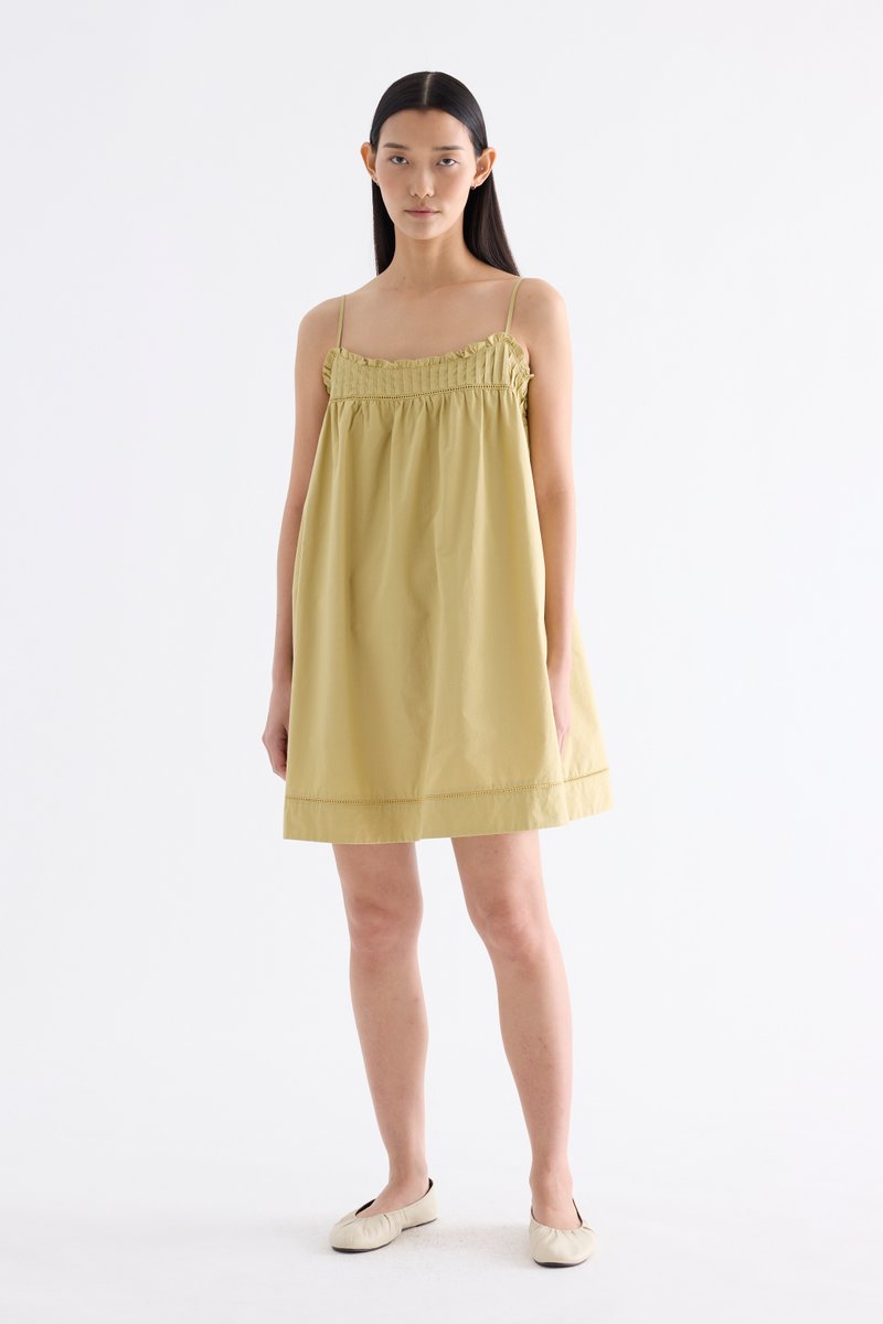 Cooler picks. Made from crisp and softly structured cotton, this sleeveless dress features an empire silhouette with slim adjustable shoulder straps, a frill-trimmed neckline, a pleated bust and lace detailing. Fits above the knee with a side zip closure.