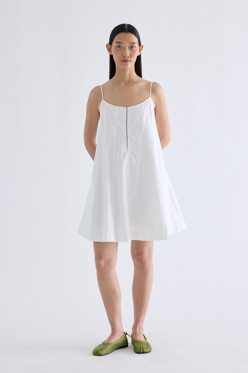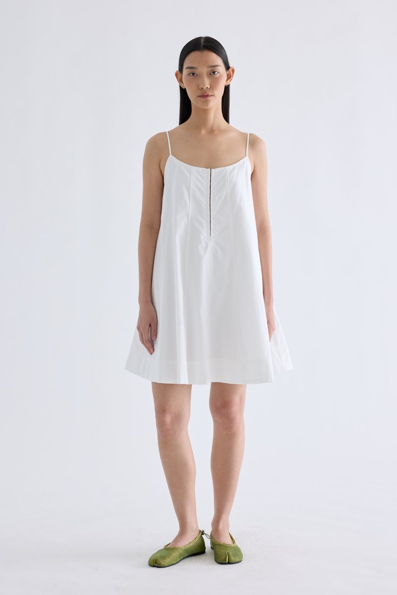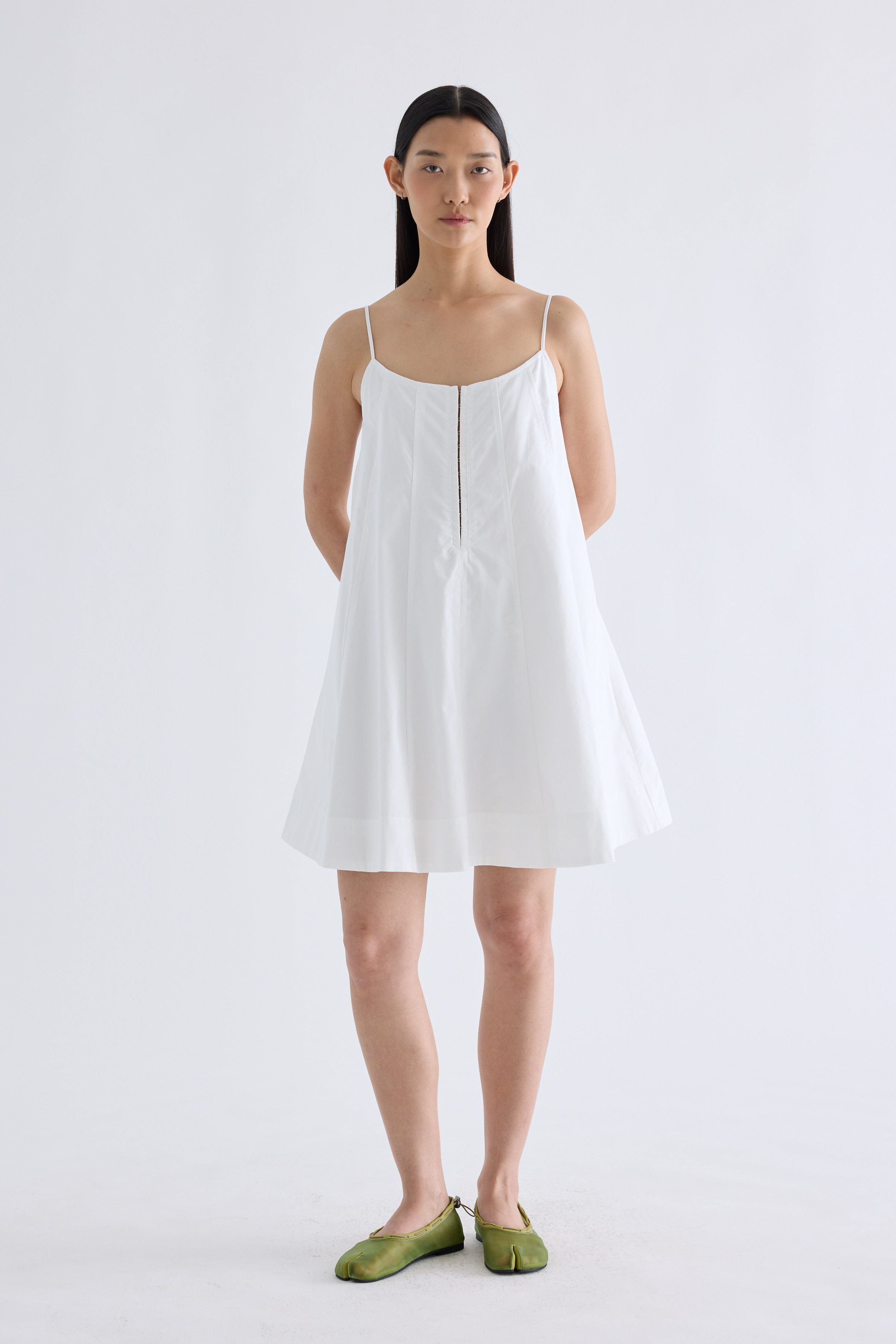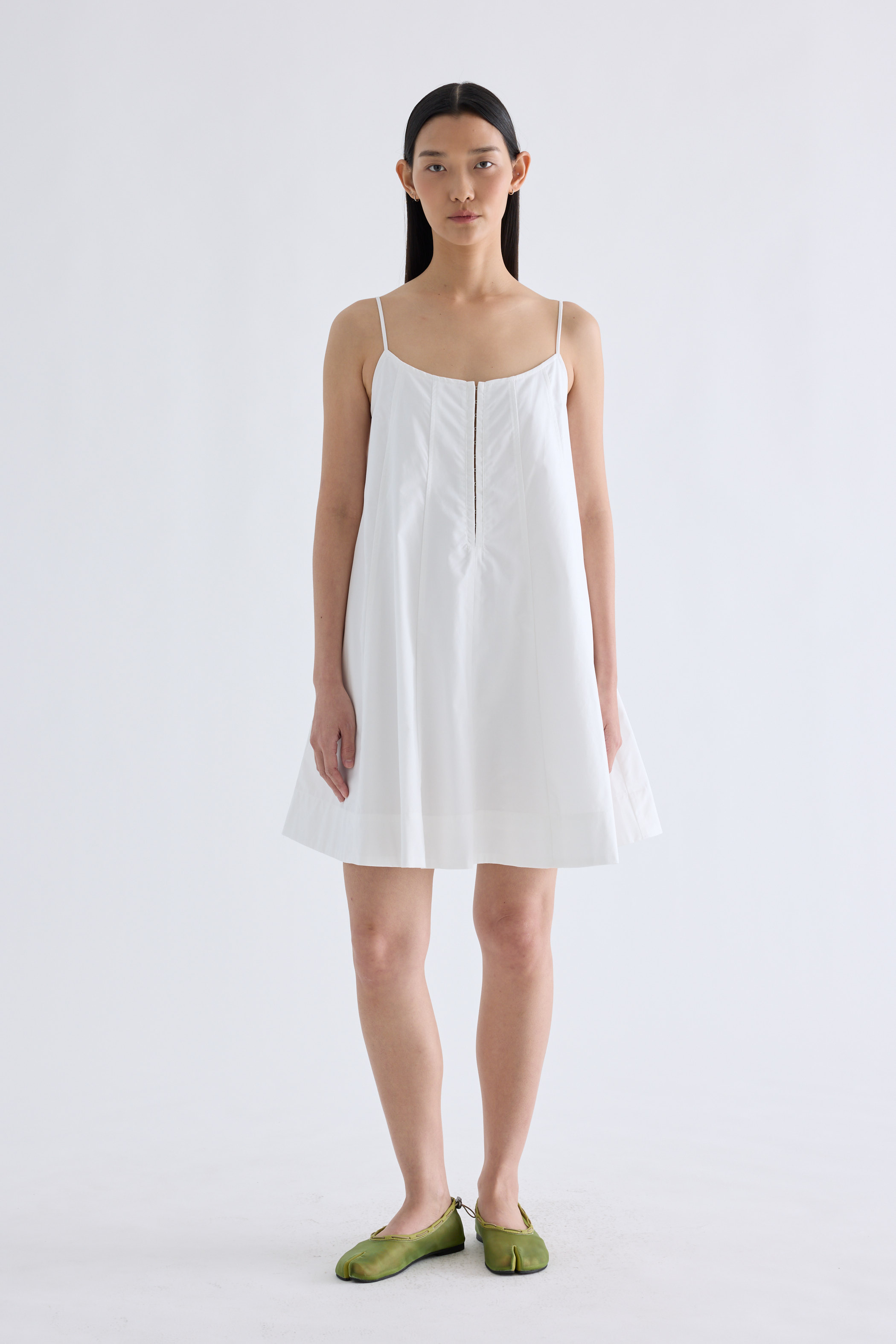 Go with the flow. Made from crisp and softly structured cotton, this sleeveless dress features a flared, panelled silhouette with front hook-and-eye closures, slim adjustable shoulder straps, a straight neckline and a back zip closure. Fits relaxed and above the knee.