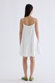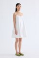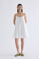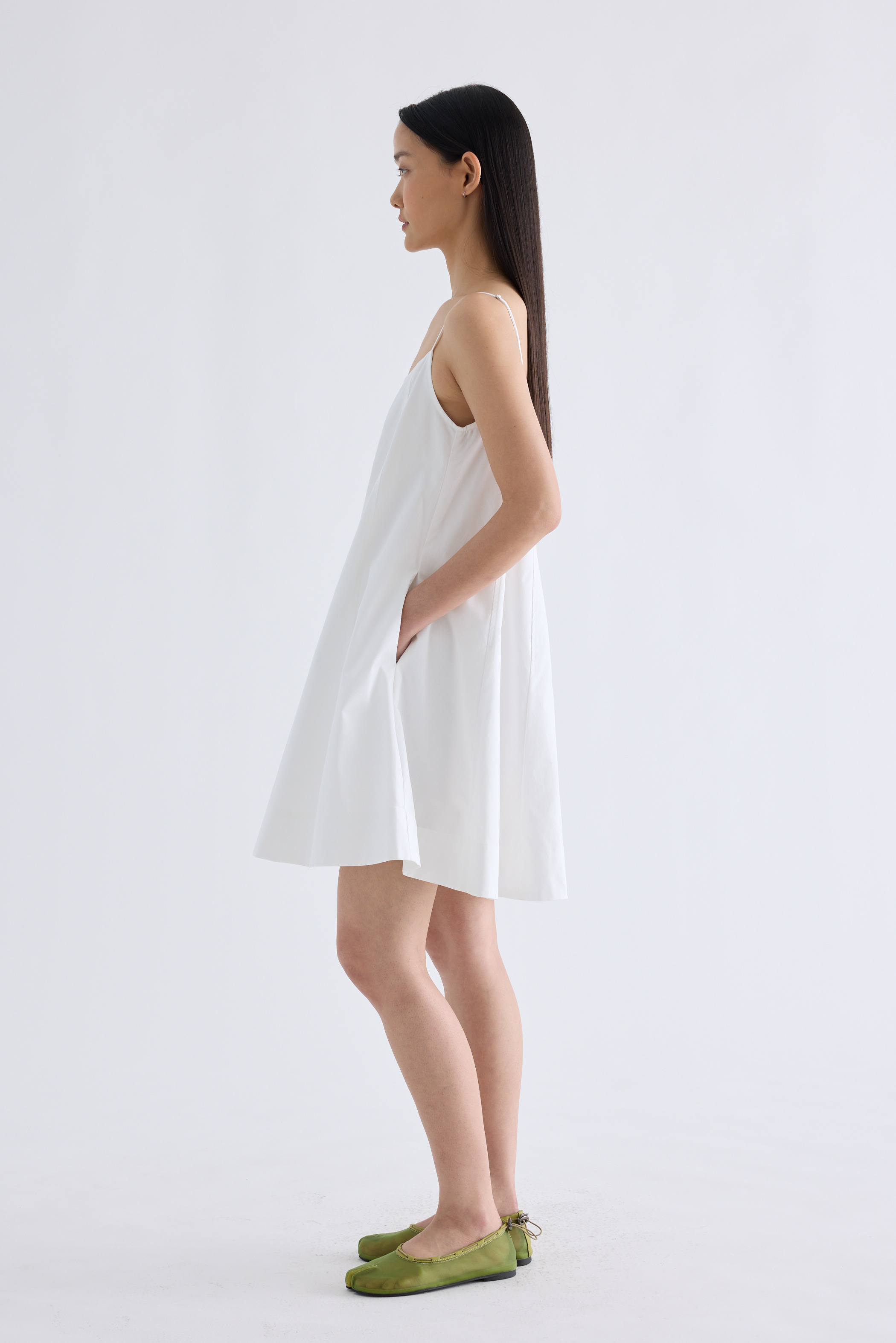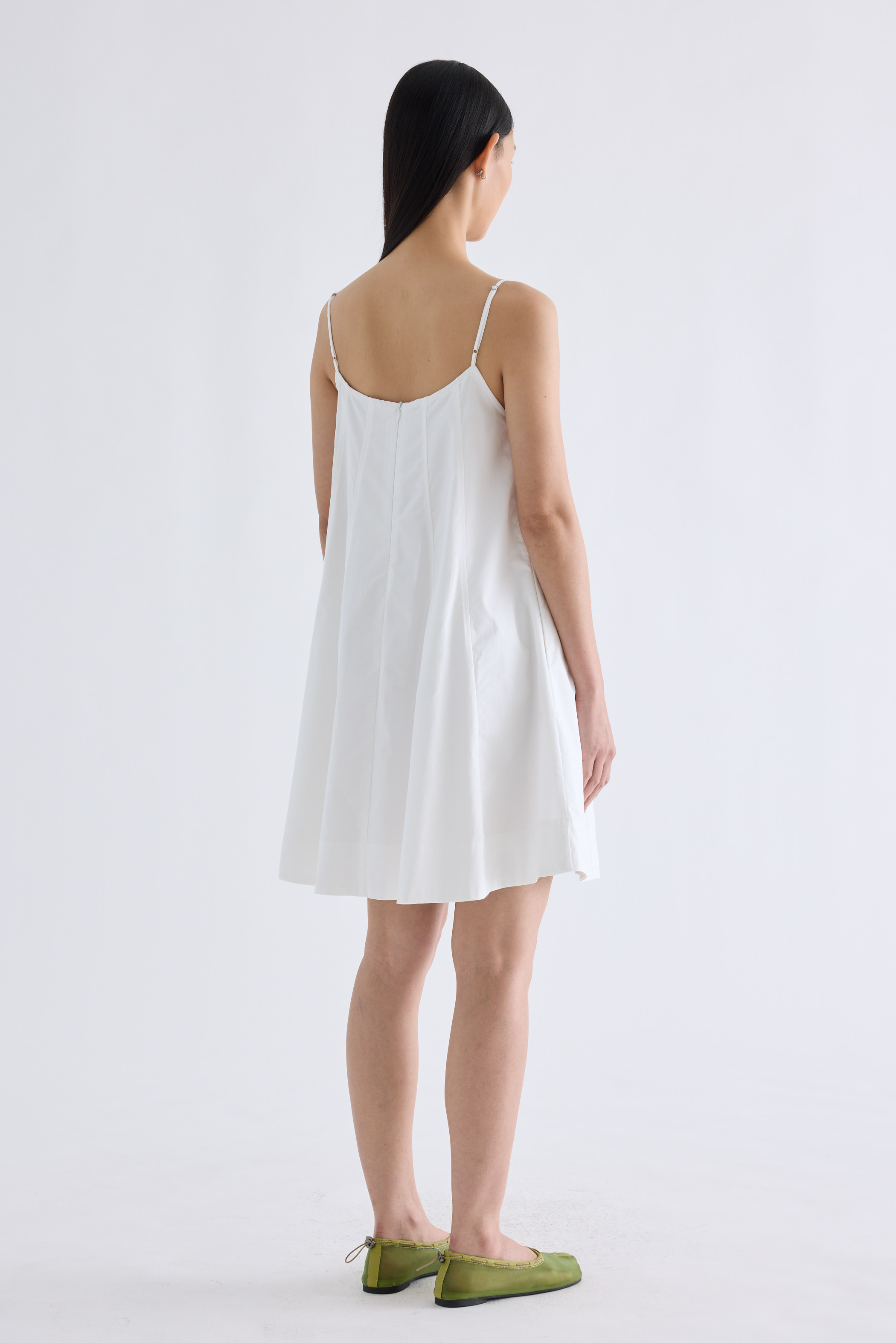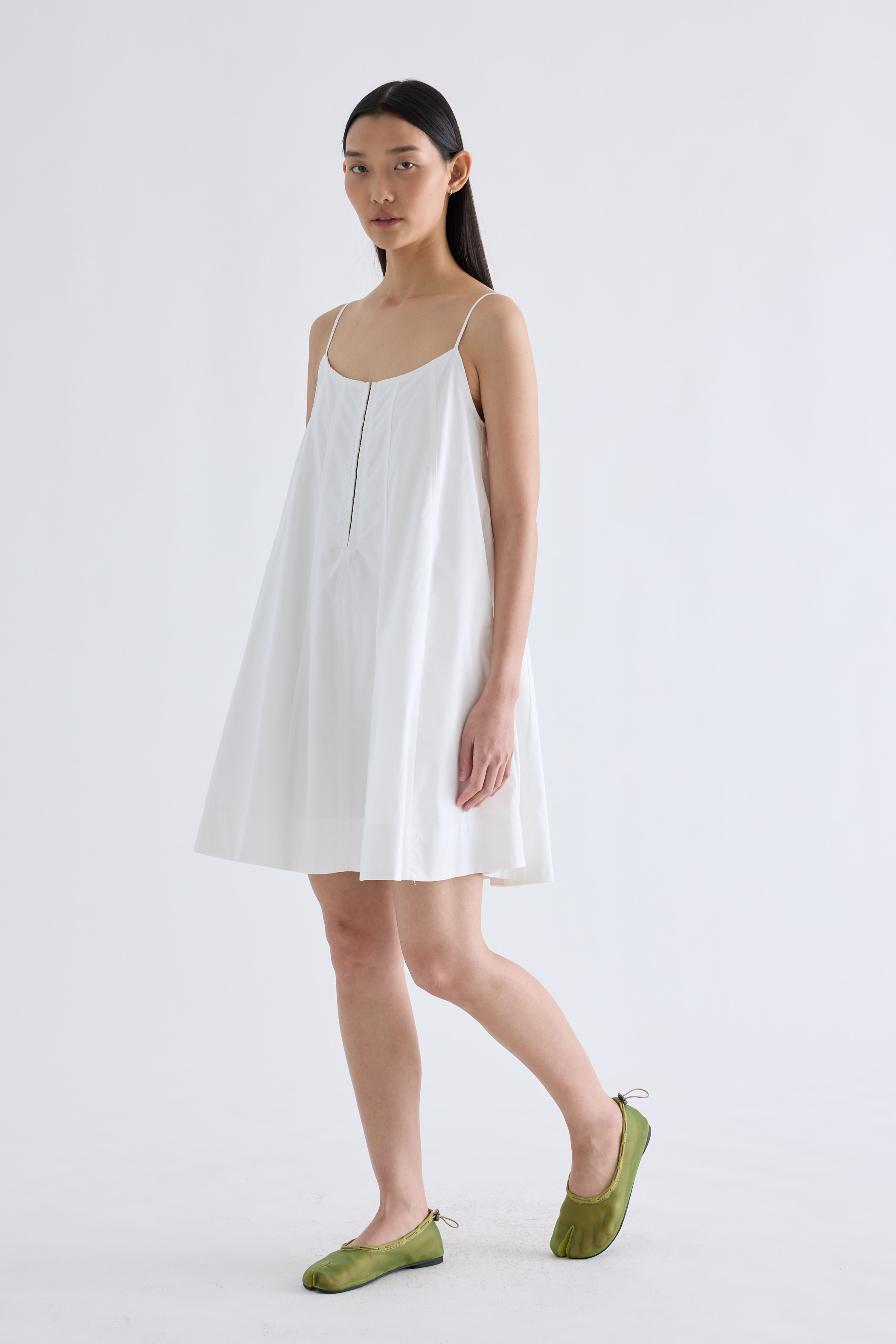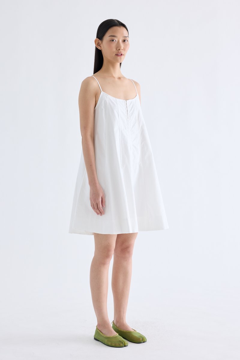 Go with the flow. Made from crisp and softly structured cotton, this sleeveless dress features a flared, panelled silhouette with front hook-and-eye closures, slim adjustable shoulder straps, a straight neckline and a back zip closure. Fits relaxed and above the knee.