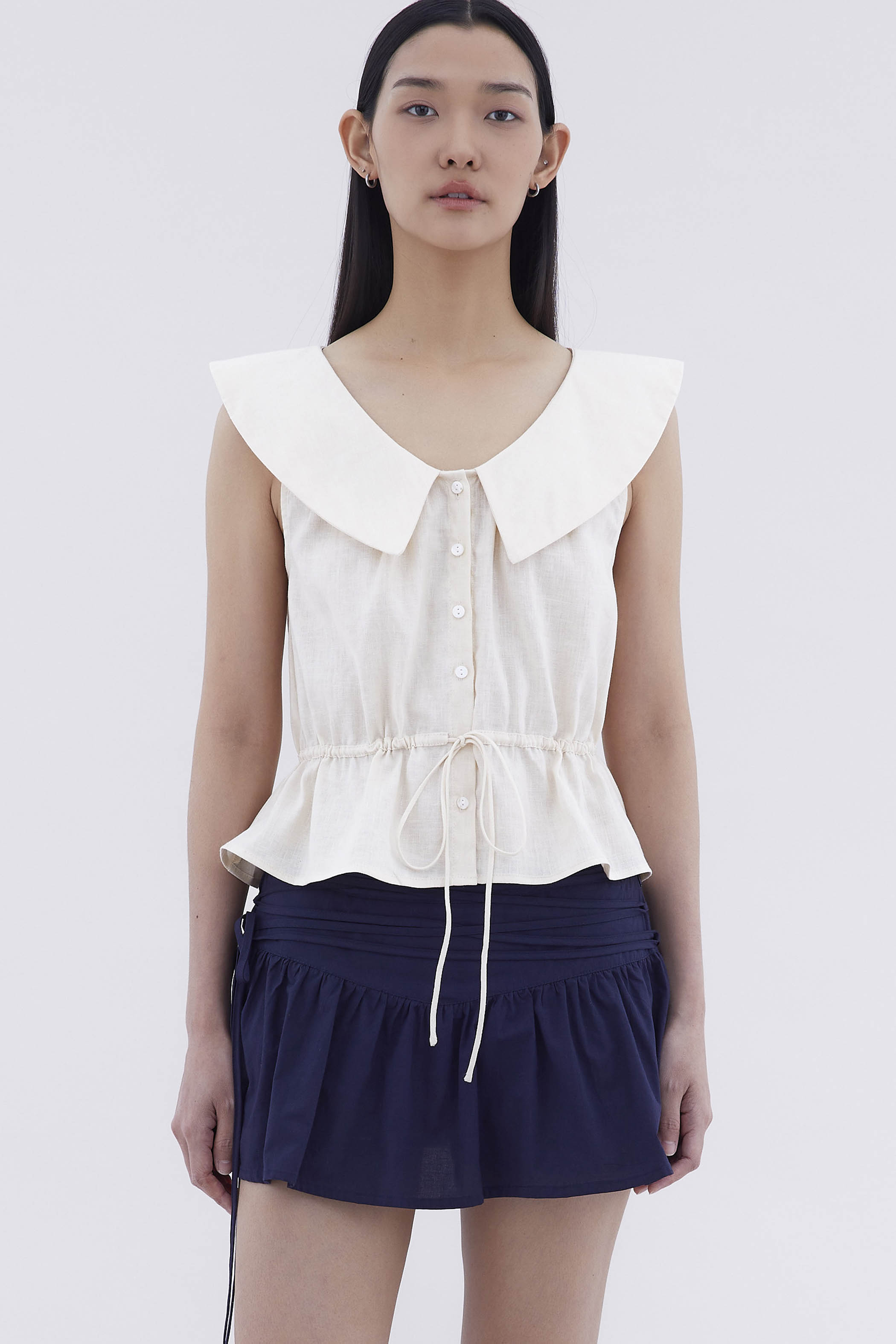 Go big or go home. Cut from airy and gently tailored 100% linen, this sleeveless top features oversized collars, a round neckline, a button-down front and an adjustable drawstring waist-tie. Worn in a slim fit.