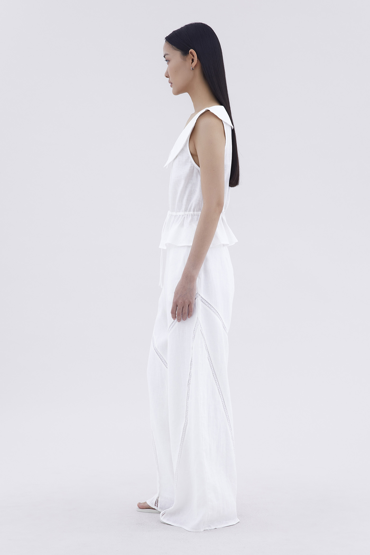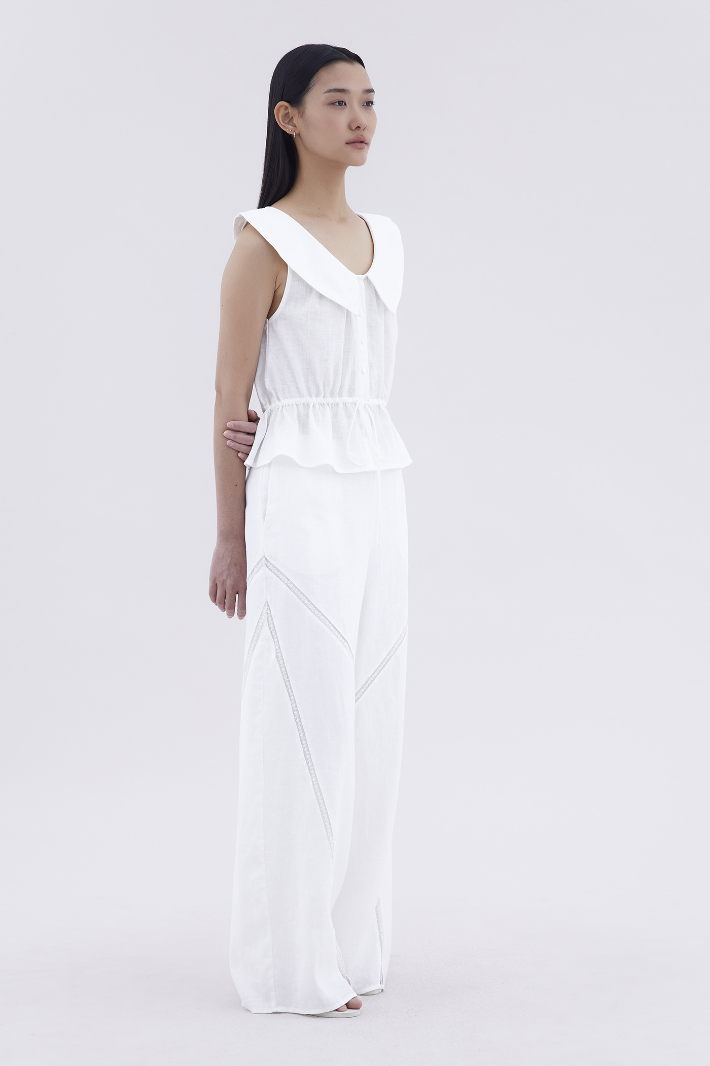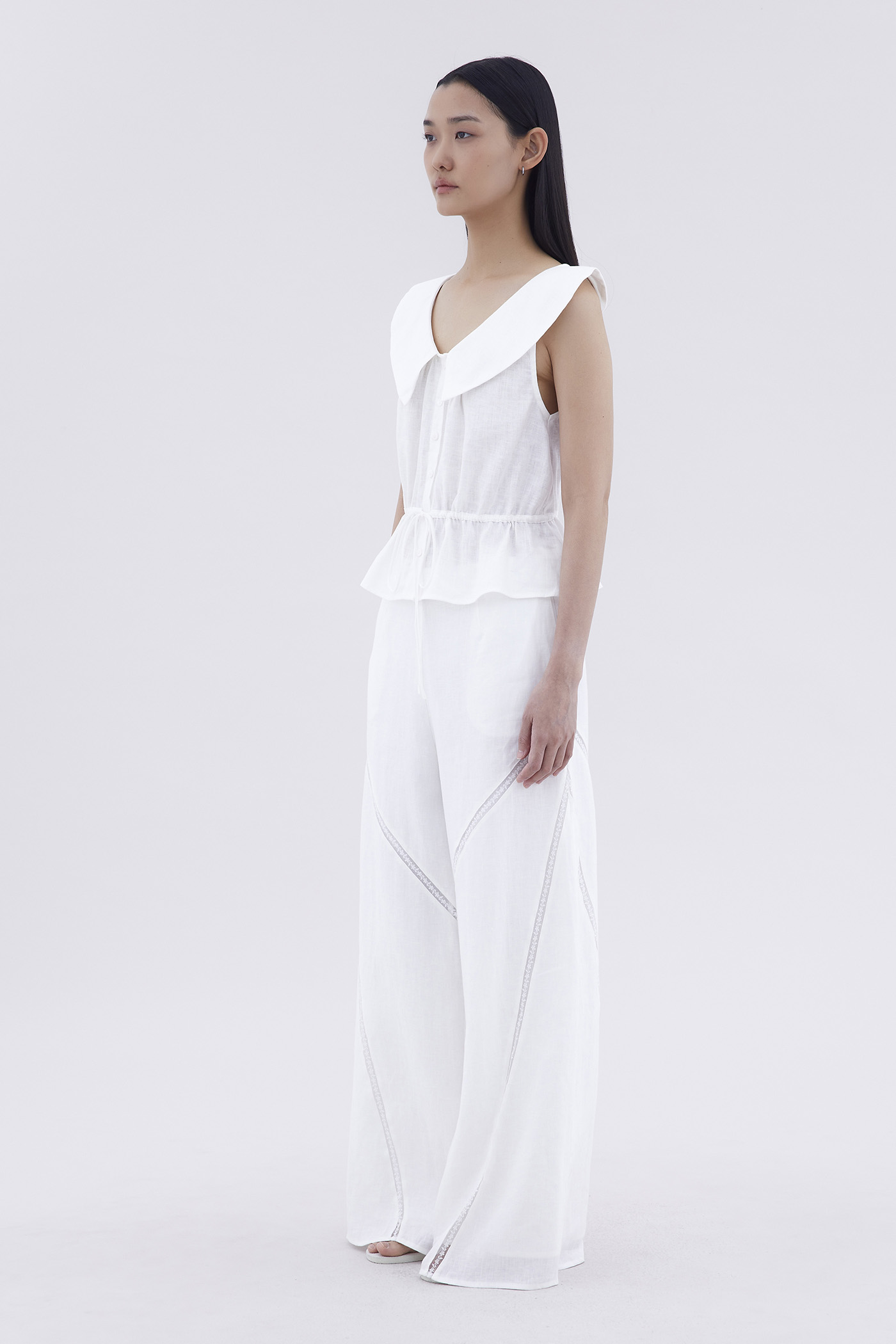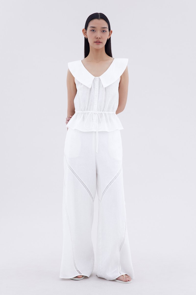 Go big or go home. Cut from airy and gently tailored 100% linen, this sleeveless top features oversized collars, a round neckline, a button-down front and an adjustable drawstring waist-tie. Worn in a slim fit.