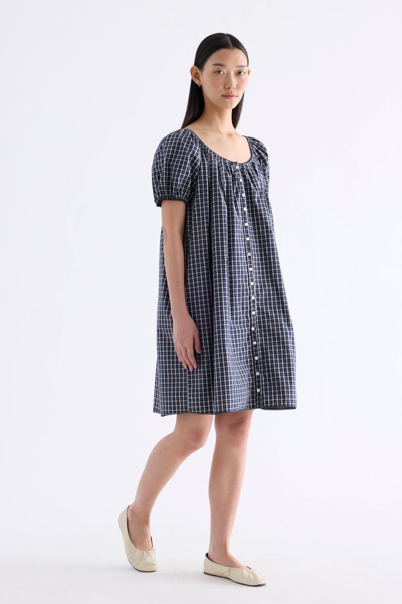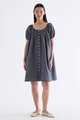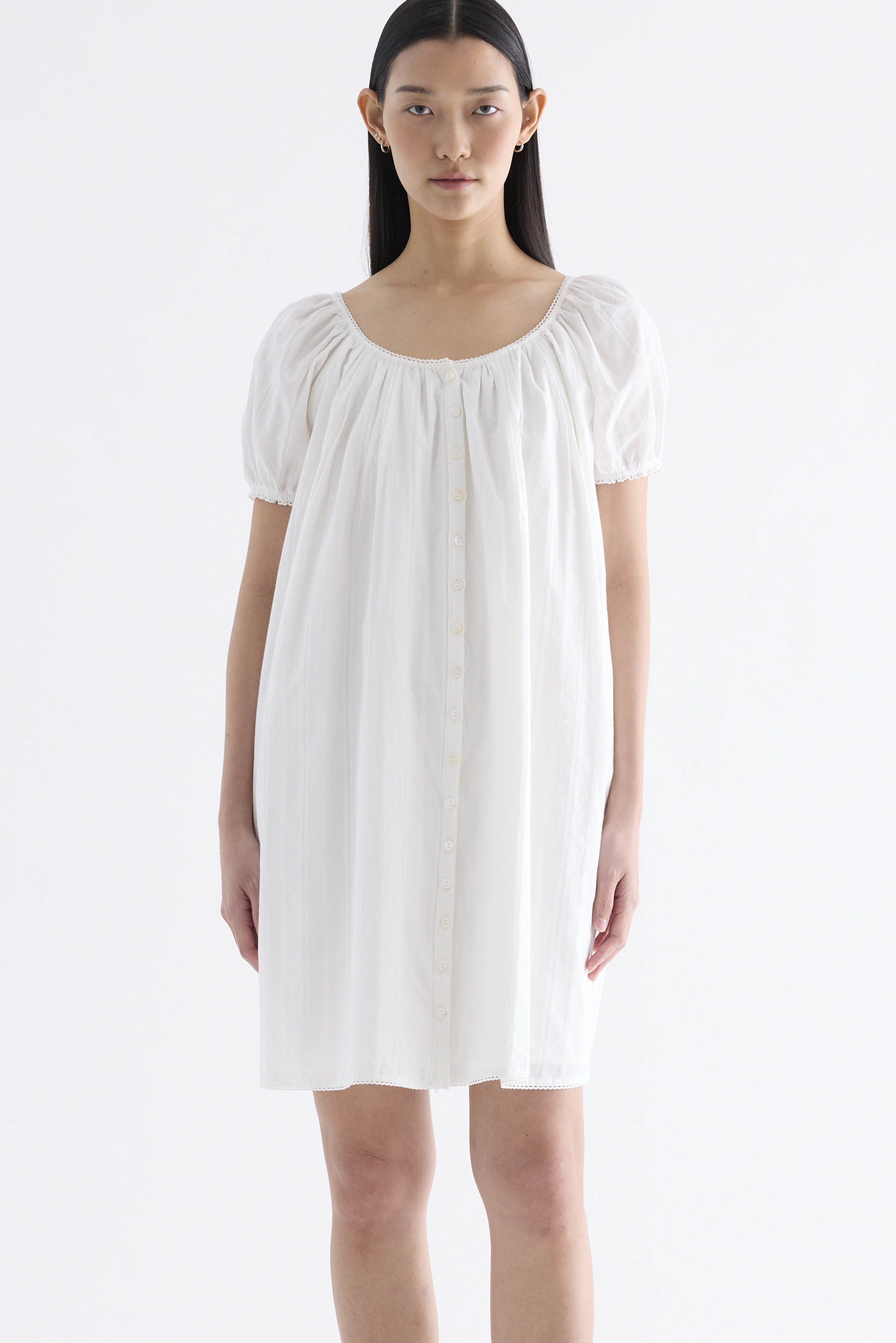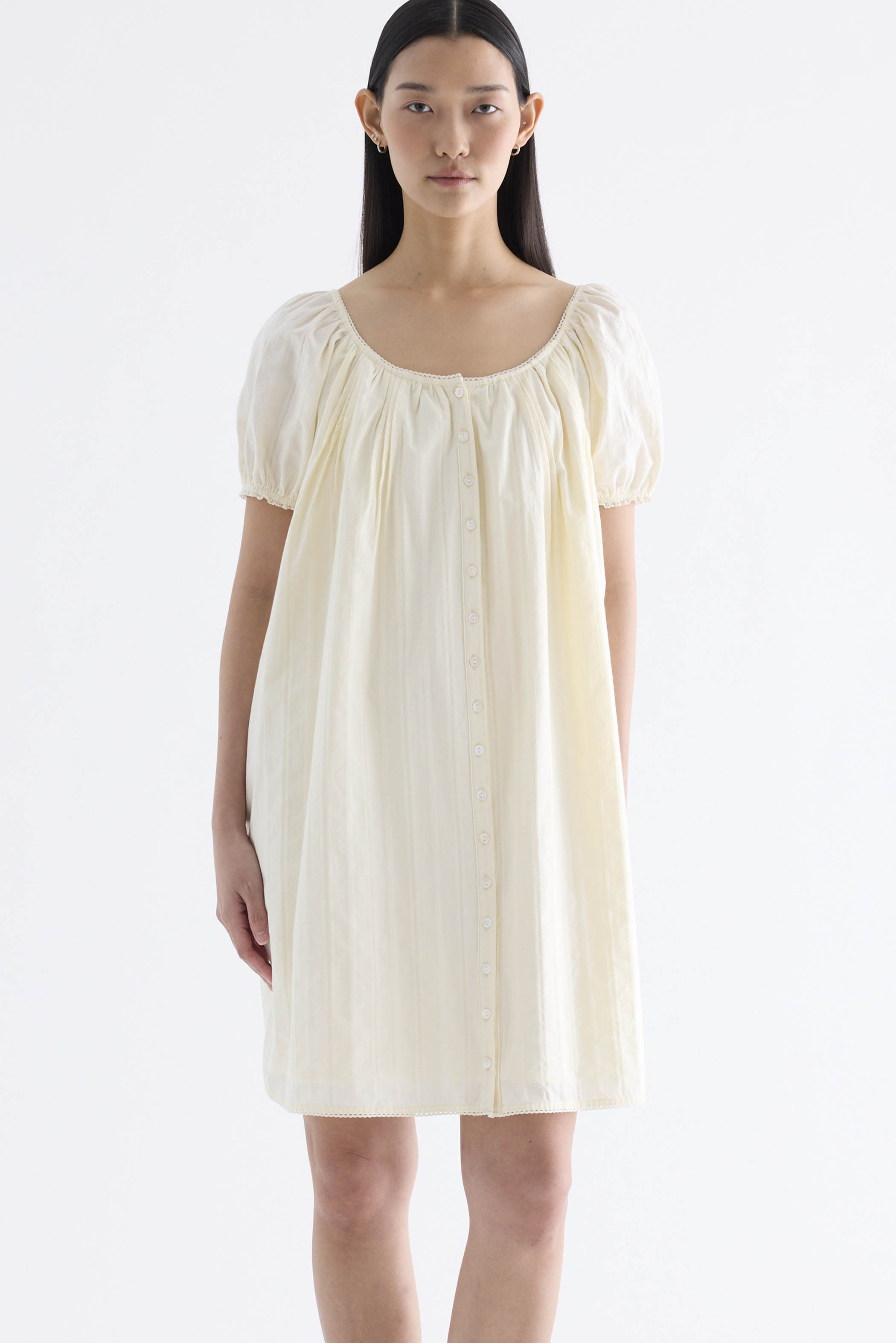 Free and easy. Made from airy and softly structured cotton, this dress features a wide lace-trimmed neckline, short puffy sleeves with elasticated lace-trimmed cuffs and a button-down front. Fits relaxed and above the knee.
