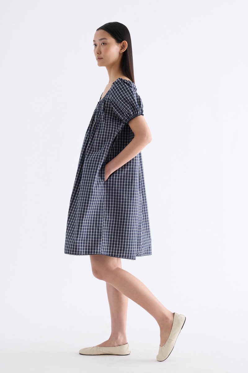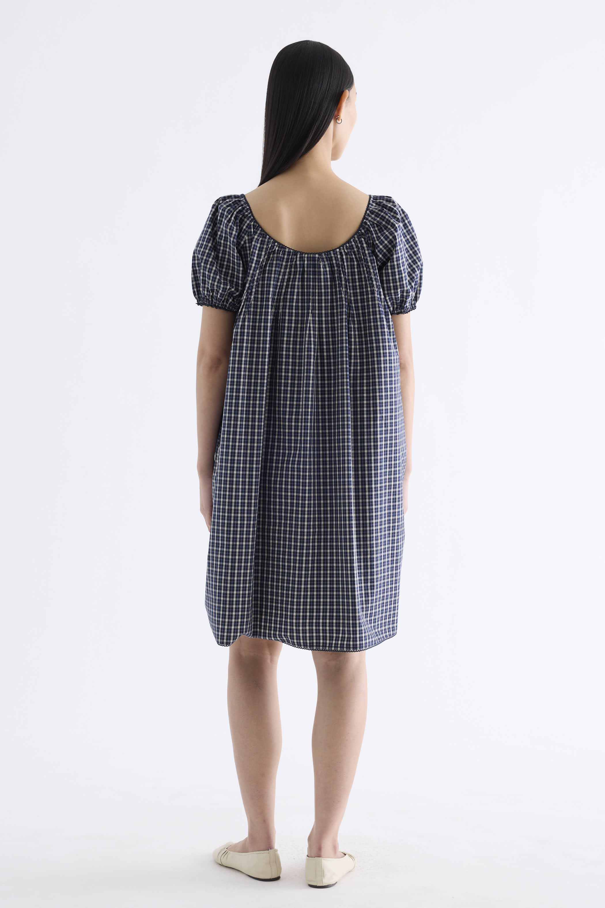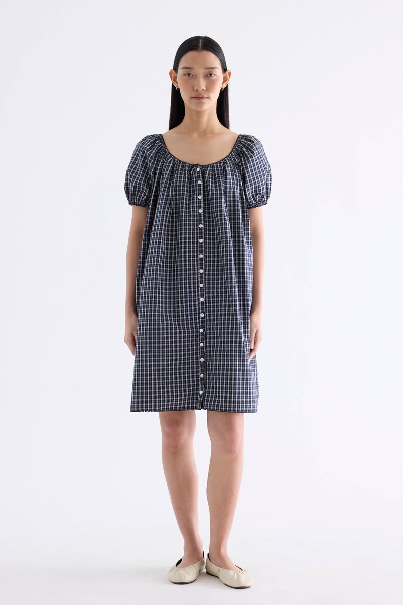 Free and easy. Made from airy and softly structured cotton, this dress features a wide lace-trimmed neckline, short puffy sleeves with elasticated lace-trimmed cuffs and a button-down front. Fits relaxed and above the knee.