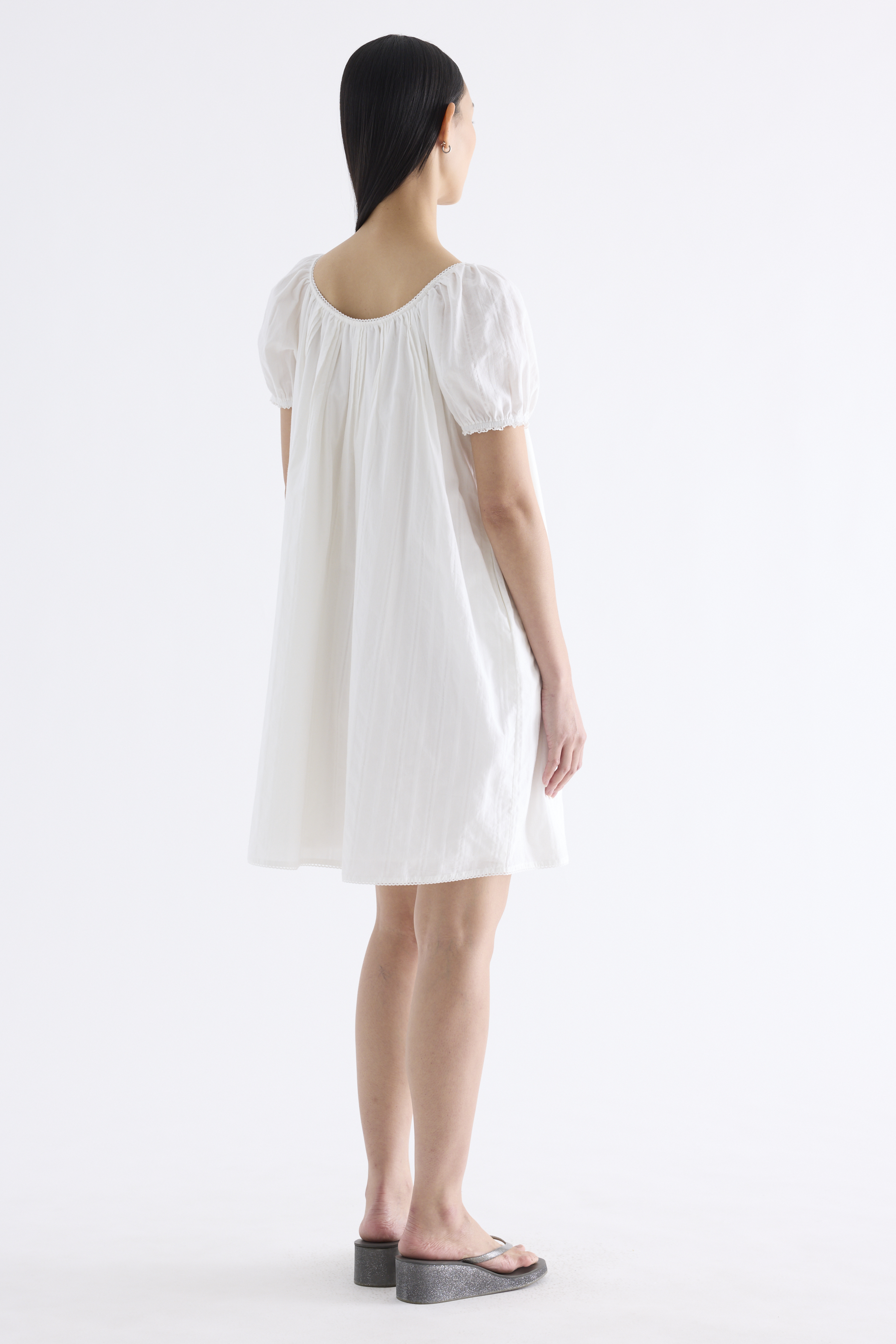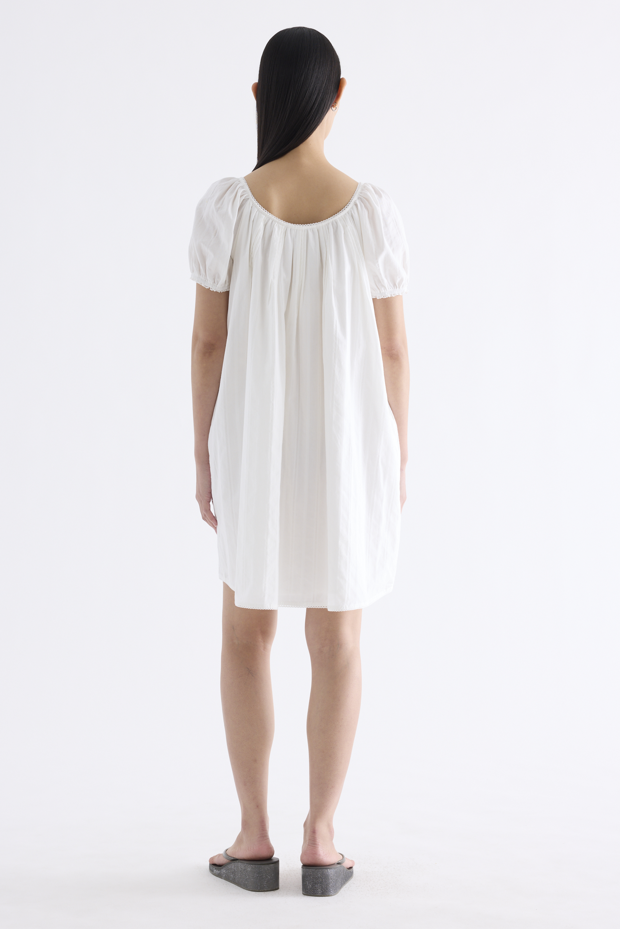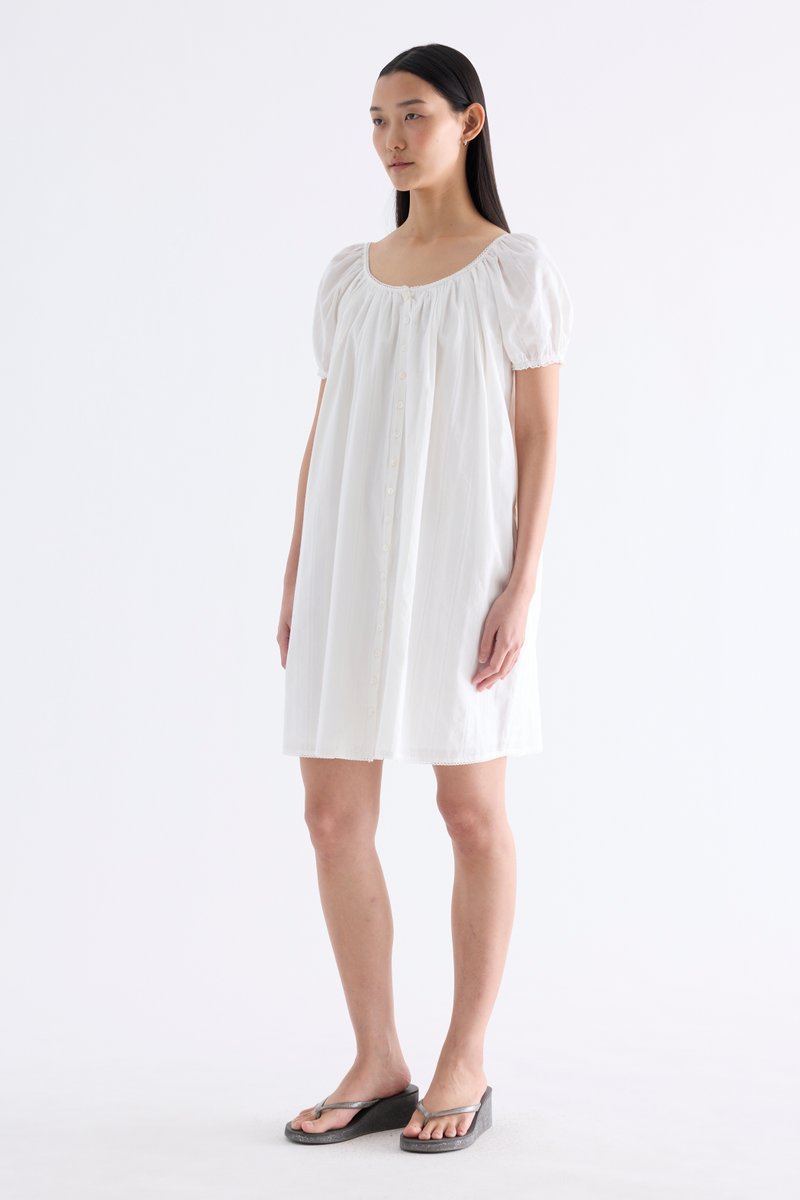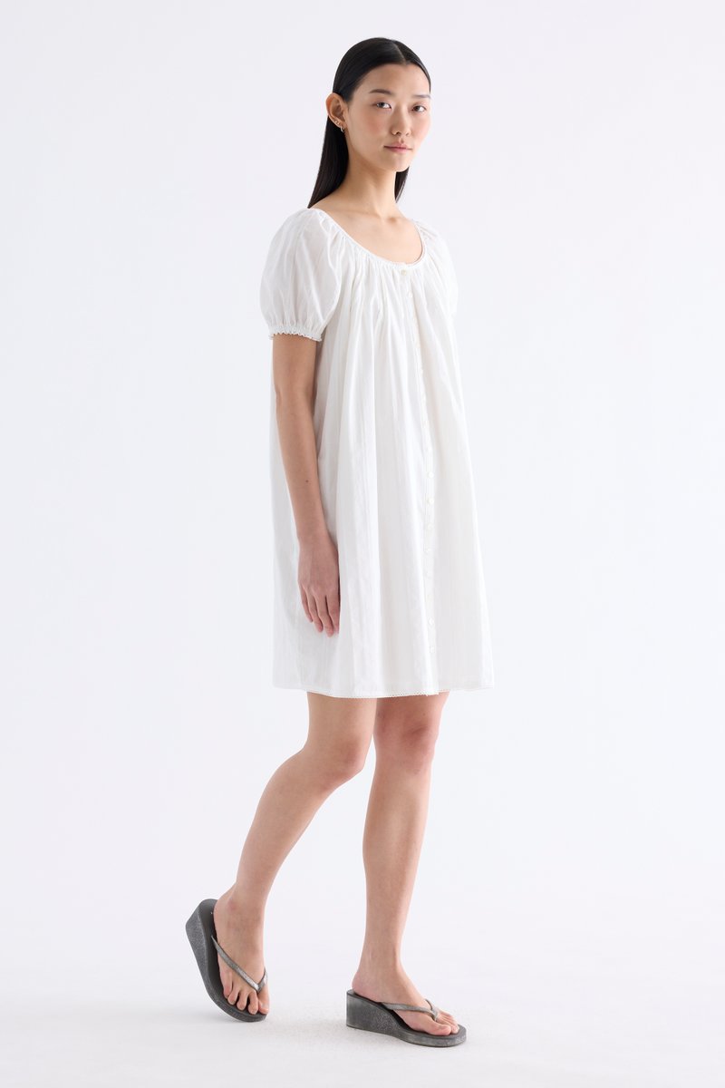 Free and easy. Made from airy and softly structured cotton, this dress features a wide lace-trimmed neckline, short puffy sleeves with elasticated lace-trimmed cuffs and a button-down front. Fits relaxed and above the knee.