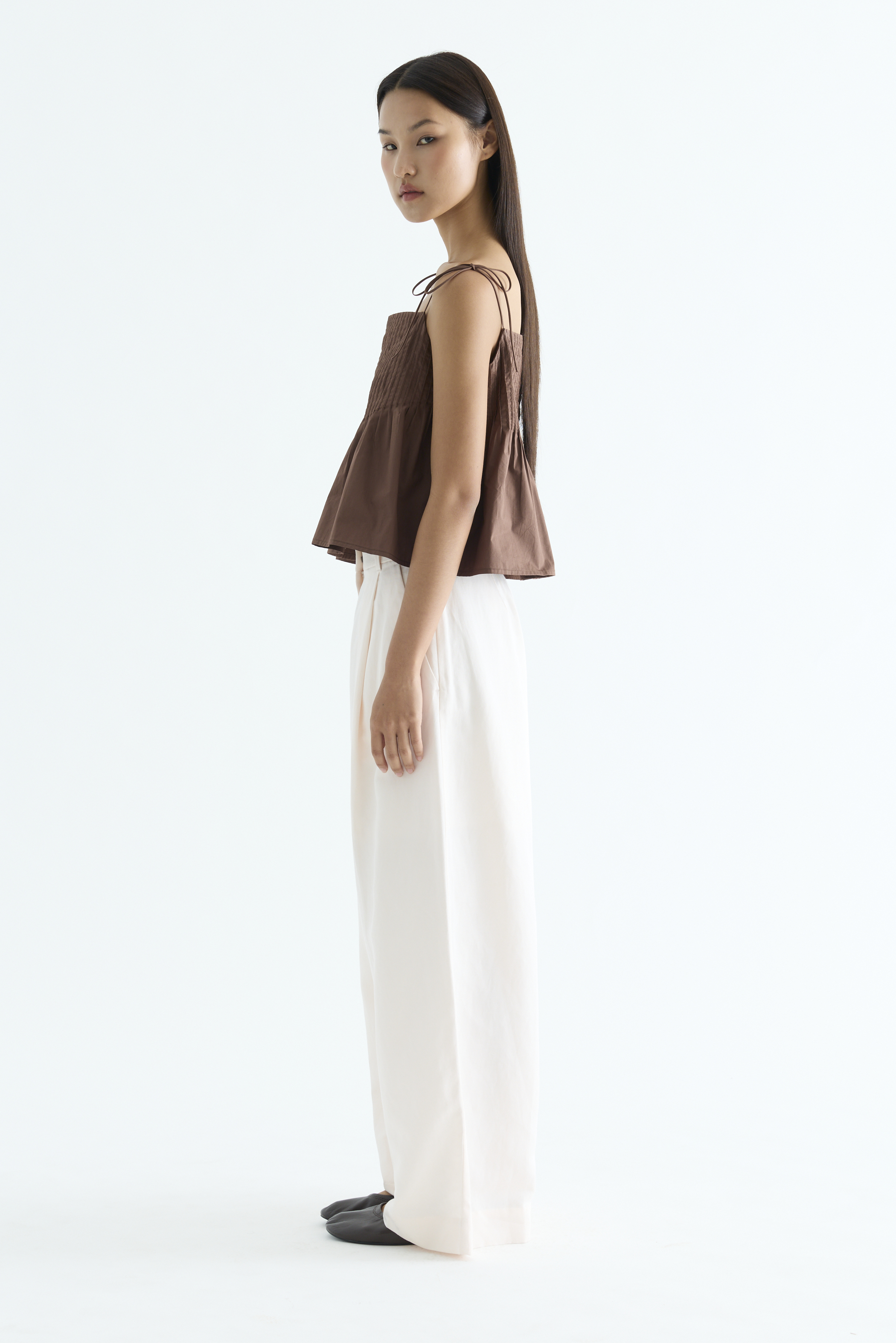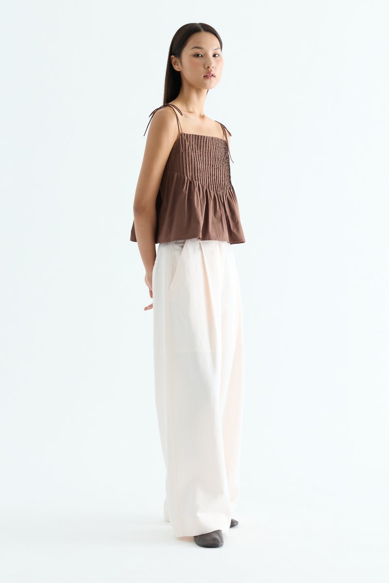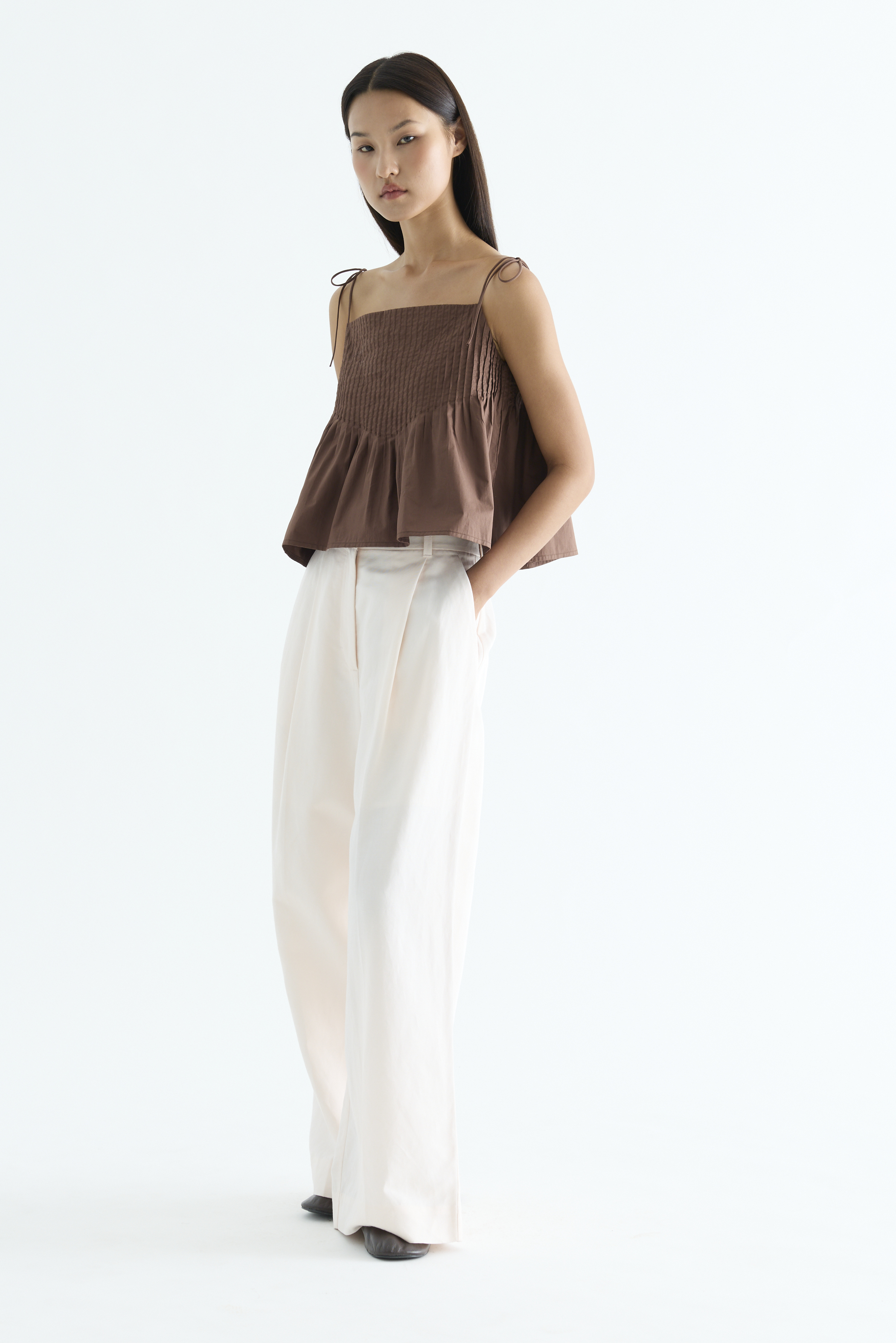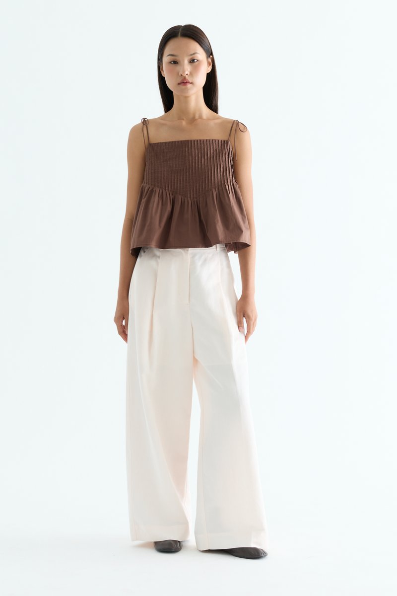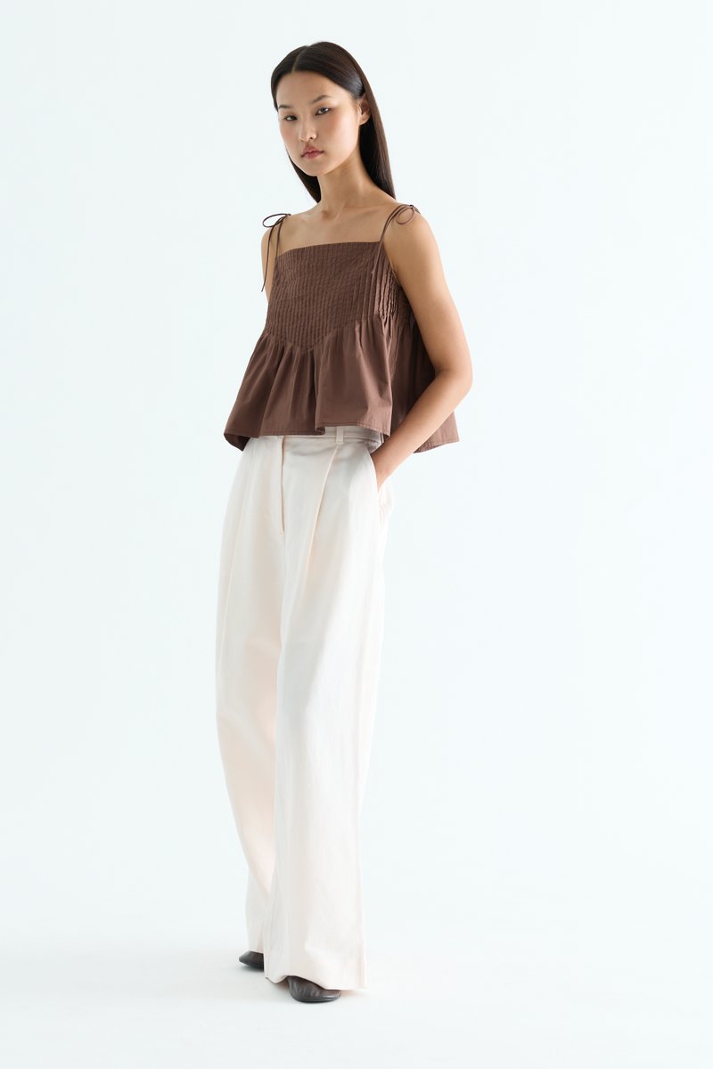 Tactile. Made from light and crisp cotton, this sleeveless top features pin-tuck pleats, a straight neckline and slim self-tying shoulder straps. Worn in a relaxed fit.