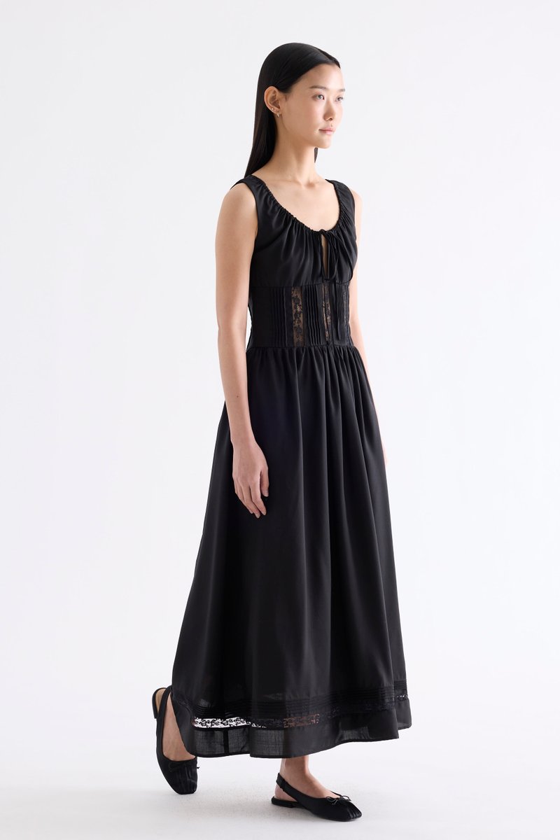 Occasion worthy. Made from smooth and non-stretch Tencel, this sleeveless maxi dress features a round drawstring neckline, front slit with a tie-strap closure, waist panel with lace panels and pin-tuck pleats, as well as a side zip closure. Worn in an A-line silhouette that flows out at the waist into a relaxed skirt.