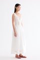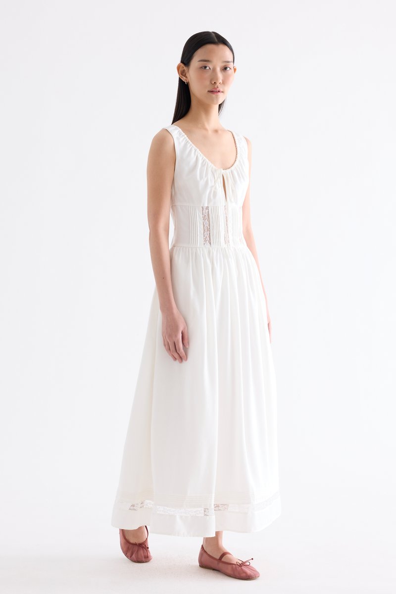 Occasion worthy. Made from smooth and non-stretch Tencel, this sleeveless maxi dress features a round drawstring neckline, front slit with a tie-strap closure, waist panel with lace panels and pin-tuck pleats, as well as a side zip closure. Worn in an A-line silhouette that flows out at the waist into a relaxed skirt.