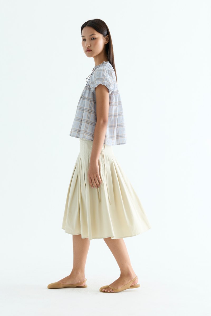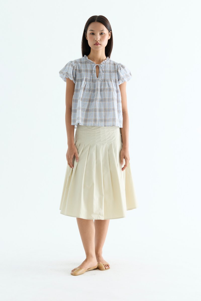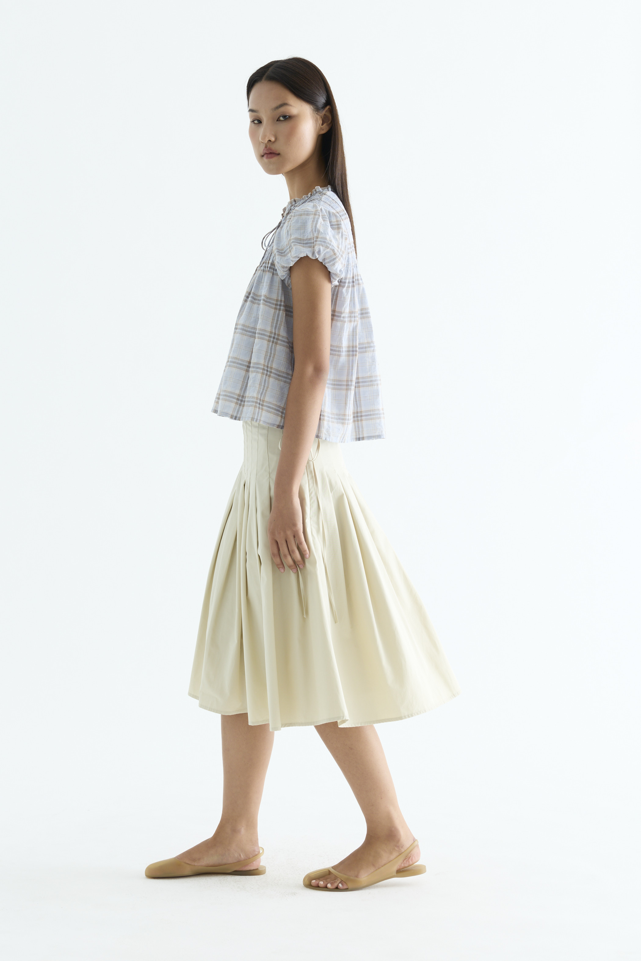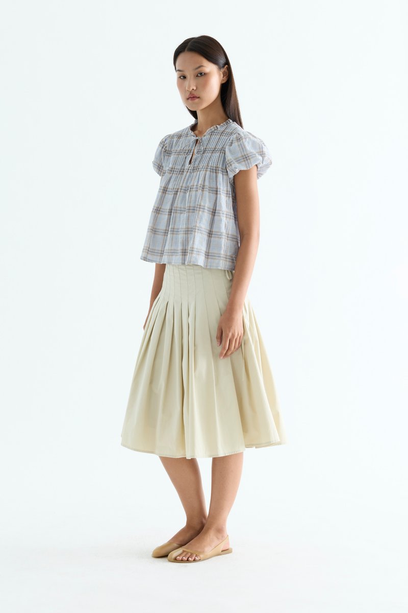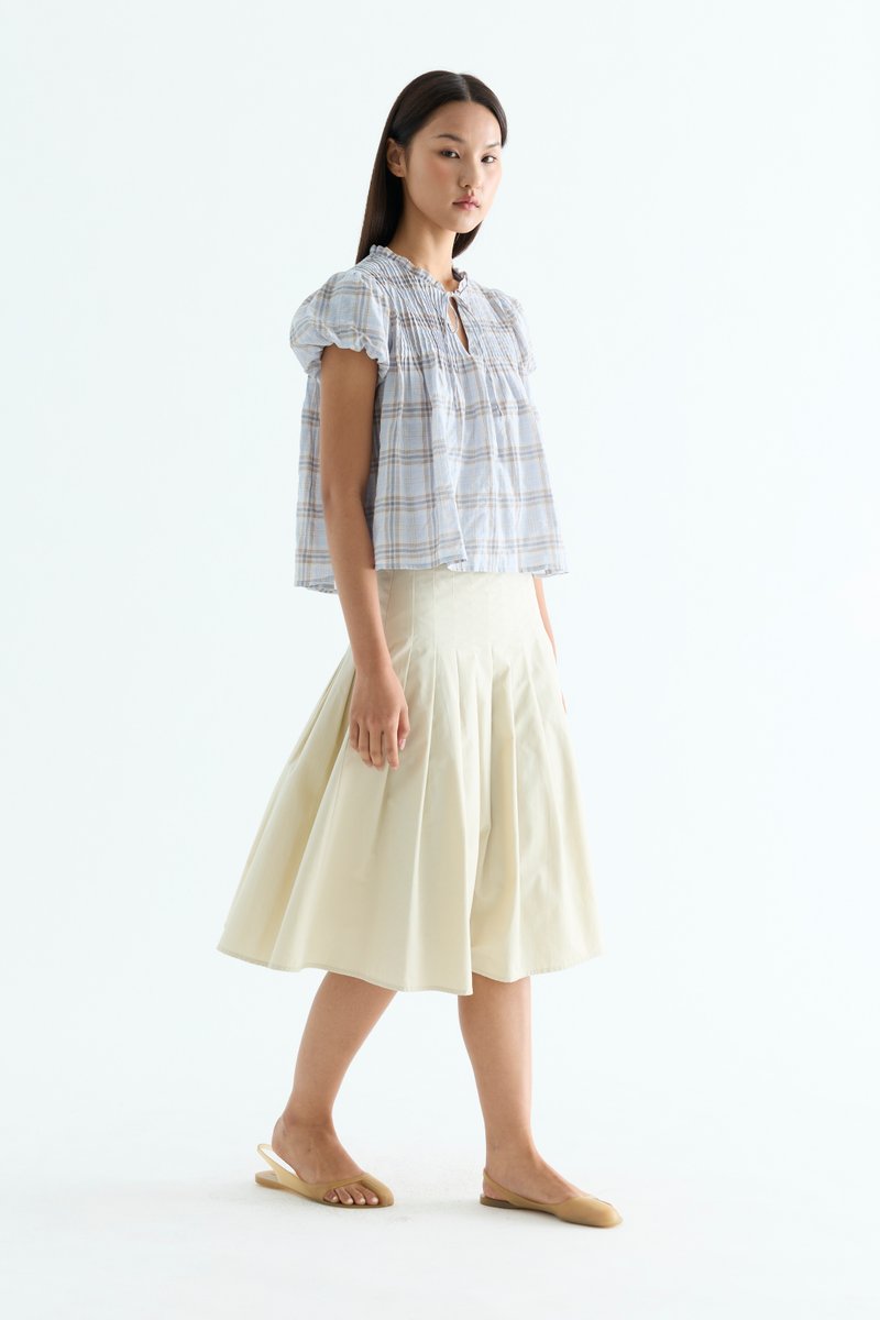 Here for the flare. Cut from crisp and softly structured cotton, this top features a frill-trimmed neckline, front opening with tie-strap, pin-tuck pleats and elasticated puffy sleeves. Worn in a relaxed swing silhouette.