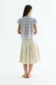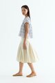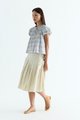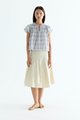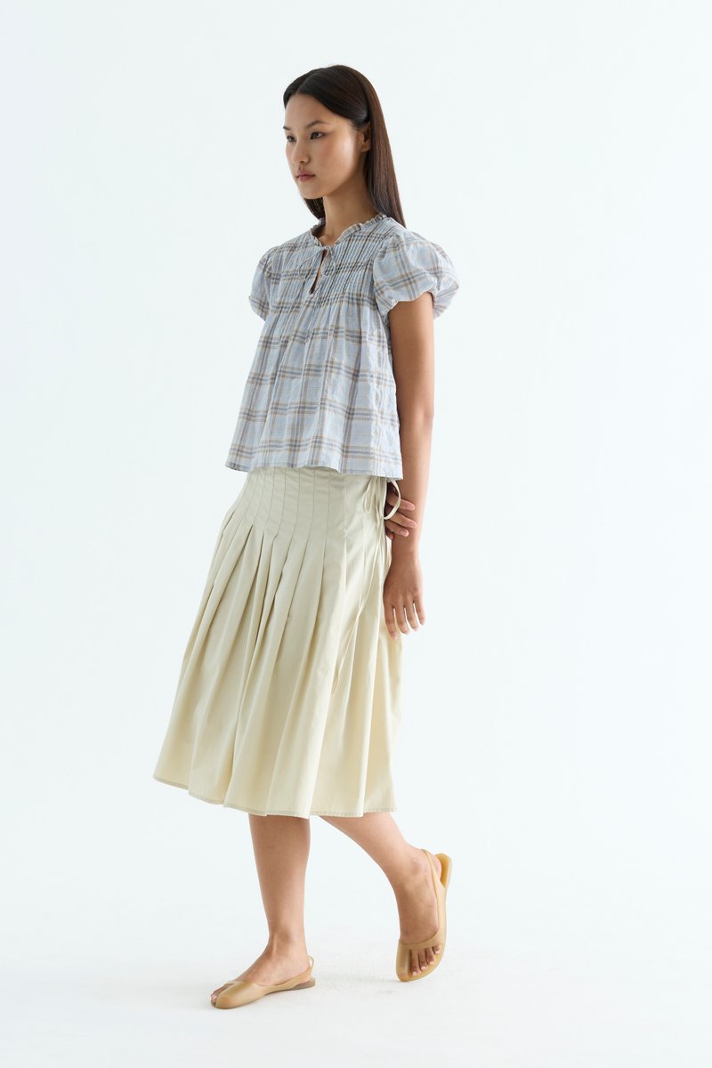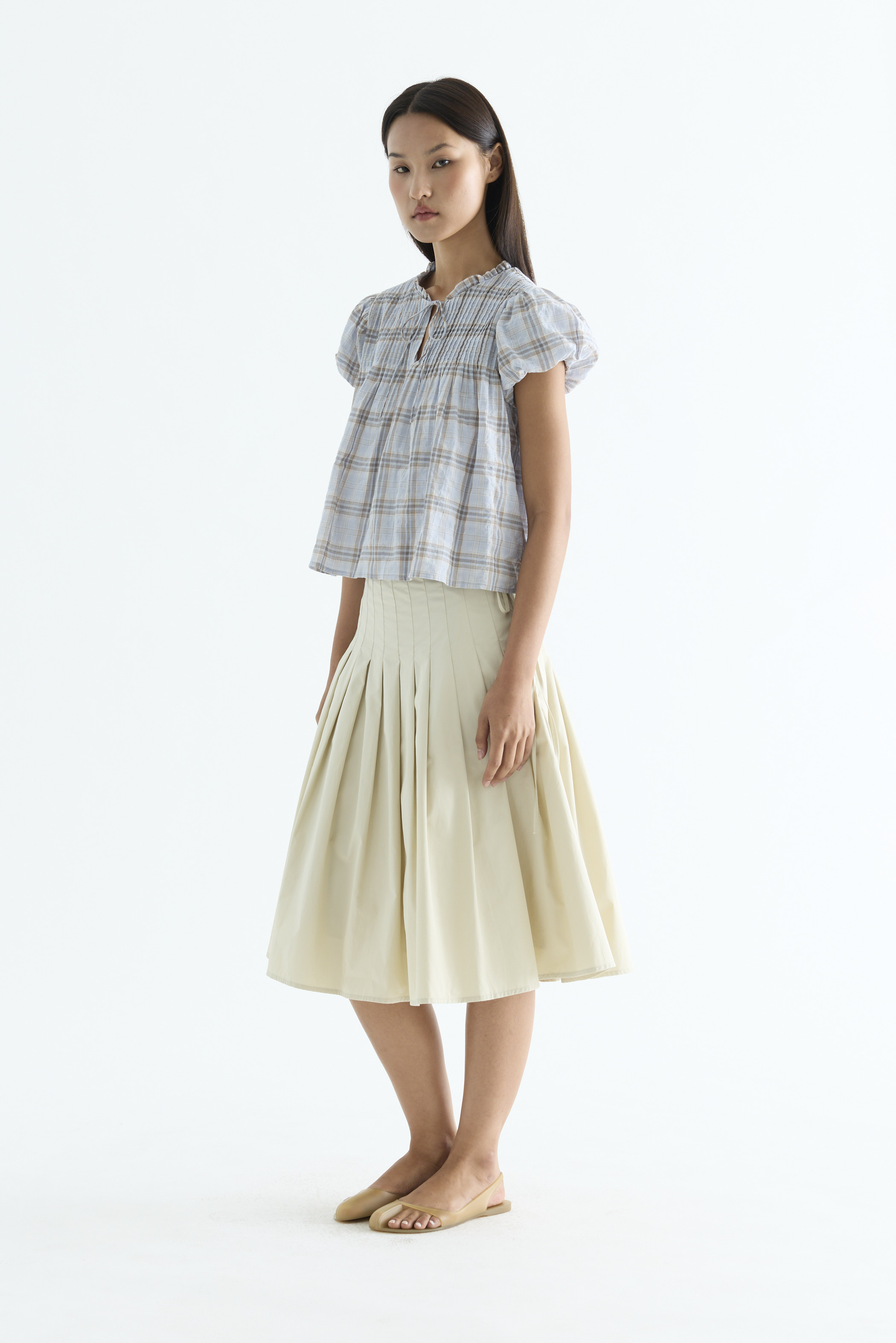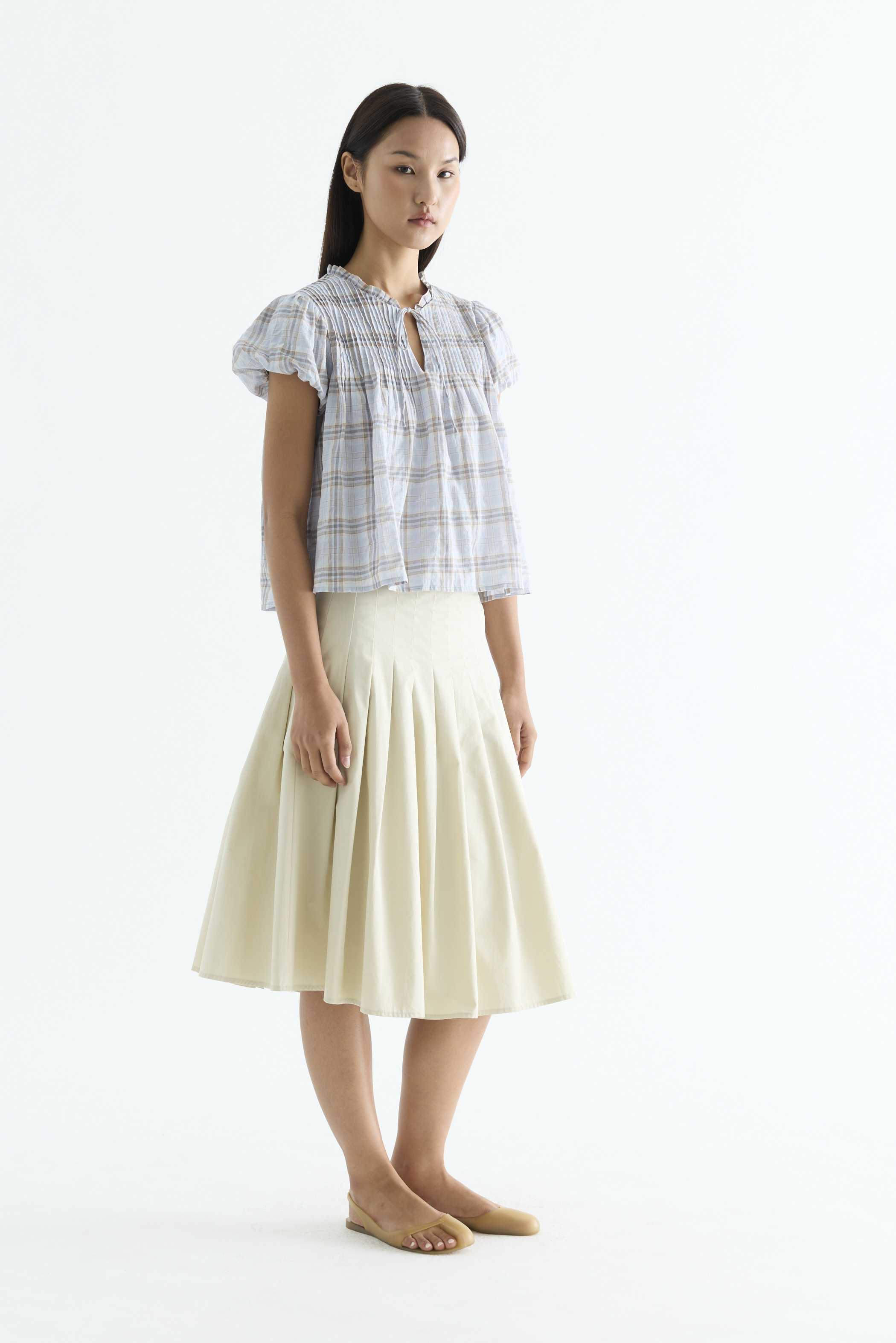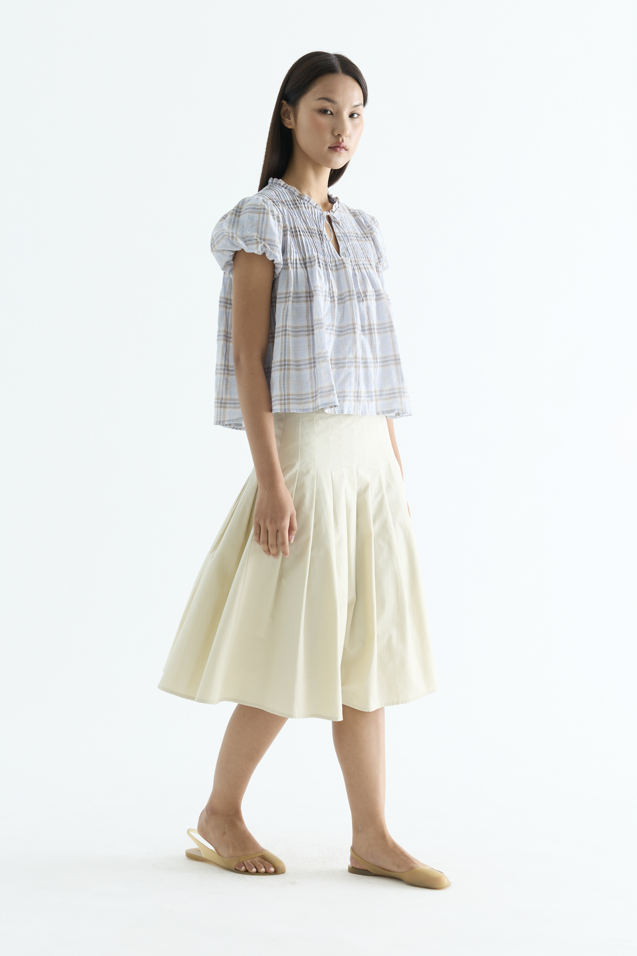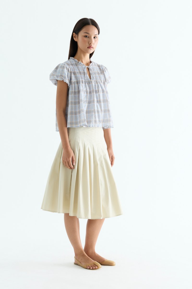 Here for the flare. Cut from crisp and softly structured cotton, this top features a frill-trimmed neckline, front opening with tie-strap, pin-tuck pleats and elasticated puffy sleeves. Worn in a relaxed swing silhouette.