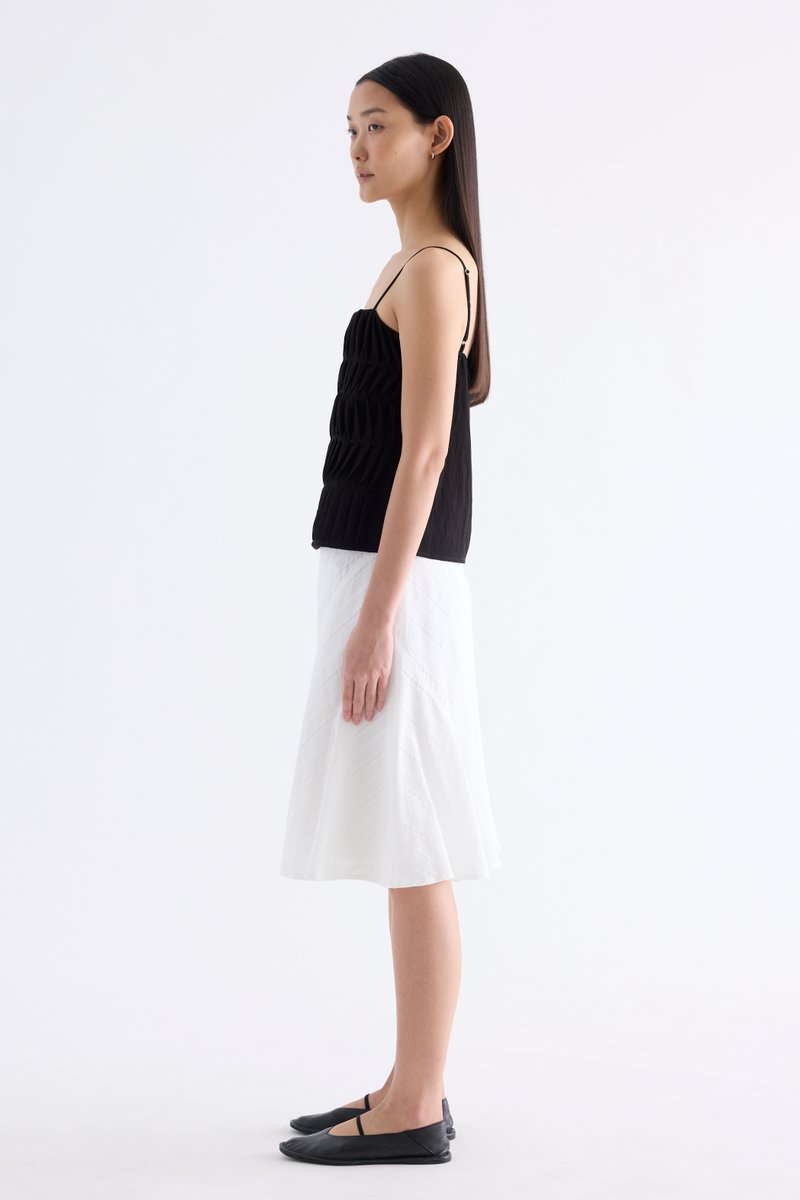 Statement lines. Made from softly structured fabric, this sleeveless top features twisted pleats at the front, slim adjustable shoulder straps, a straight neckline and a partially elasticated back. Worn in a slim fit.