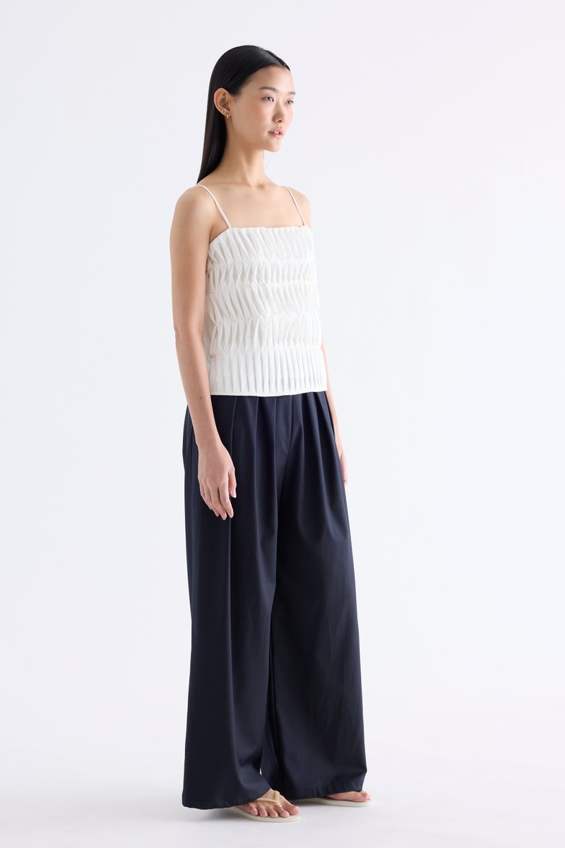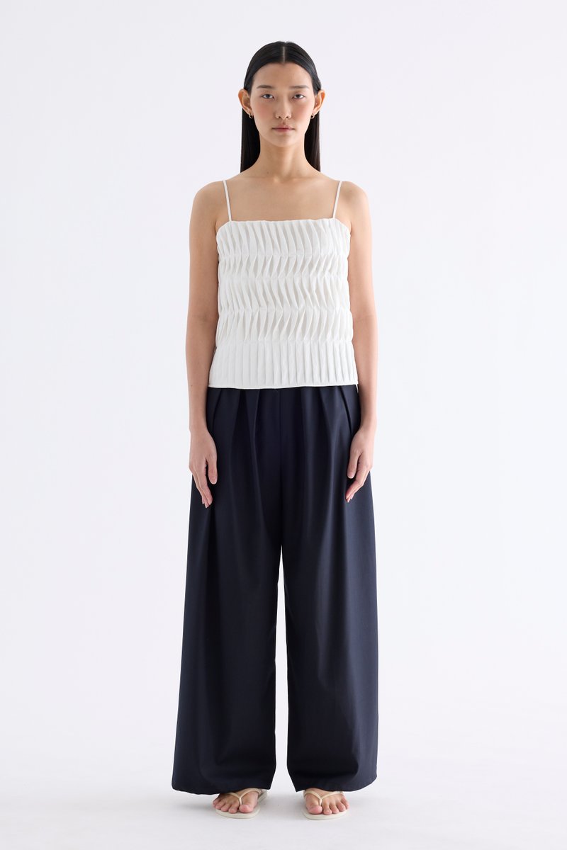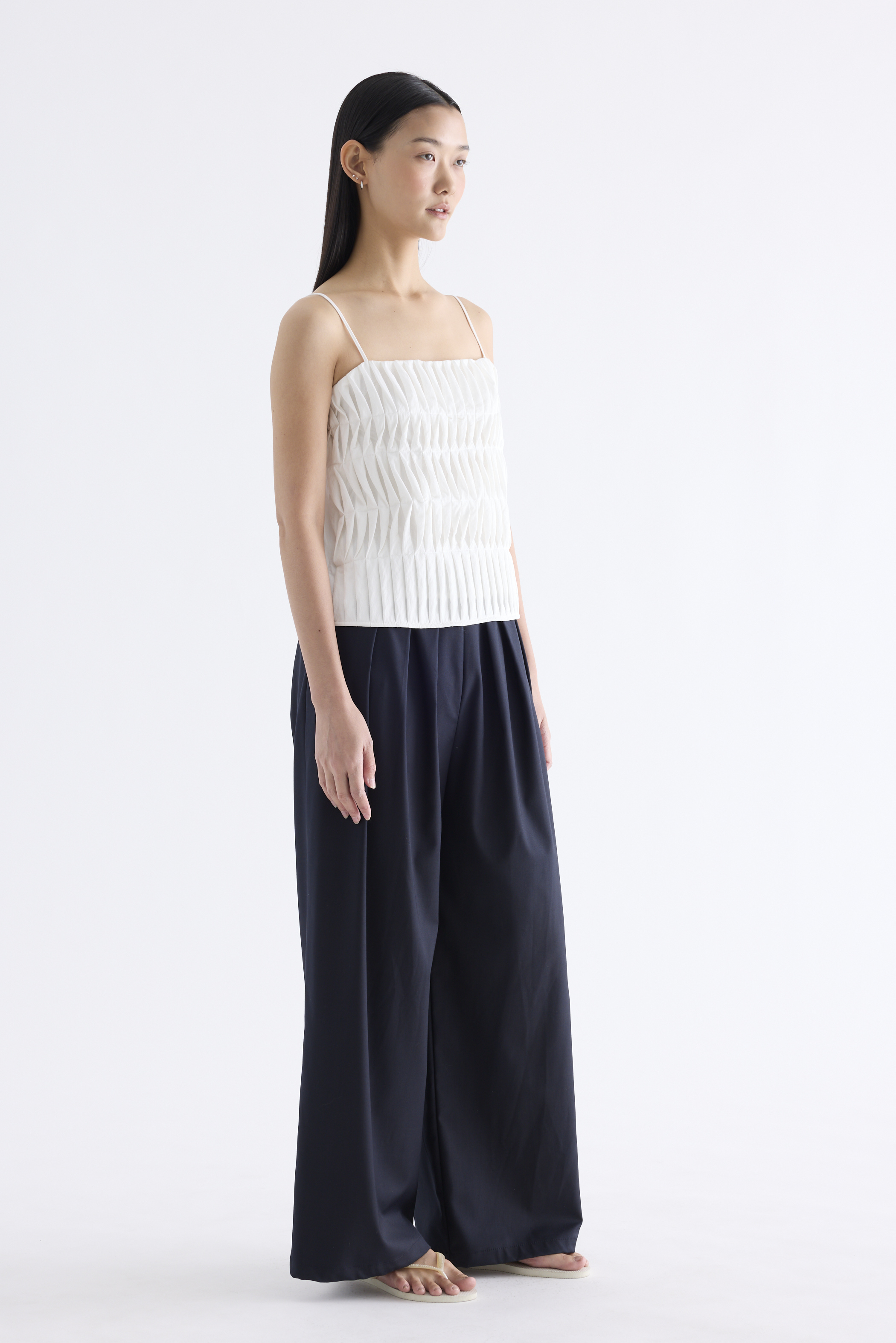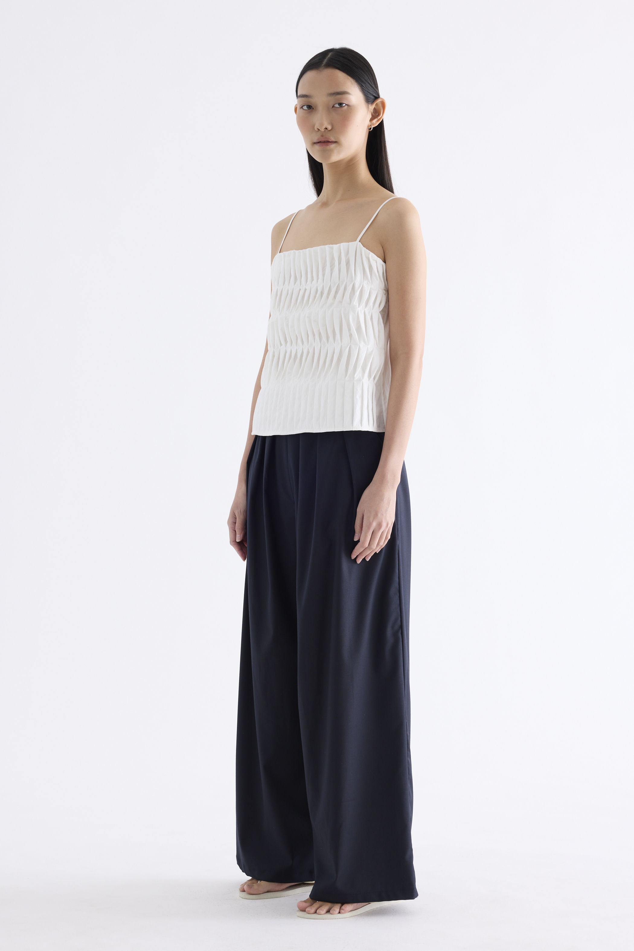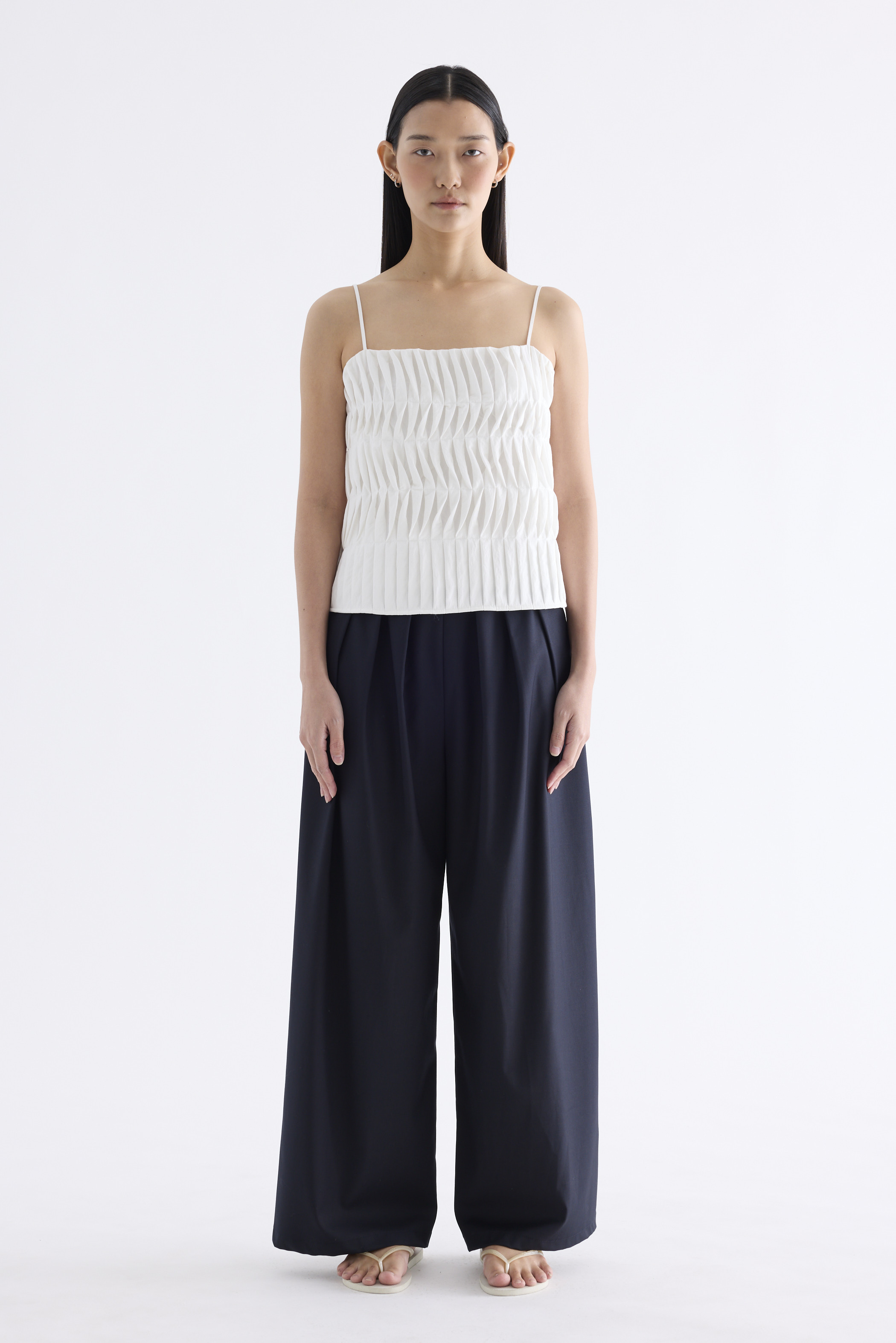 Statement lines. Made from softly structured fabric, this sleeveless top features twisted pleats at the front, slim adjustable shoulder straps, a straight neckline and a partially elasticated back. Worn in a slim fit.