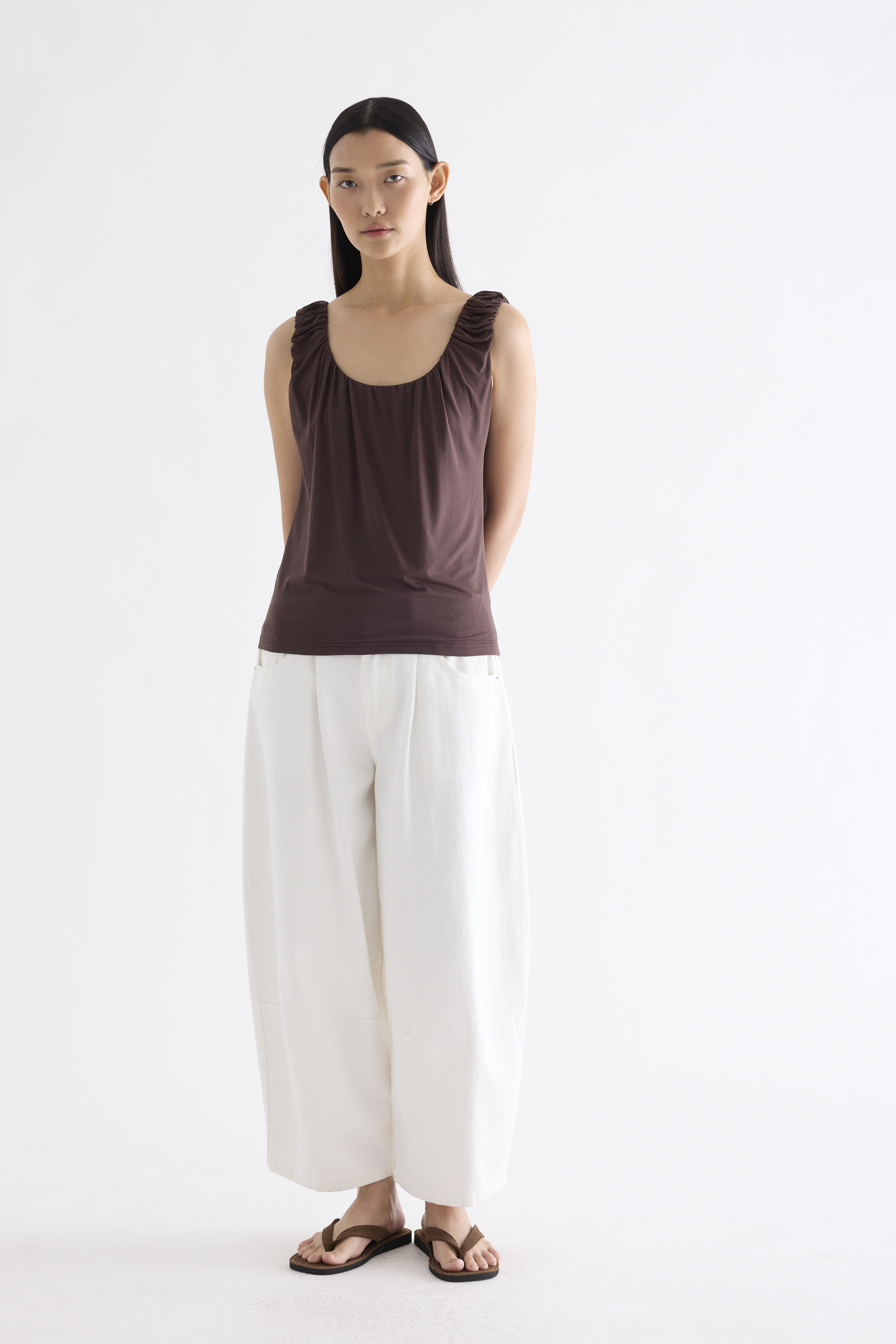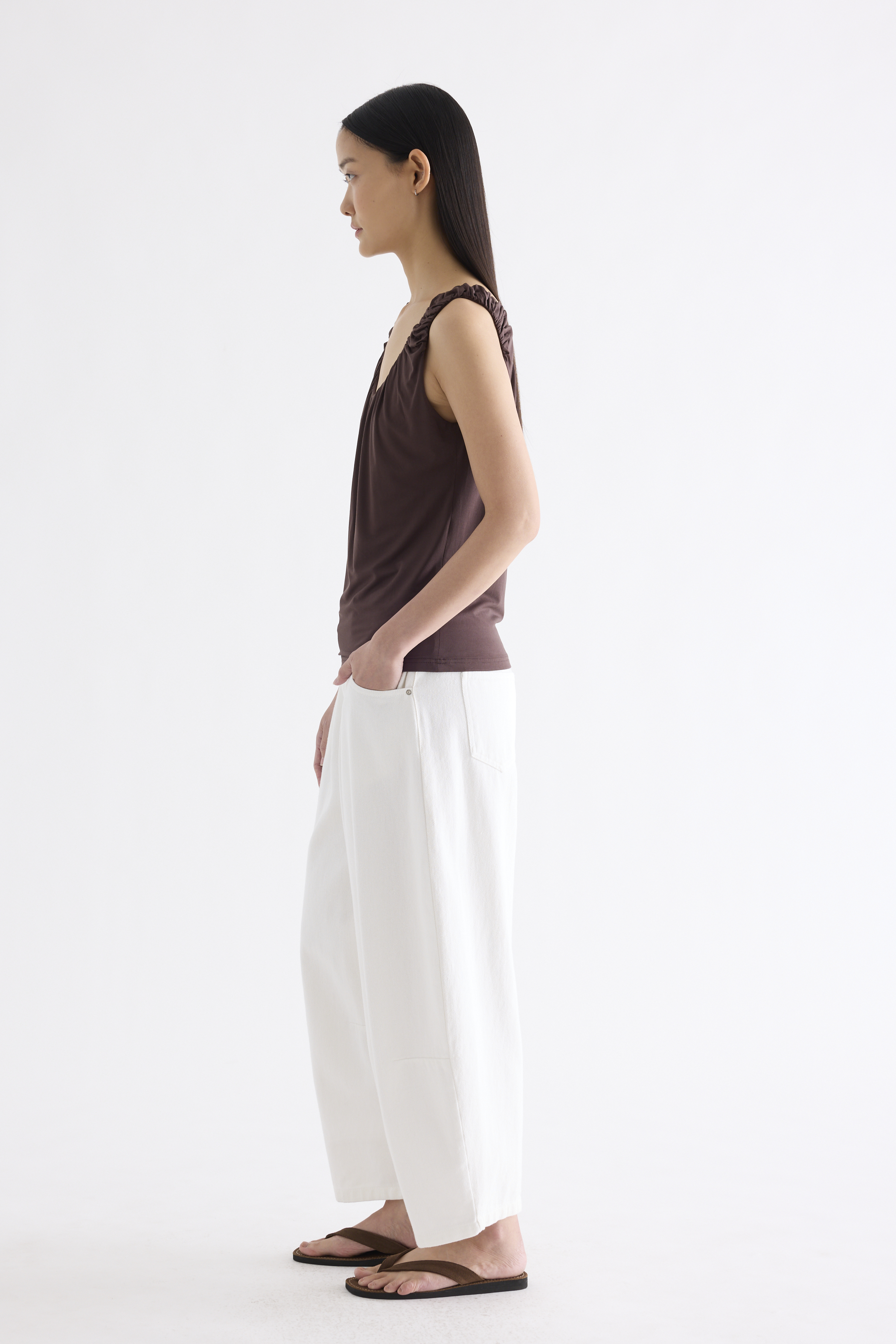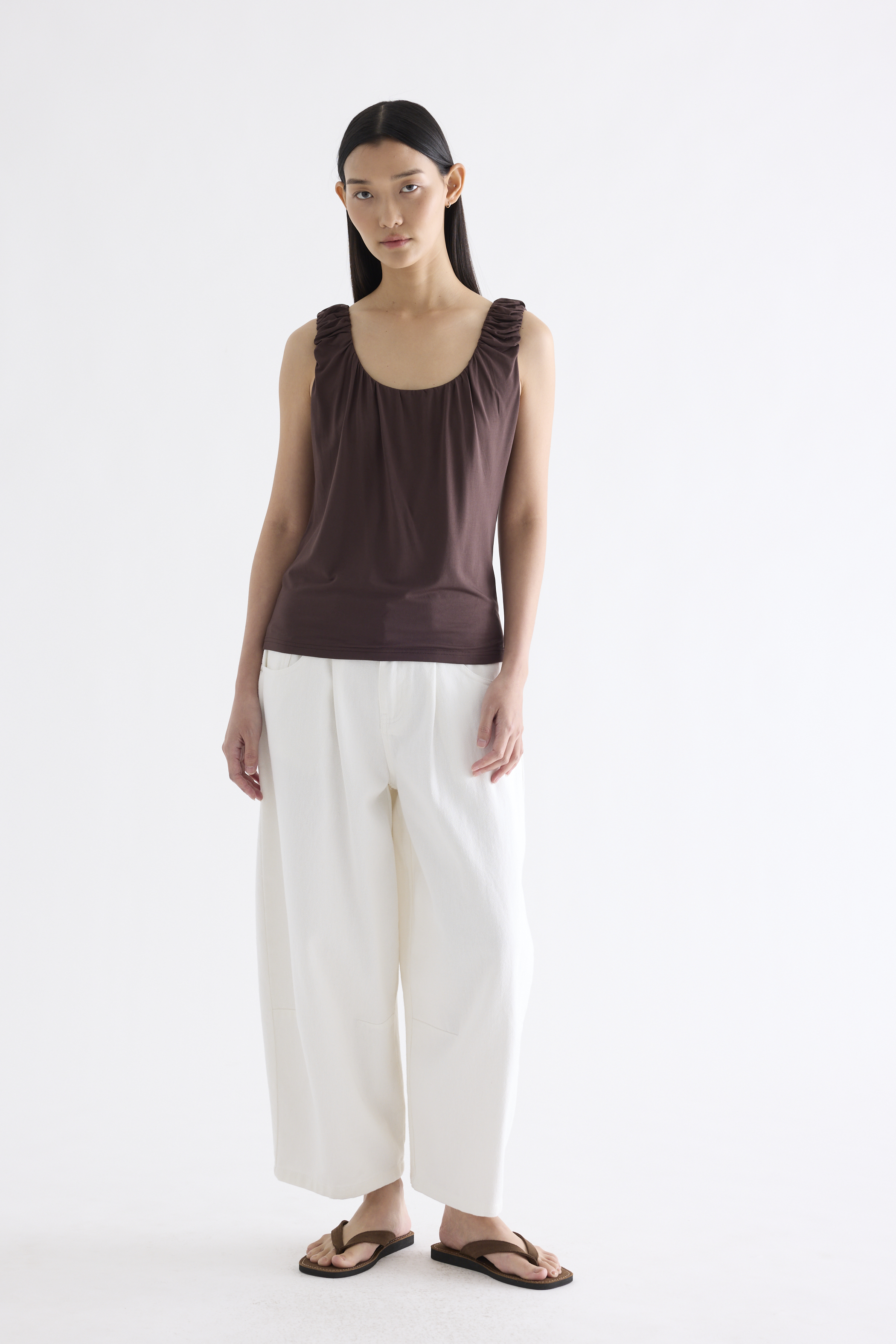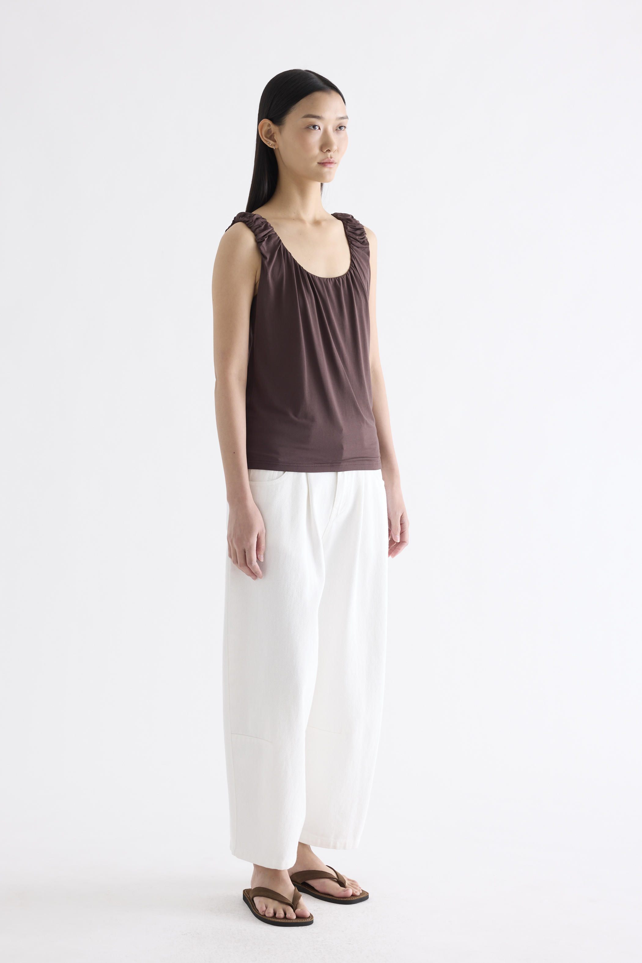 For the love of textures. Made from smooth and stretchy fabric, this sleeveless top features a U-shaped neckline and ruched shoulder straps. Worn in a slim fit.