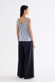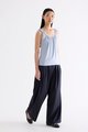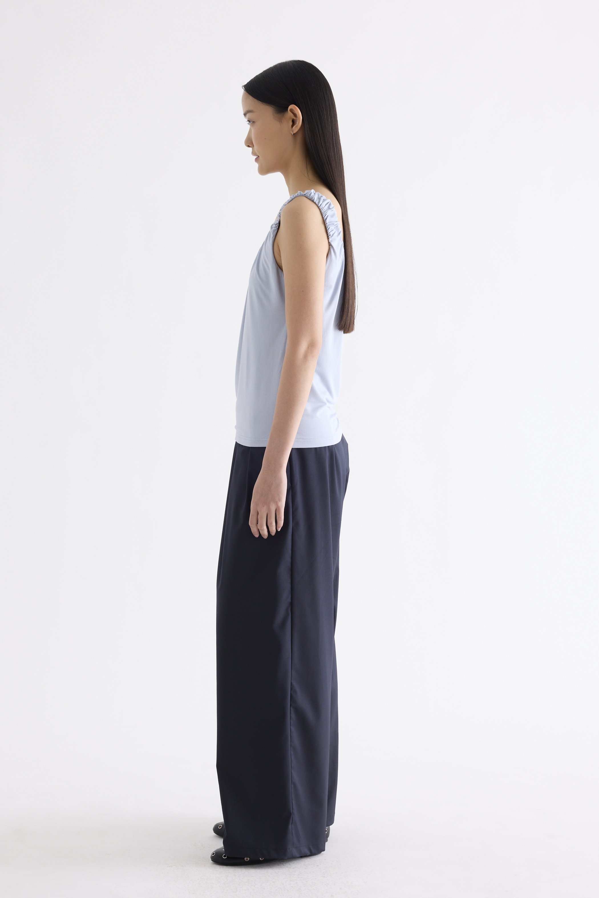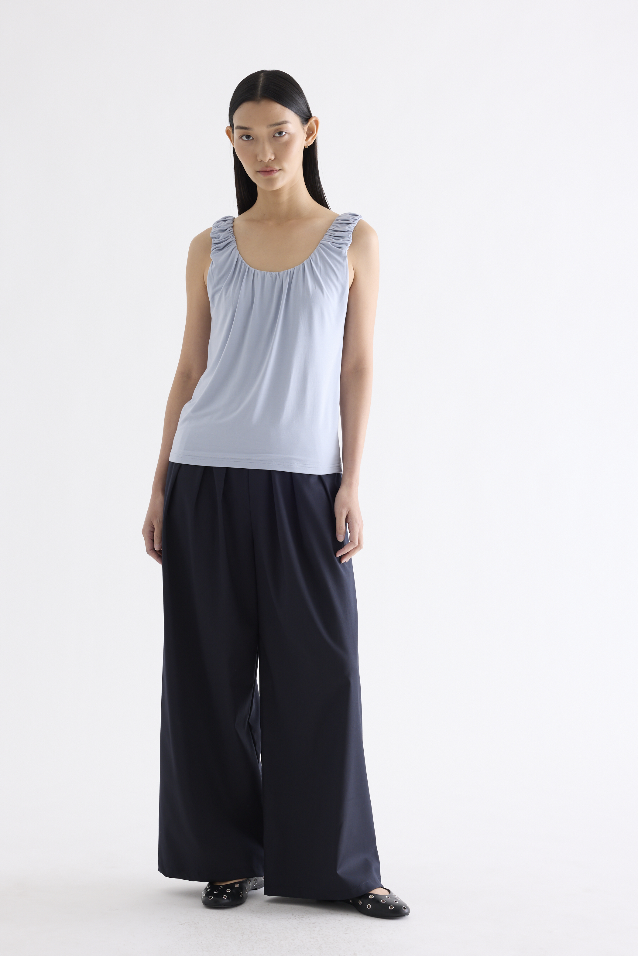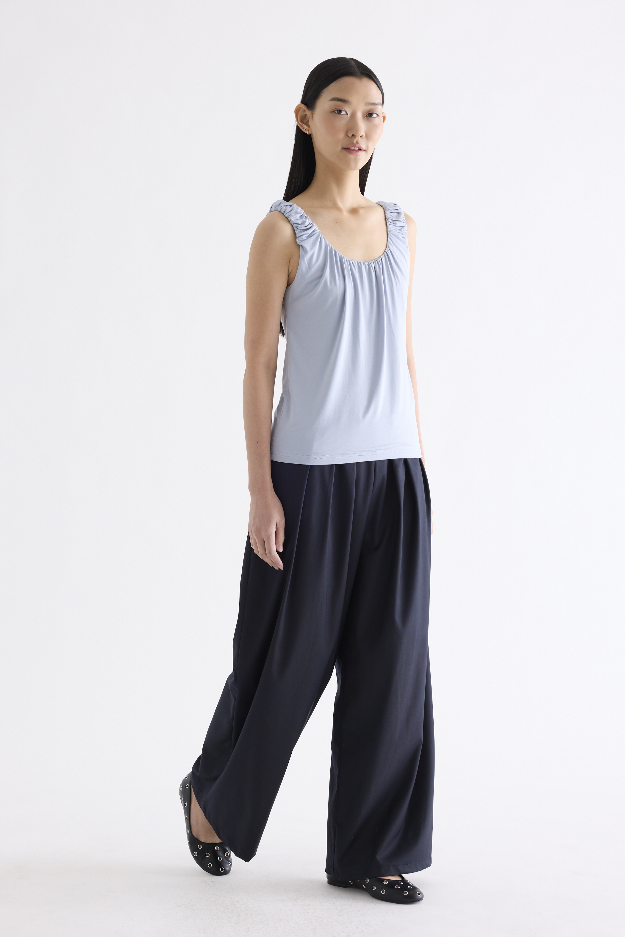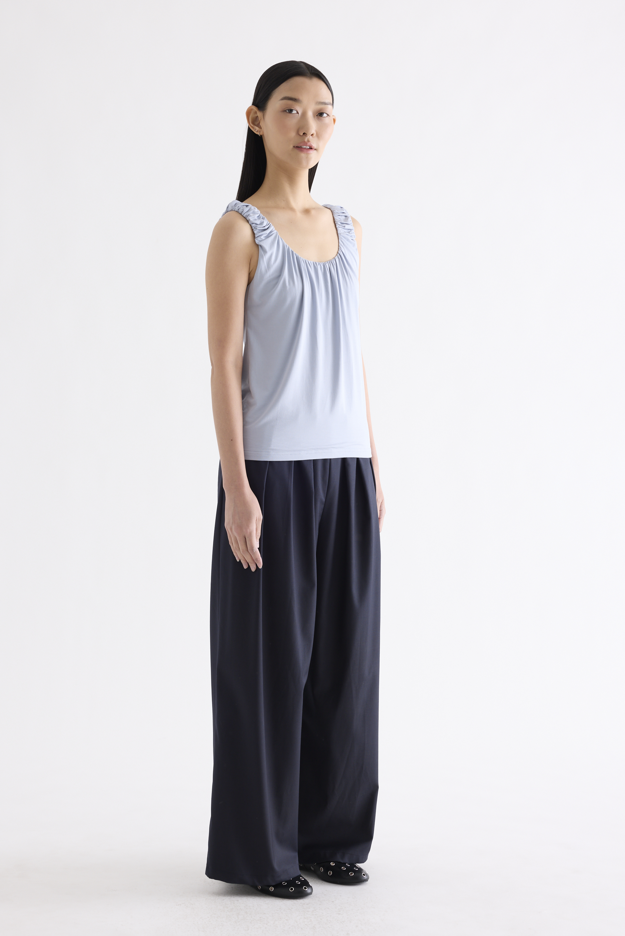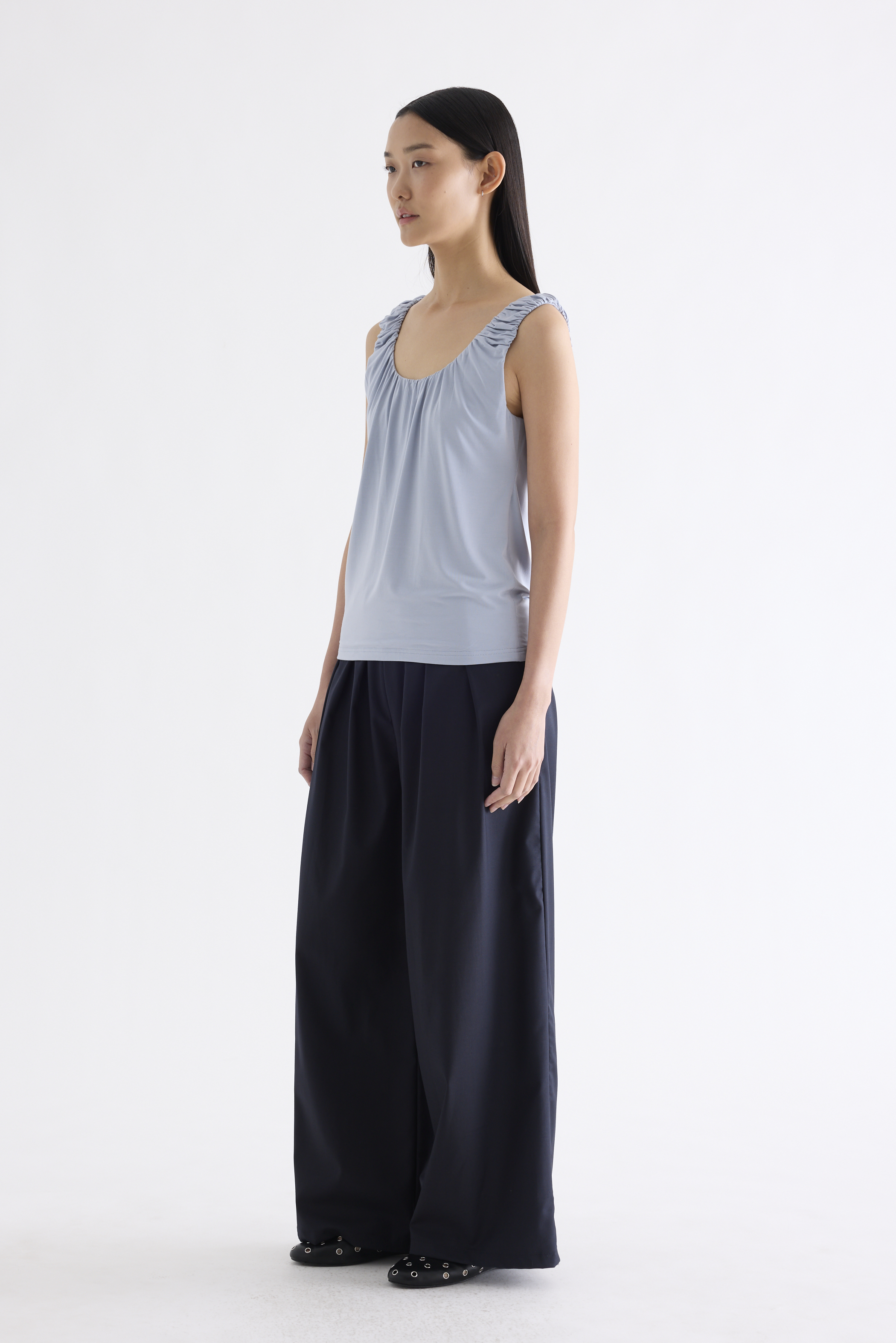For the love of textures. Made from smooth and stretchy fabric, this sleeveless top features a U-shaped neckline and ruched shoulder straps. Worn in a slim fit.