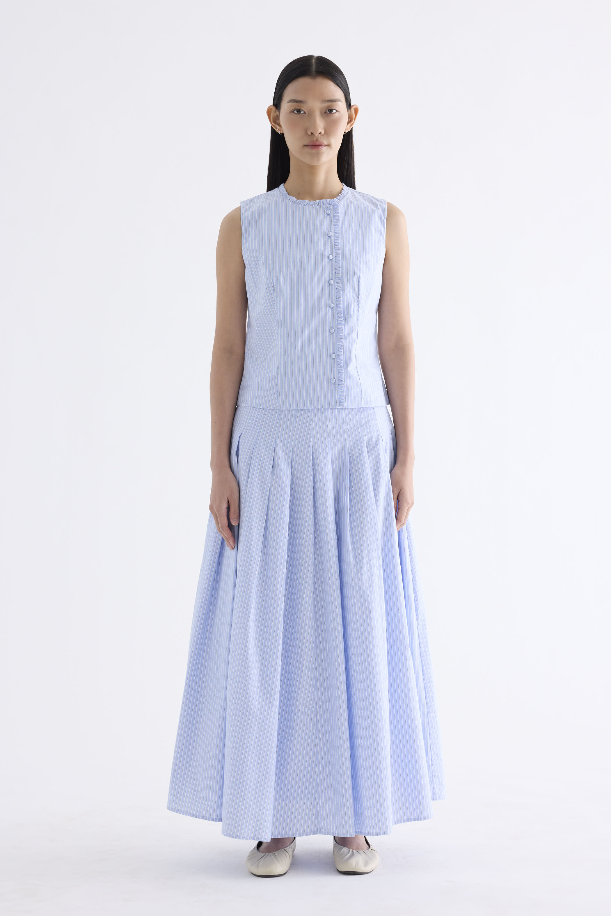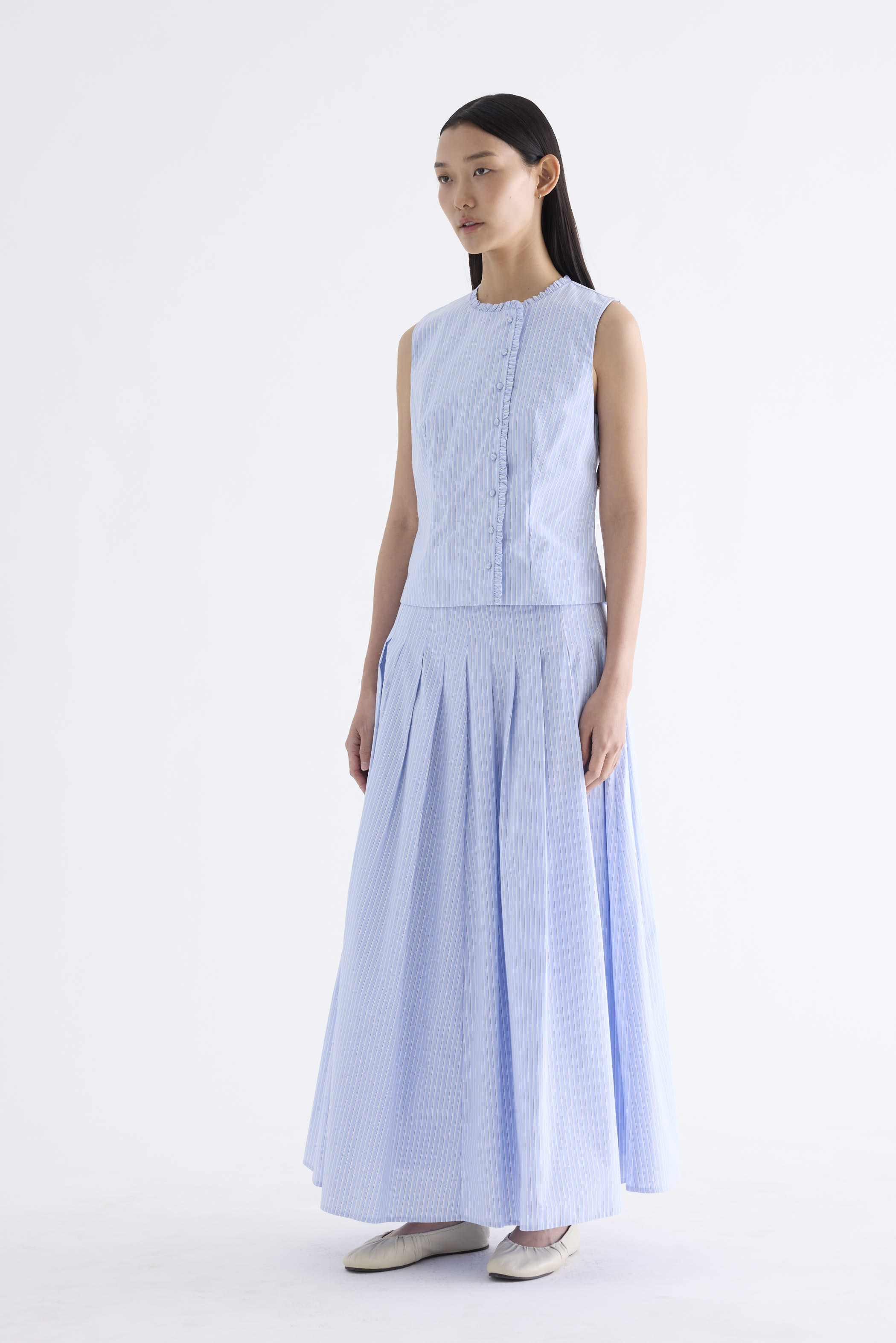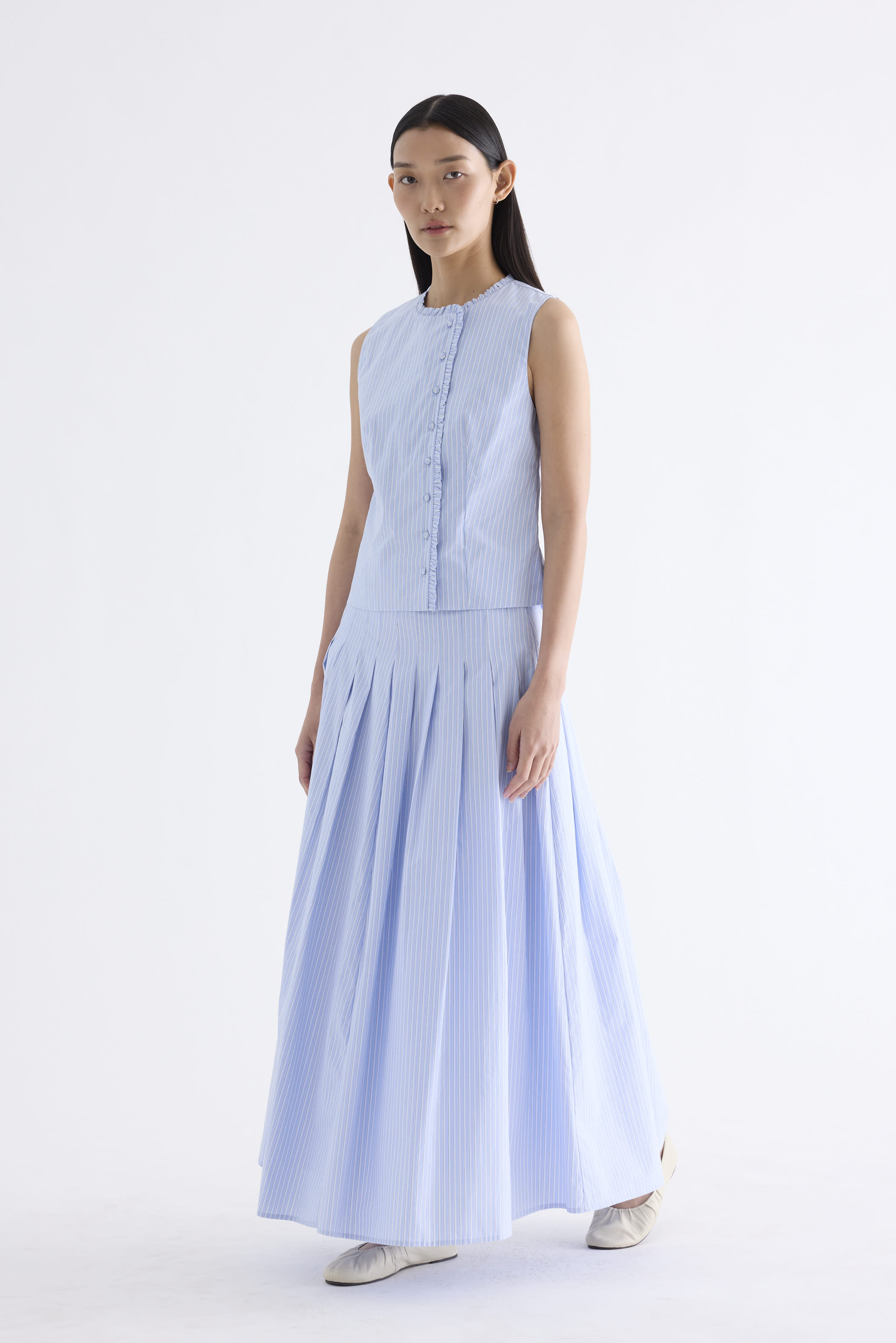 Textured and tailored. Made from crisp and softly structured cotton, this sleeveless top features a ruffle-trimmed round neckline and button-down front. Worn in a slim fit.