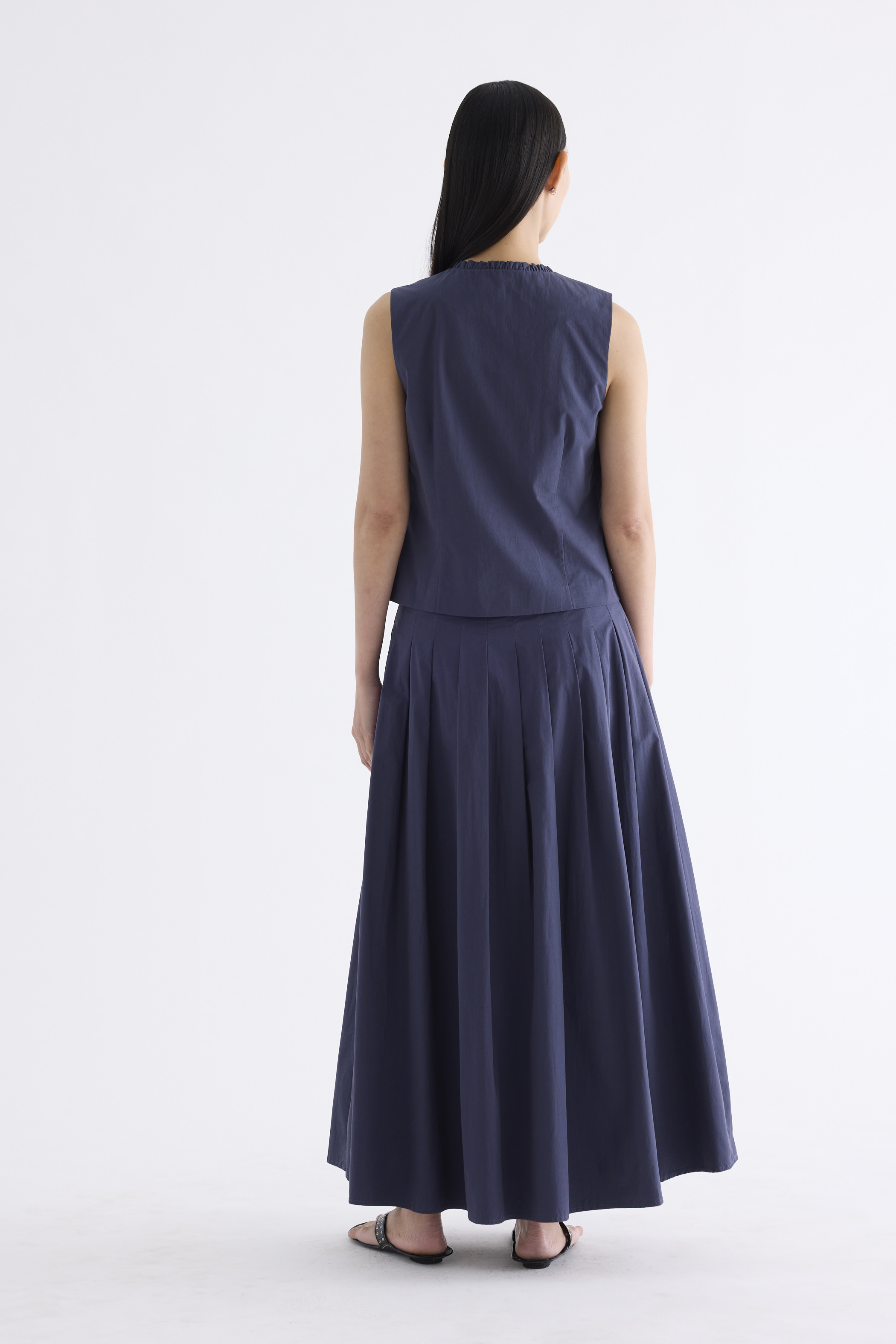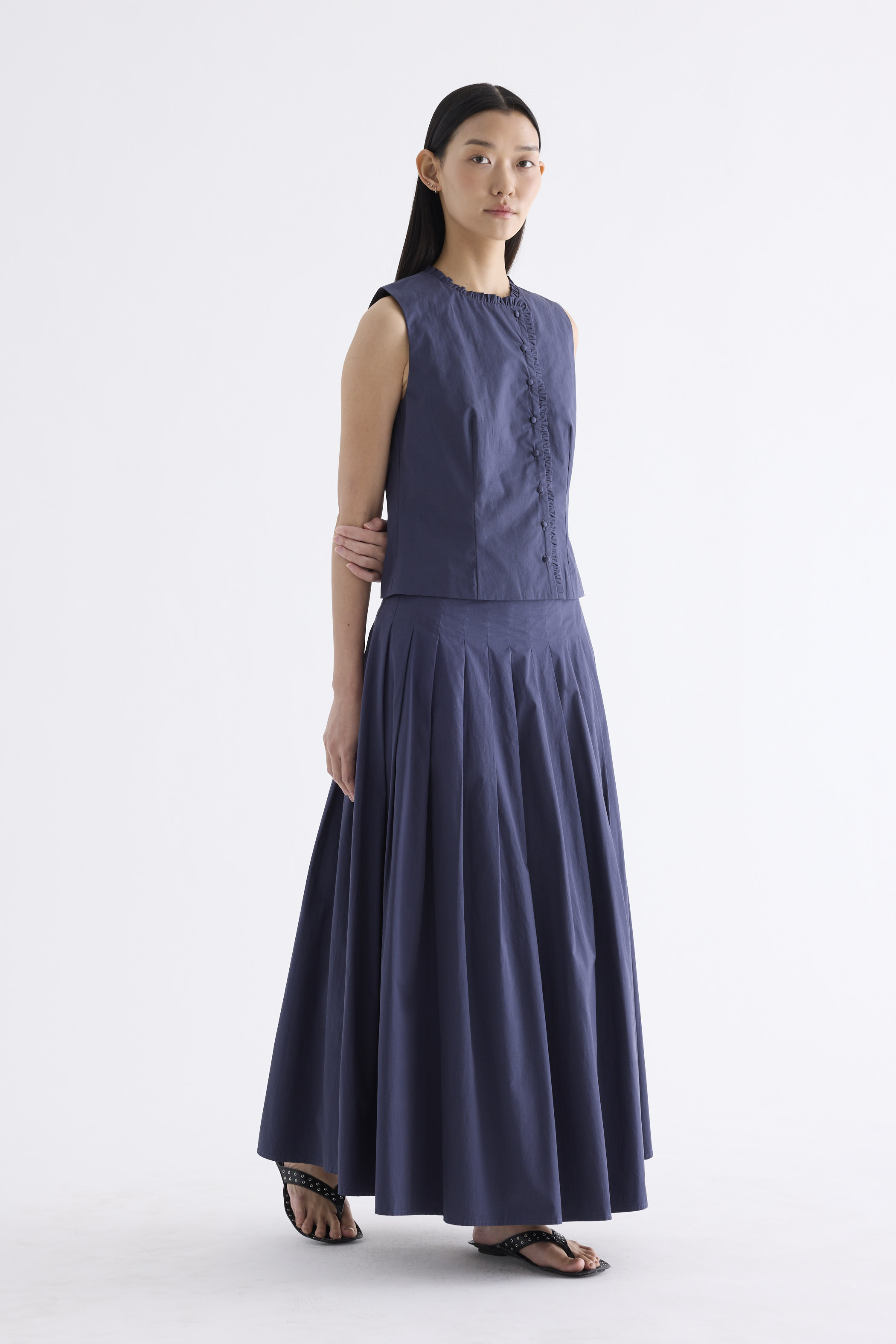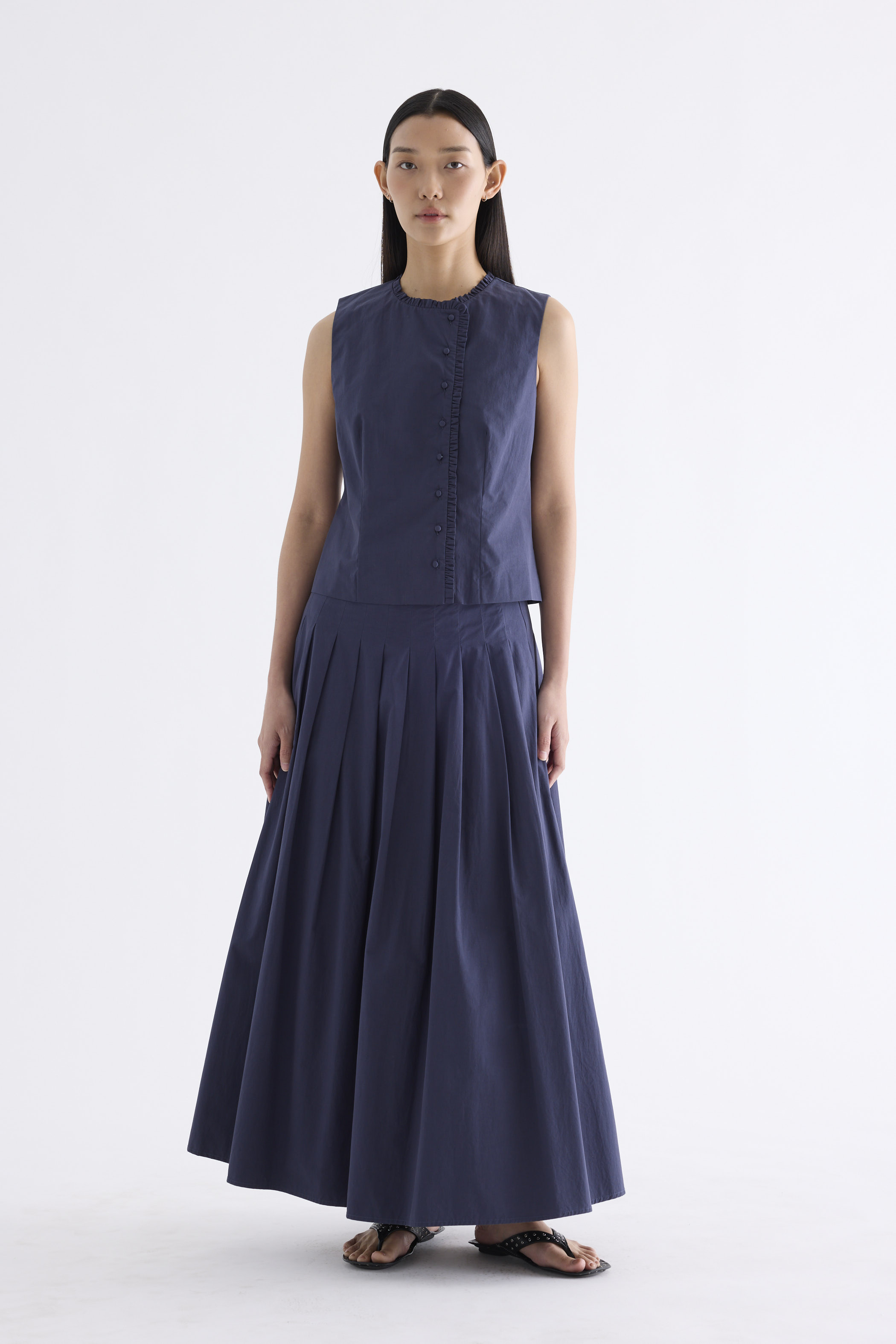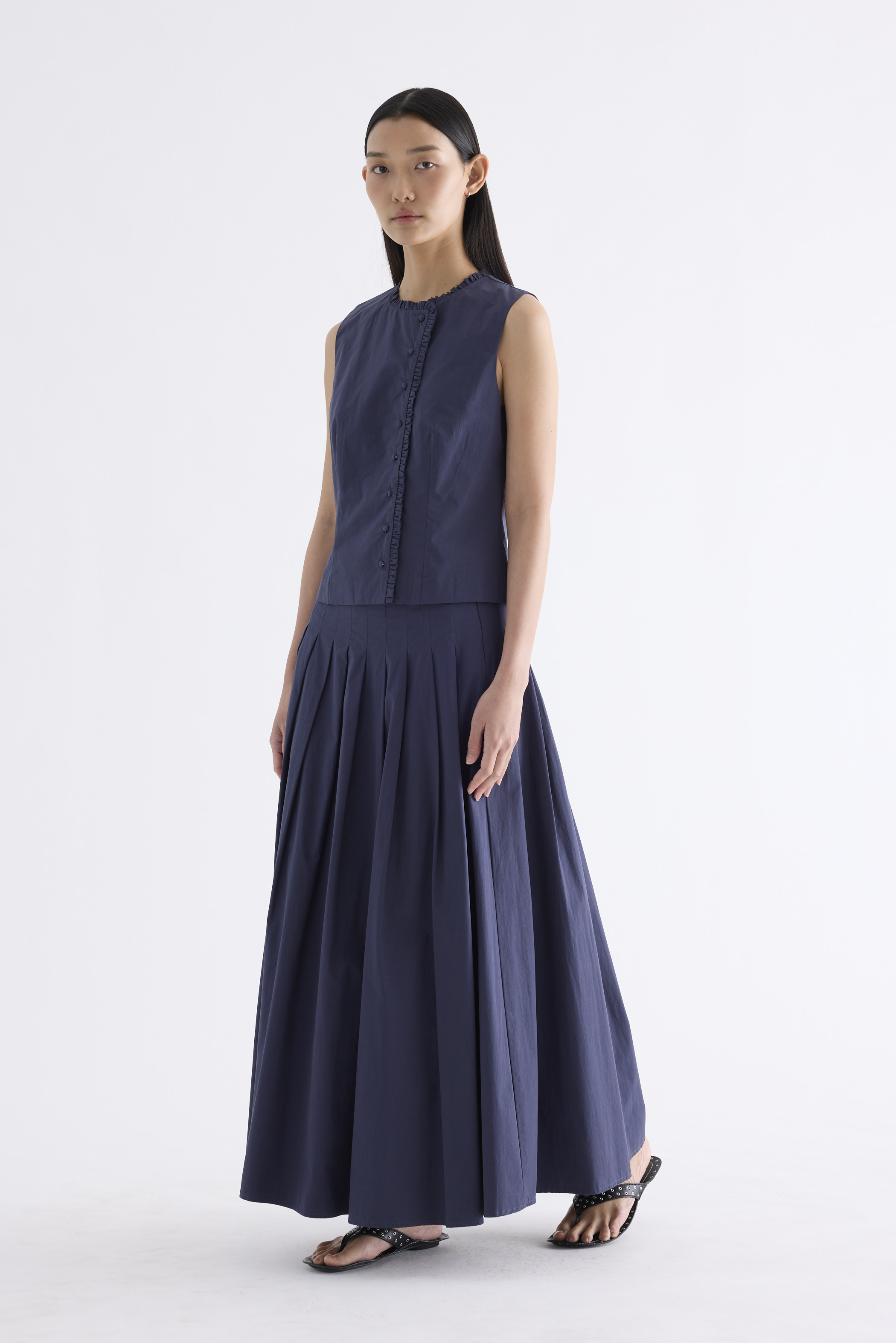 Textured and tailored. Made from crisp and softly structured cotton, this sleeveless top features a ruffle-trimmed round neckline and button-down front. Worn in a slim fit.