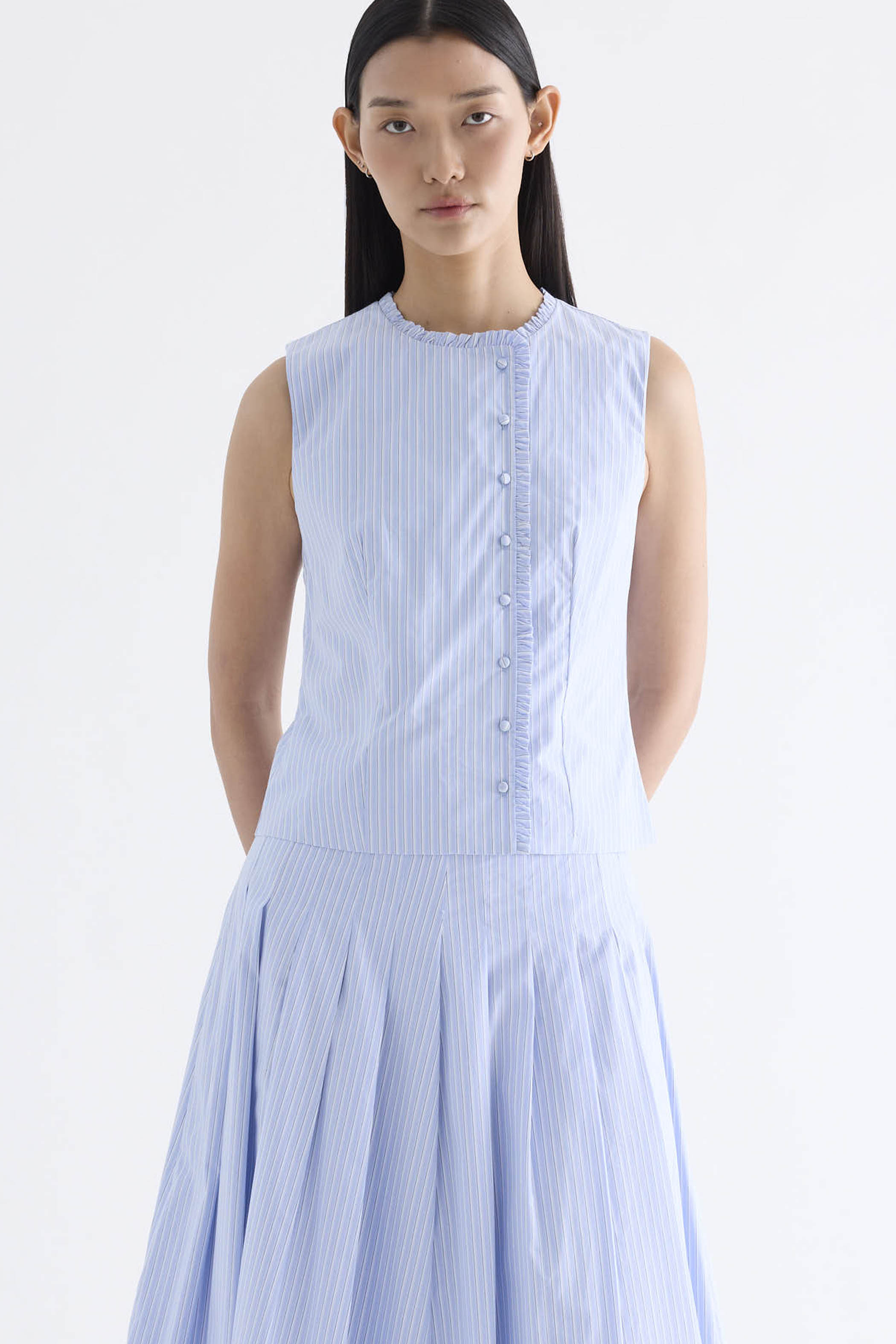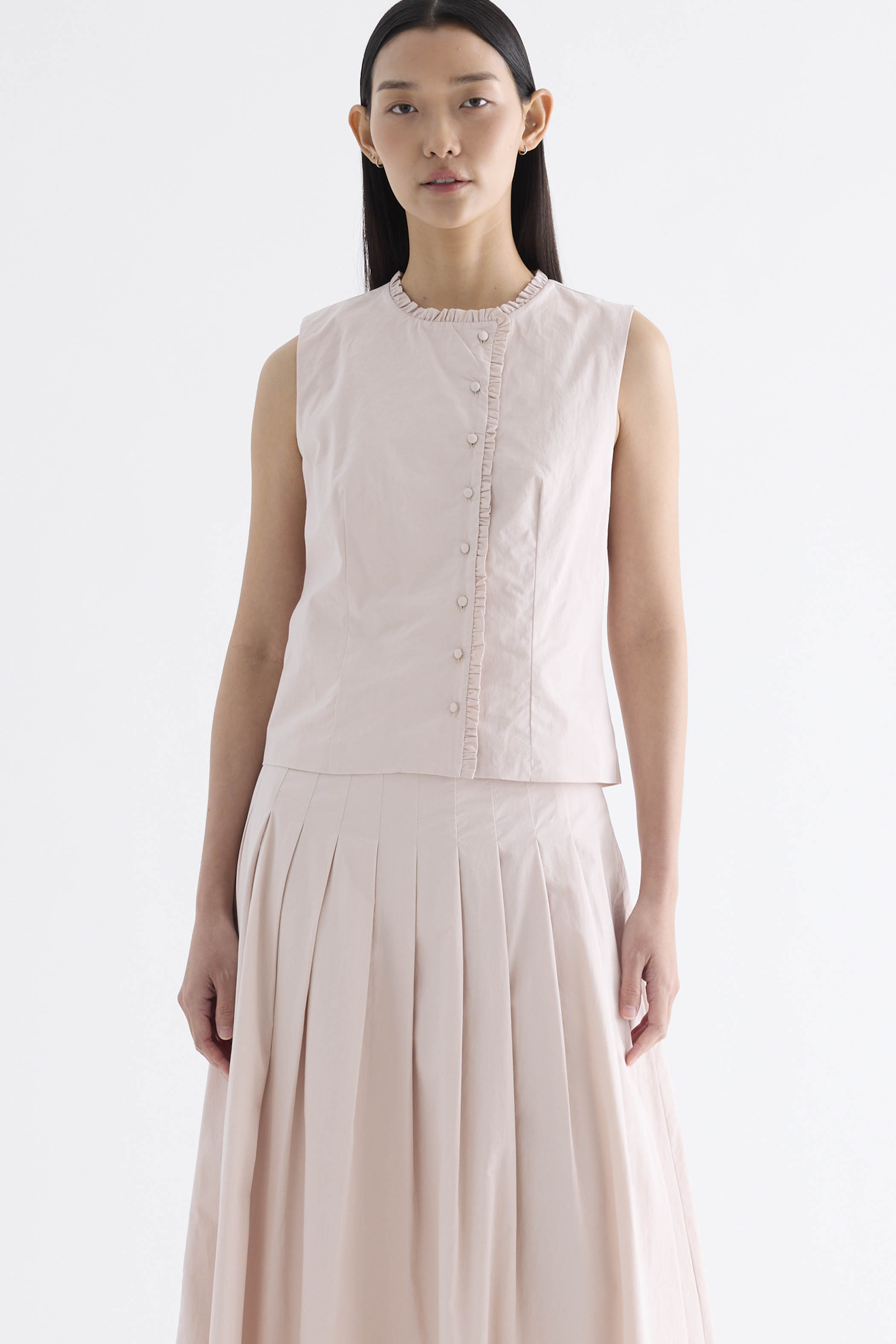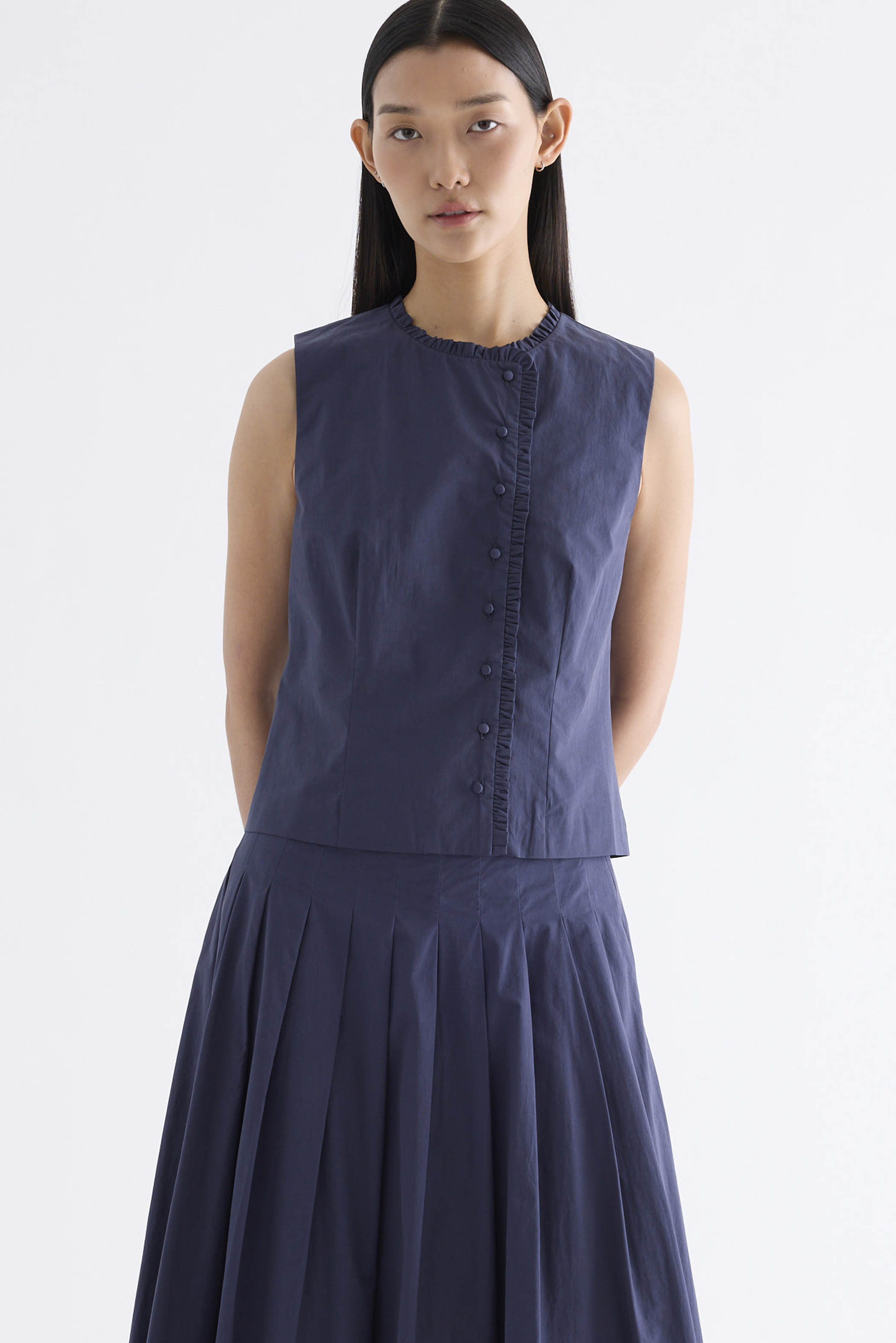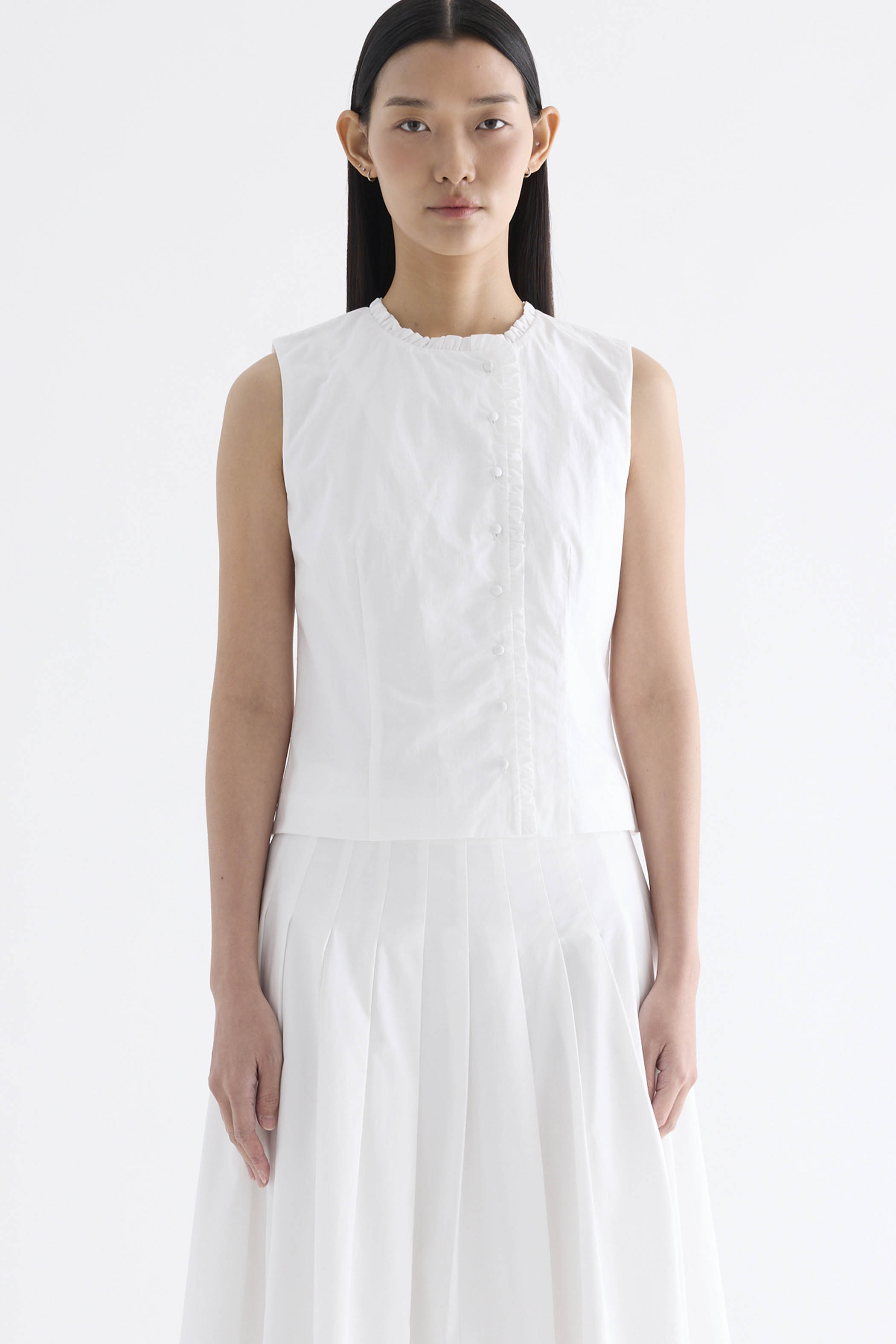 Textured and tailored. Made from crisp and softly structured cotton, this sleeveless top features a ruffle-trimmed round neckline and button-down front. Worn in a slim fit.