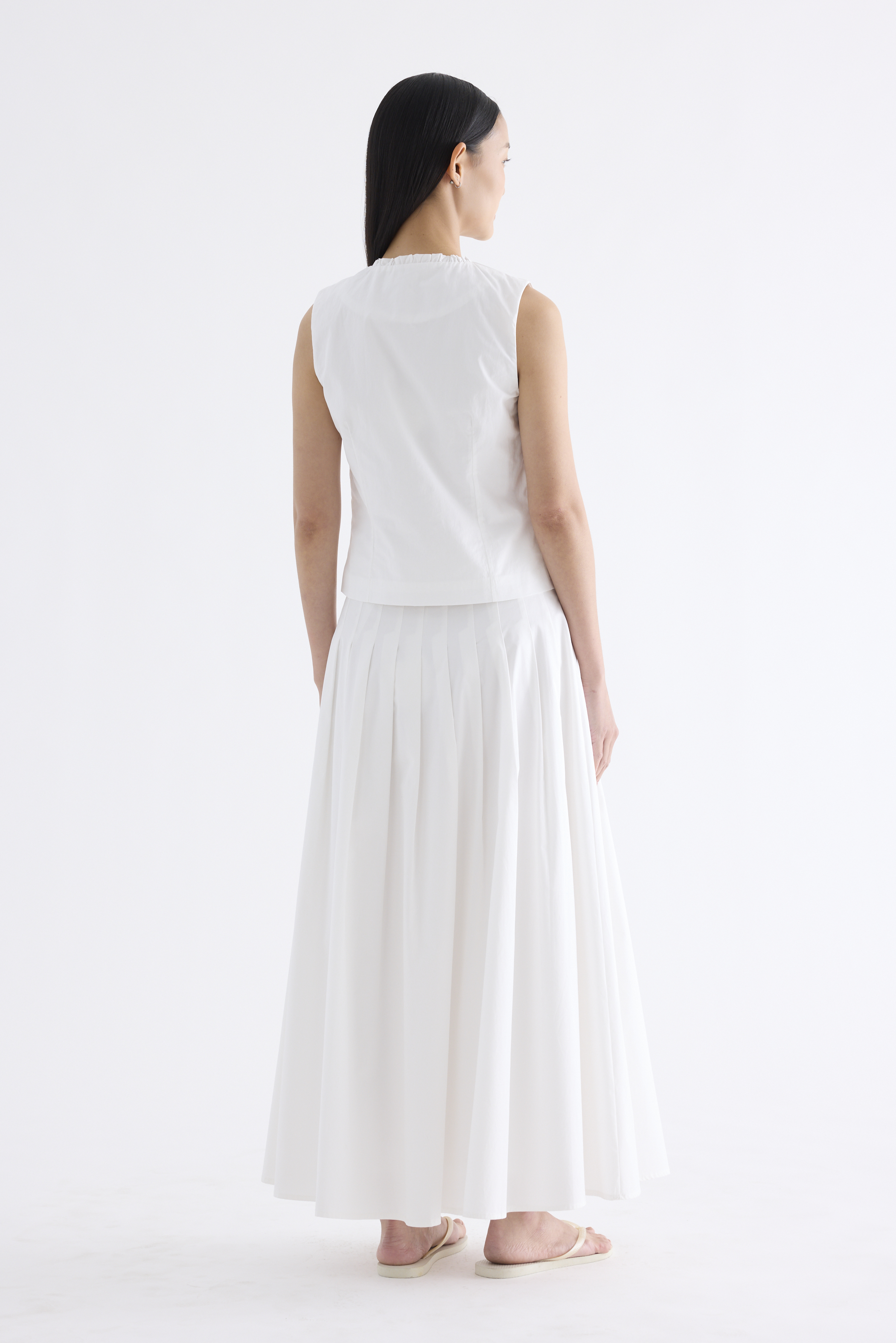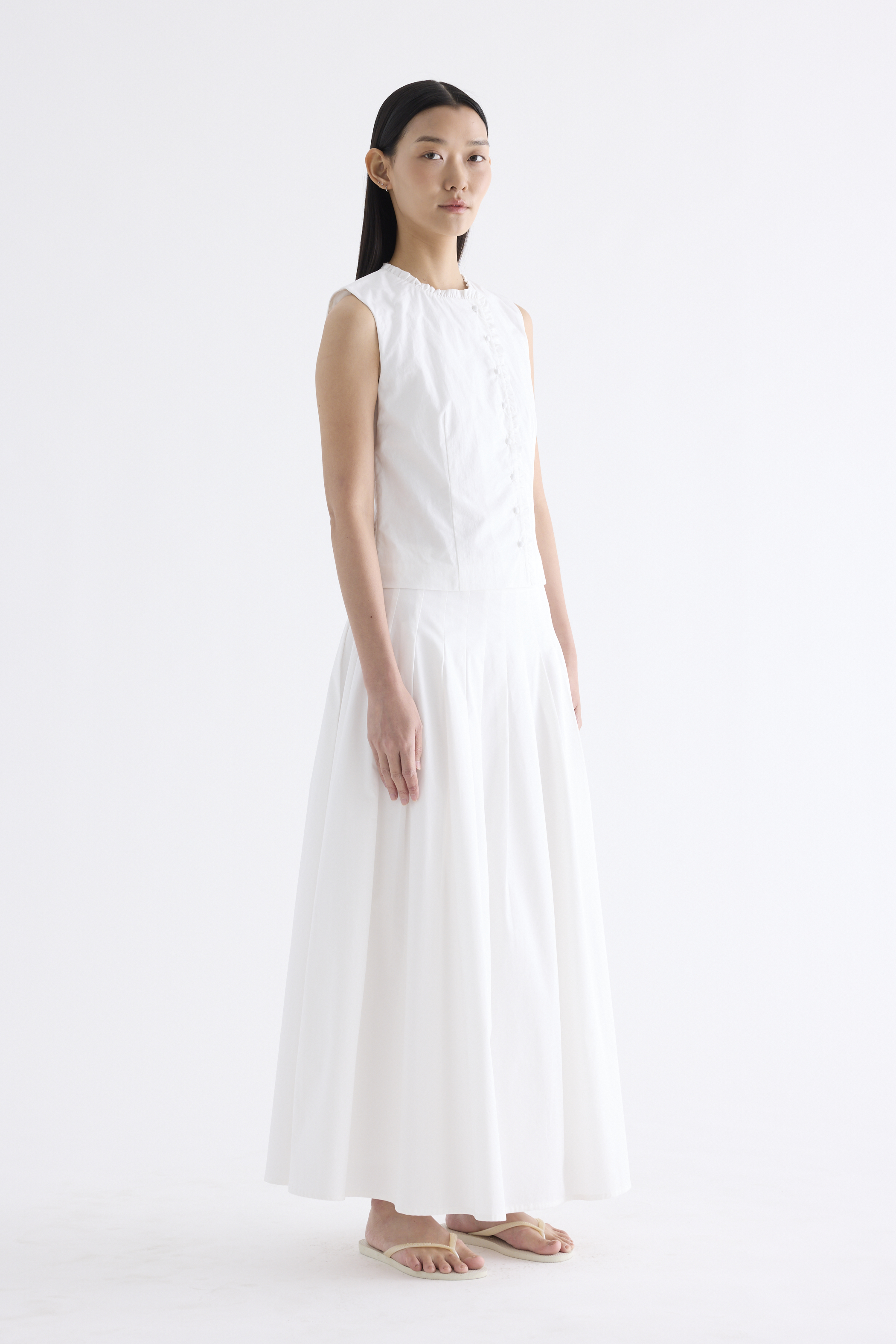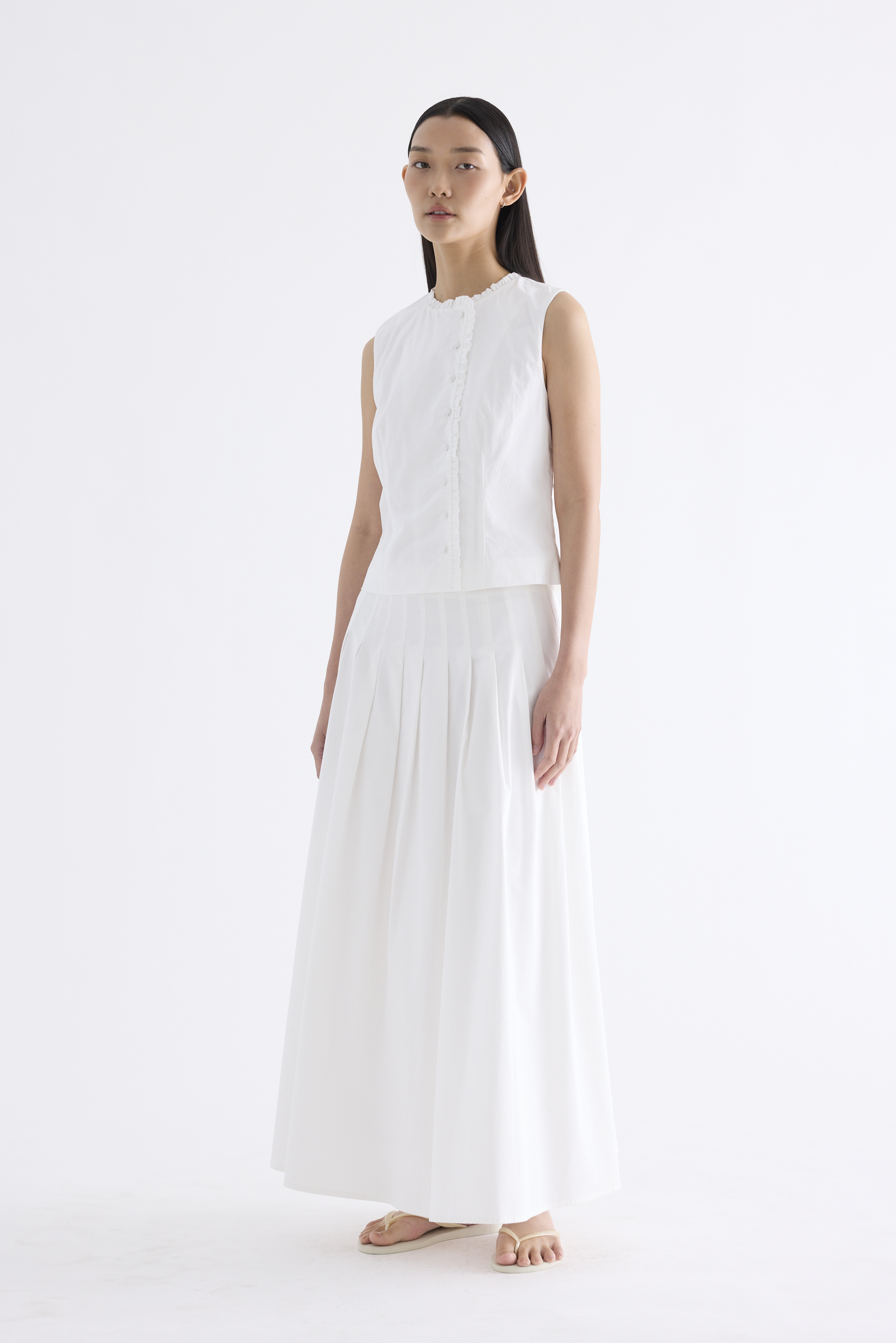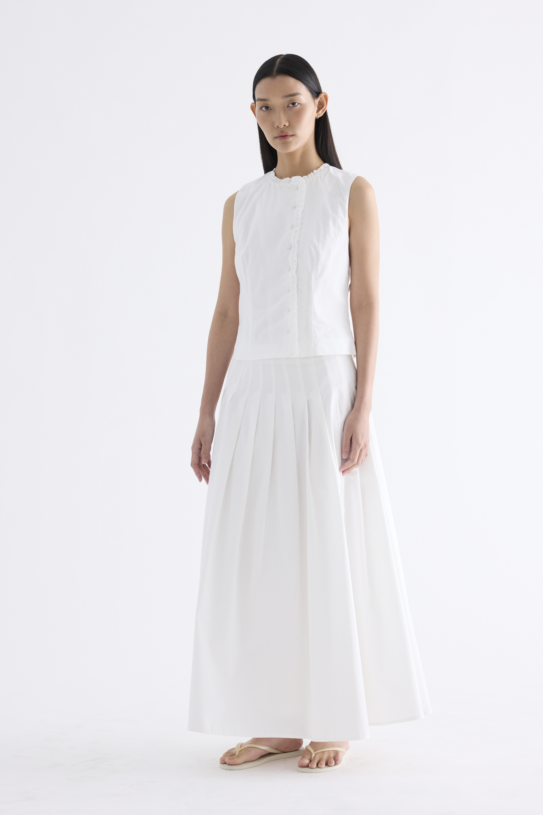Textured and tailored. Made from crisp and softly structured cotton, this sleeveless top features a ruffle-trimmed round neckline and button-down front. Worn in a slim fit.