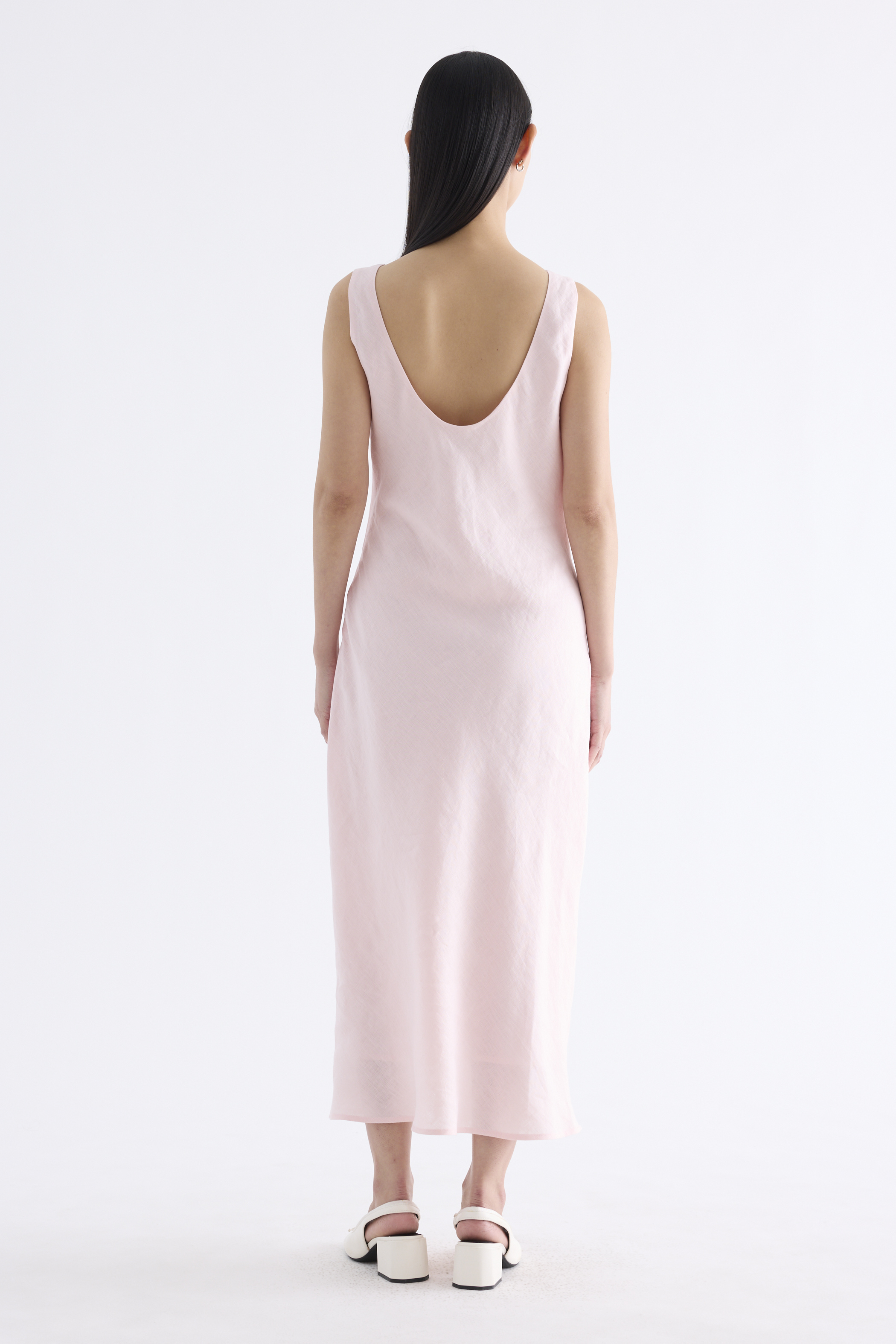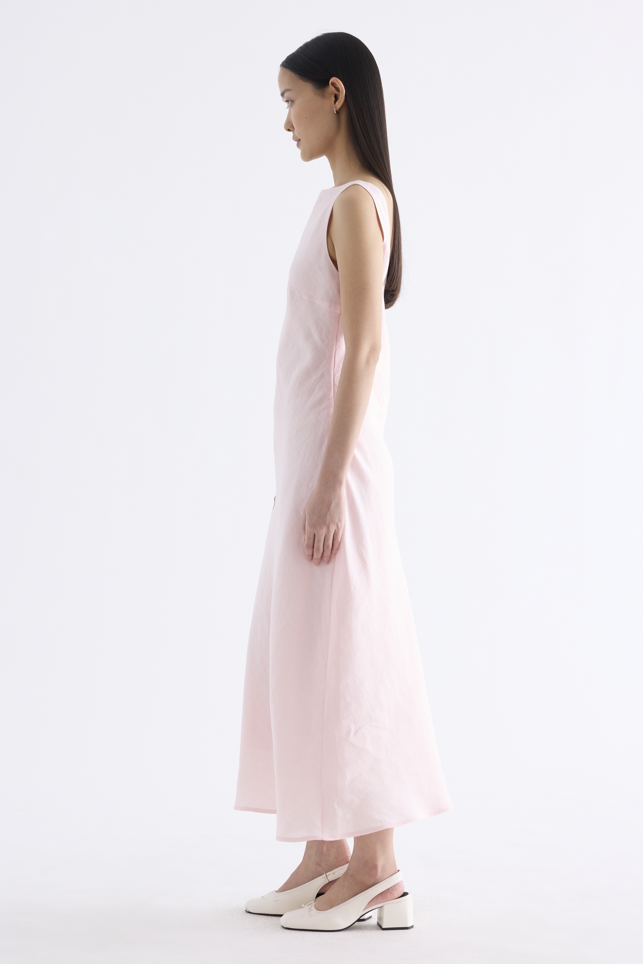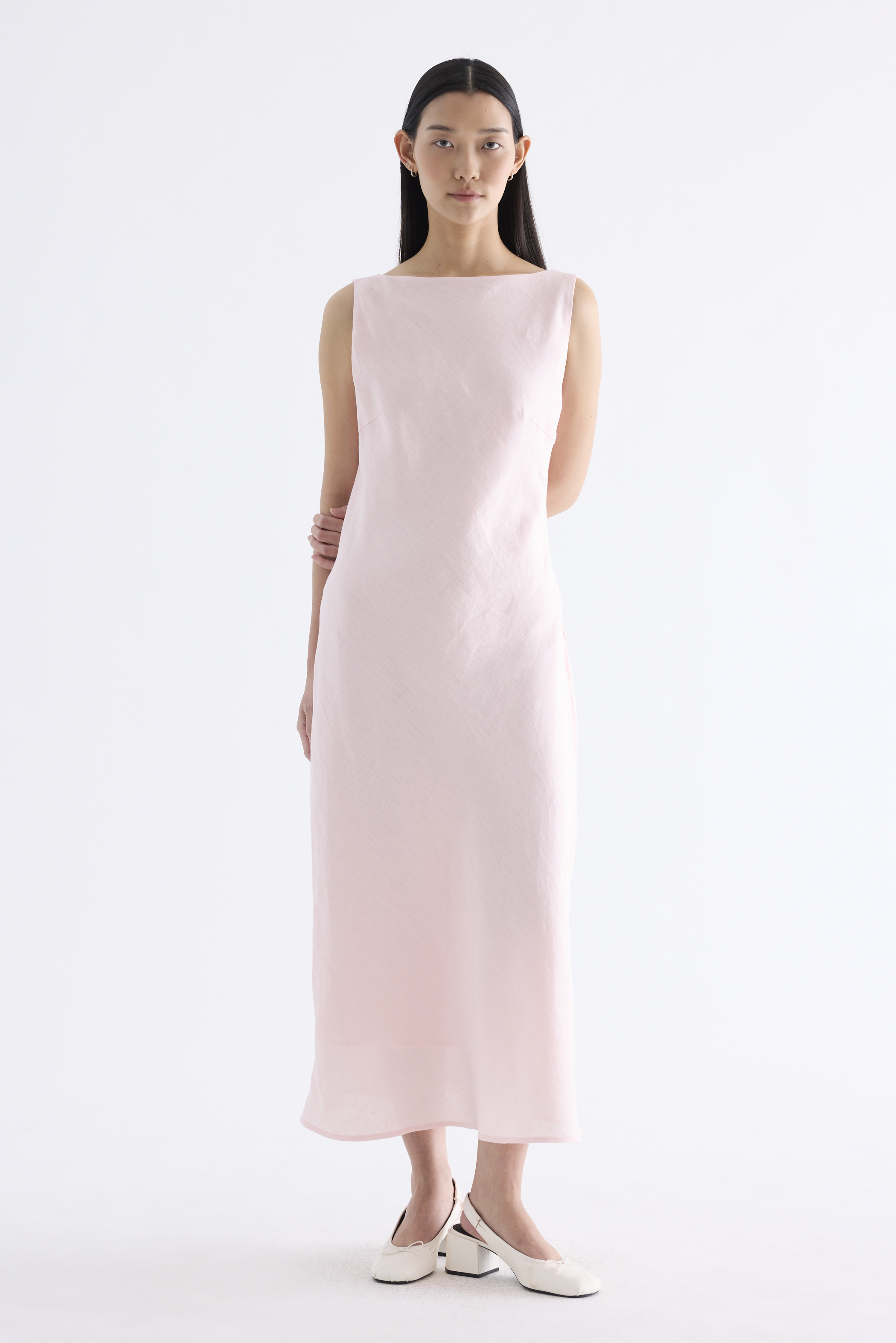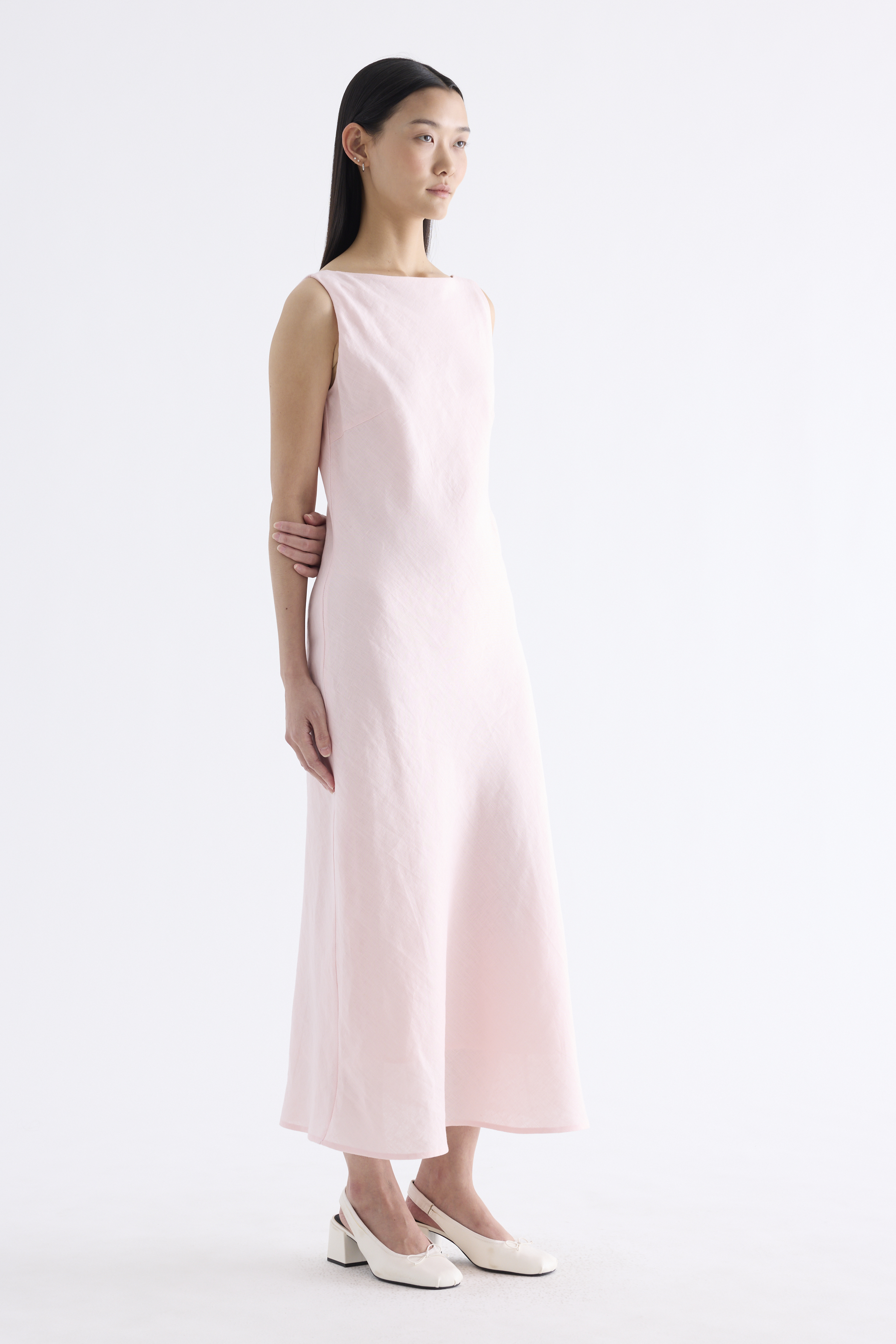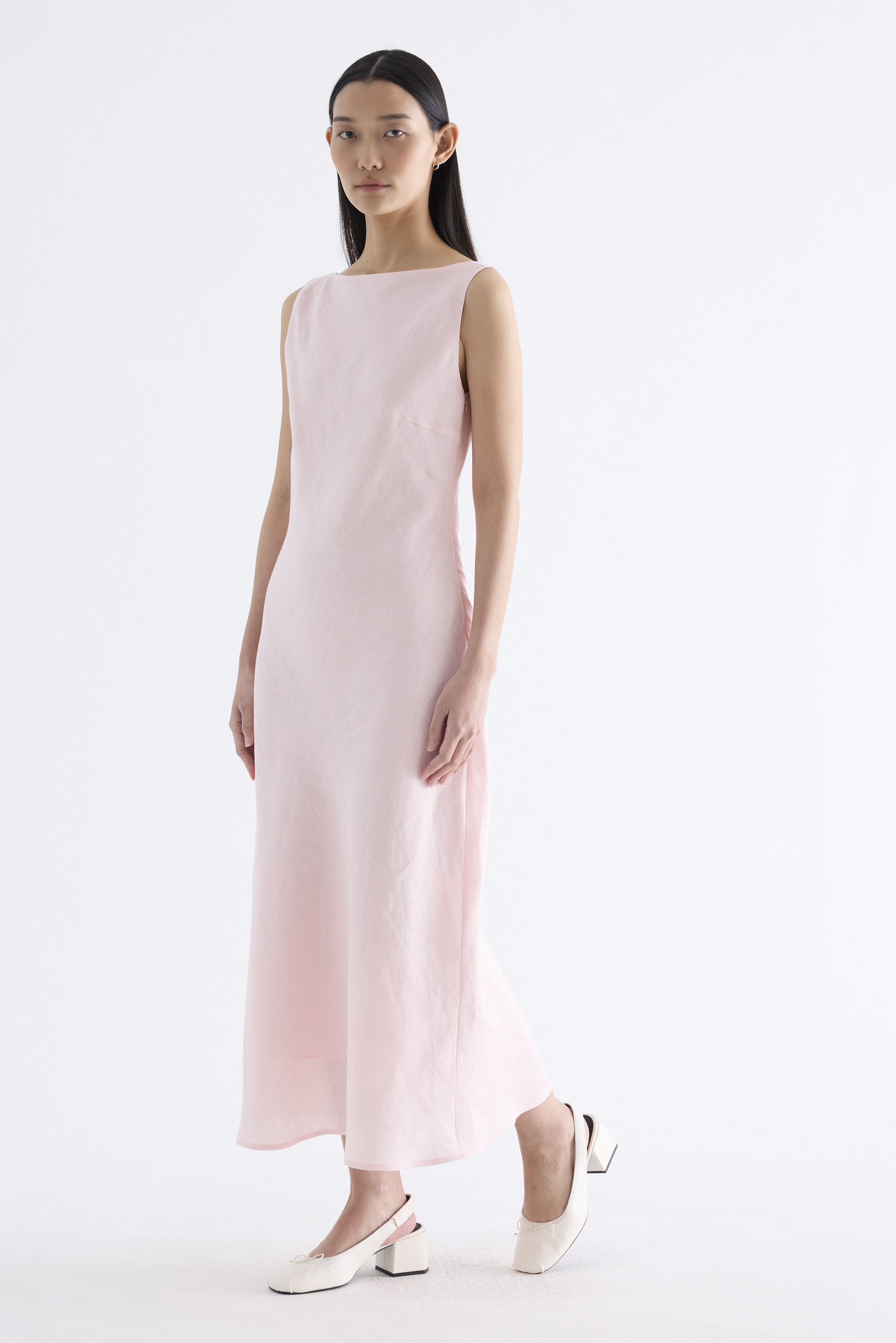 Fluid. Cut from light and airy 100% linen, this sleeveless maxi dress features a flowy bias silhouette, boat neckline and scooped back. Fits slim with a side zip closure.