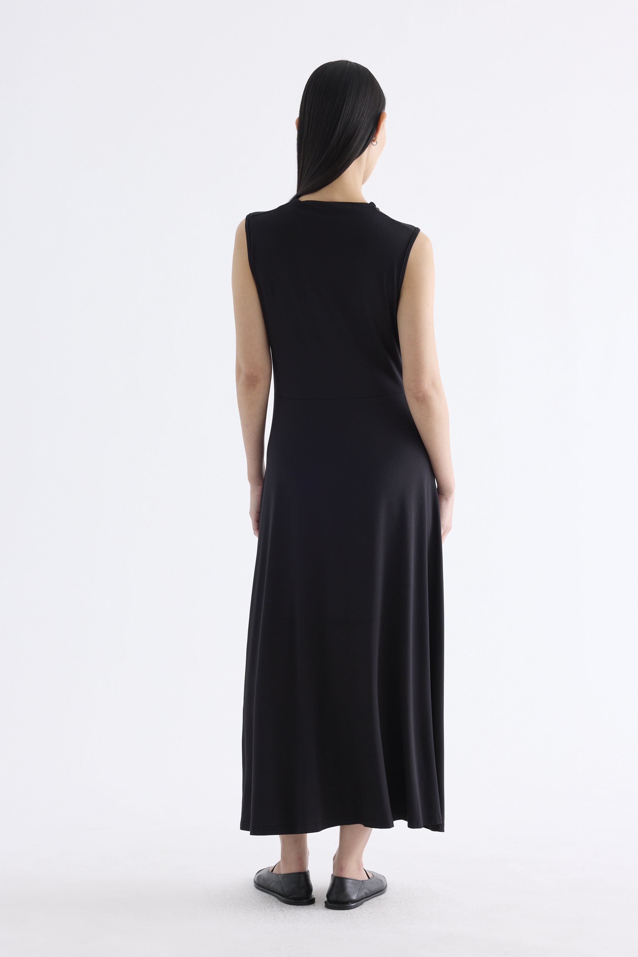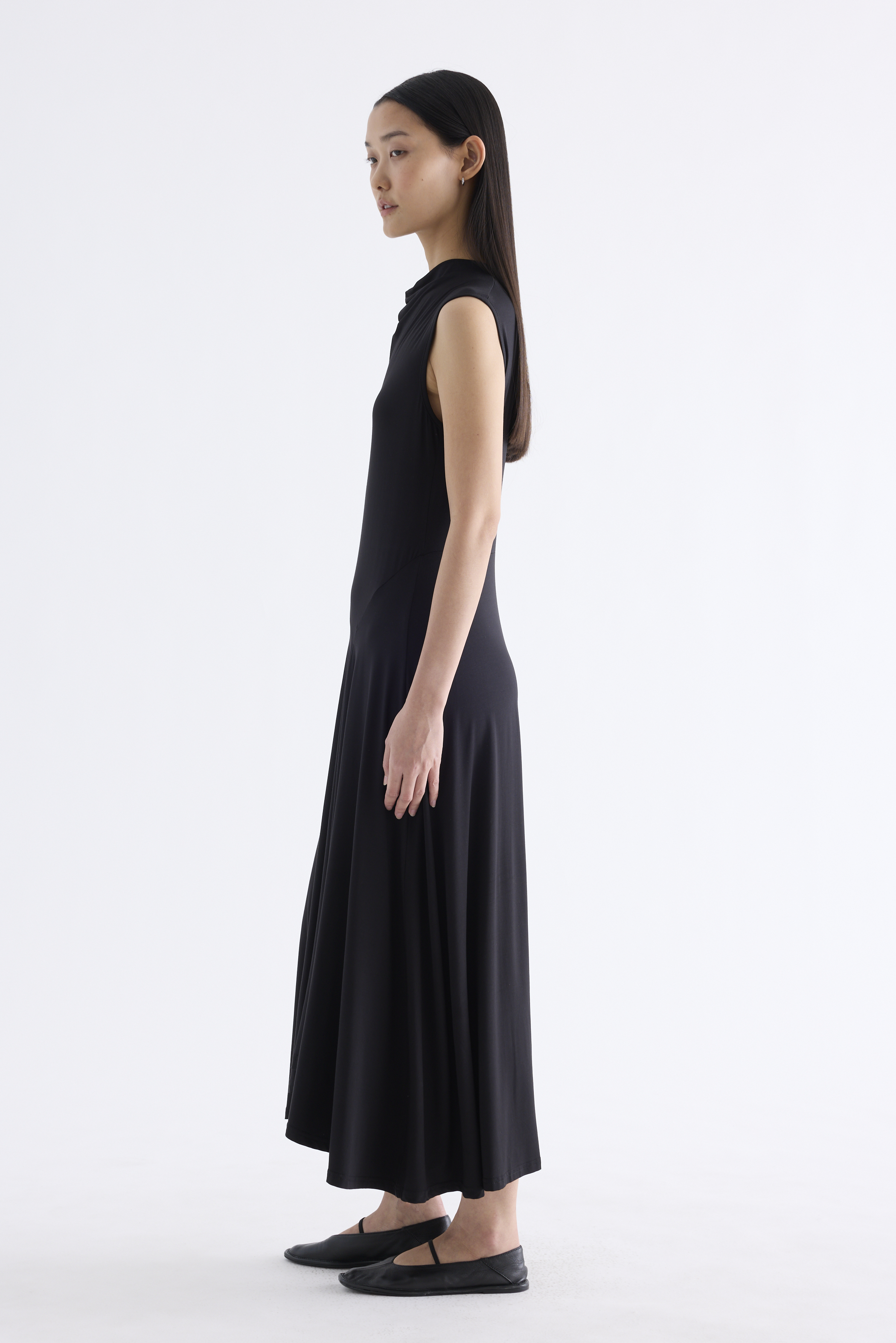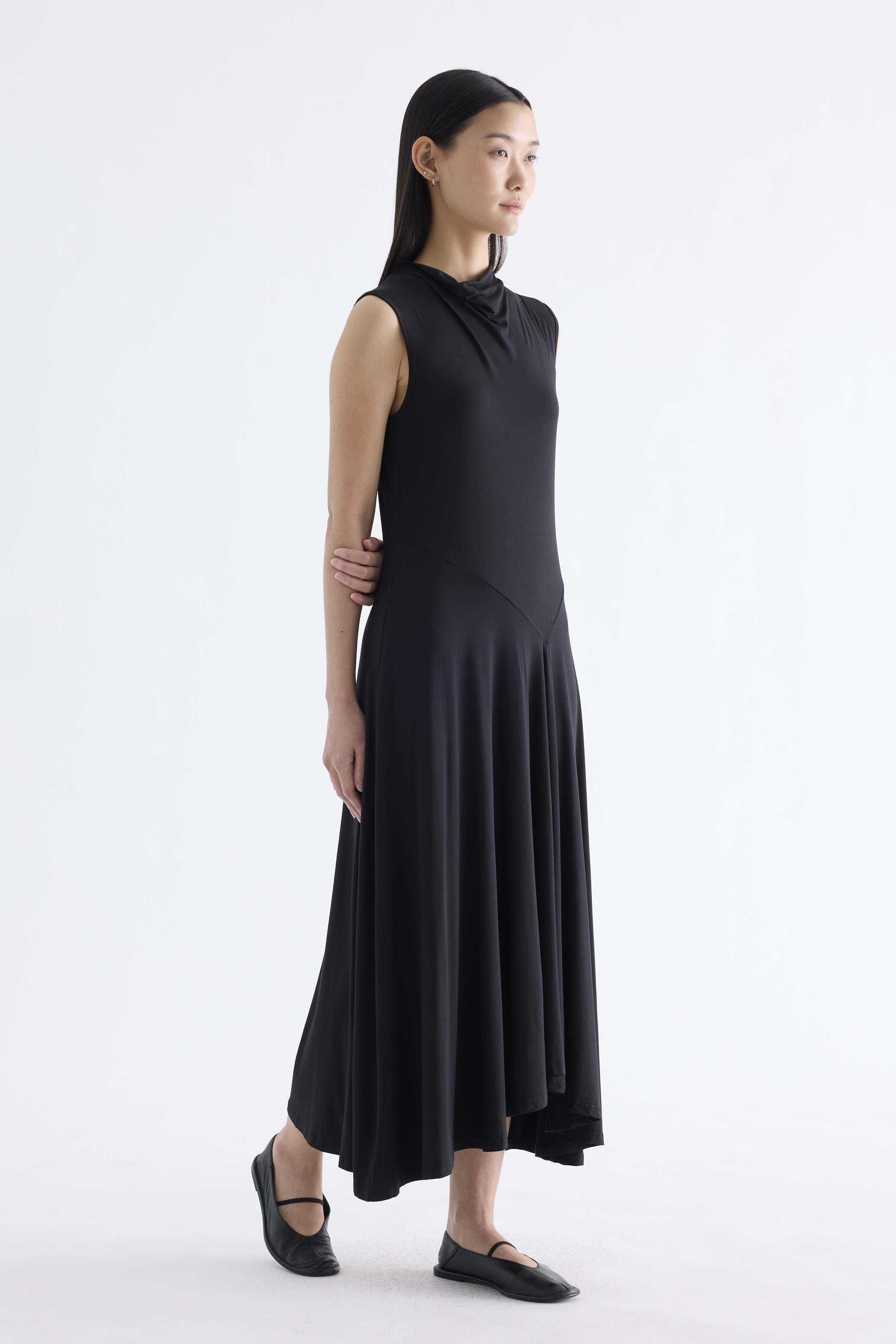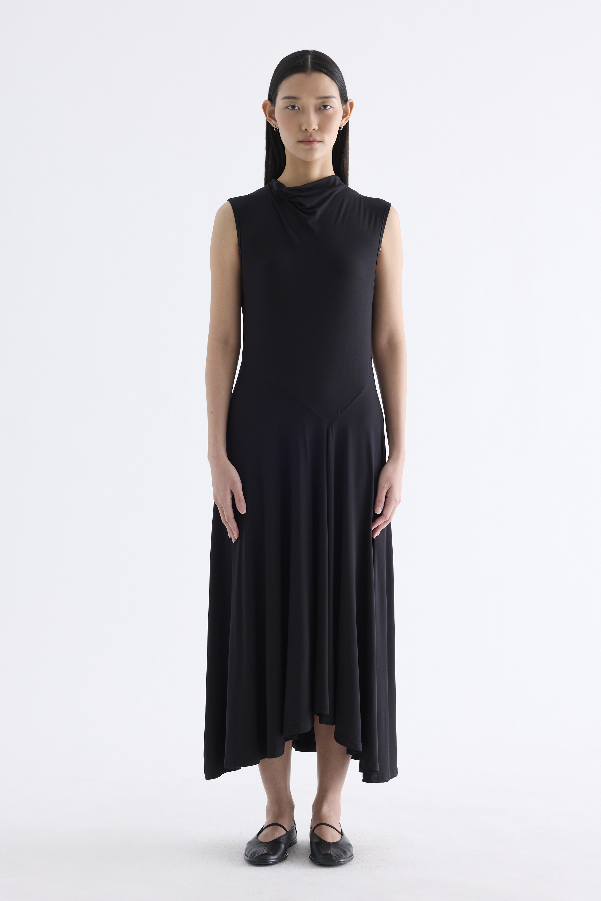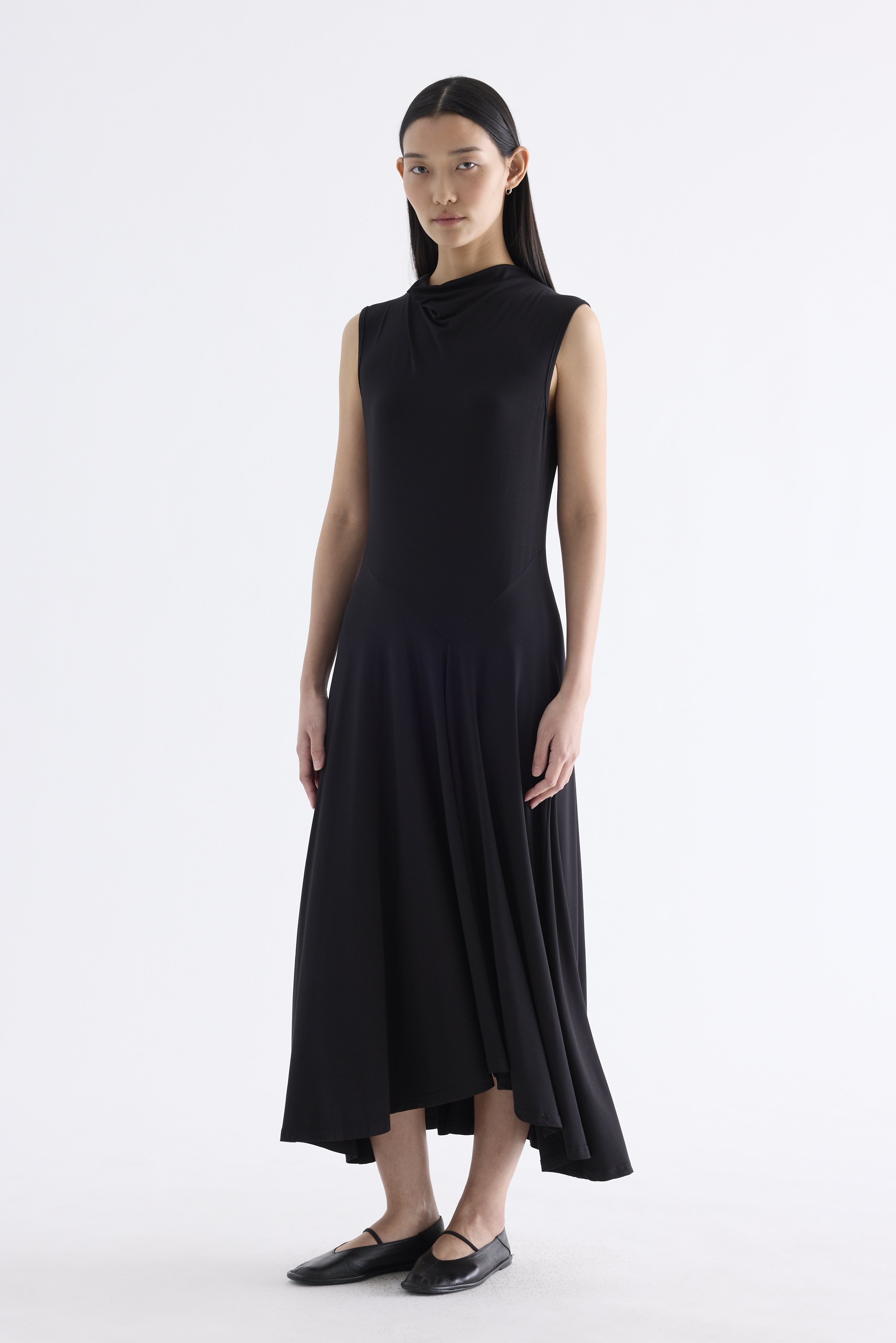 Go with the flow. Made from smooth and stretchy fabric, this sleeveless maxi dress features a draped neckline, an asymmetrical waist panel and a waterfall hem. Worn in a relaxed, body-skimming fit.