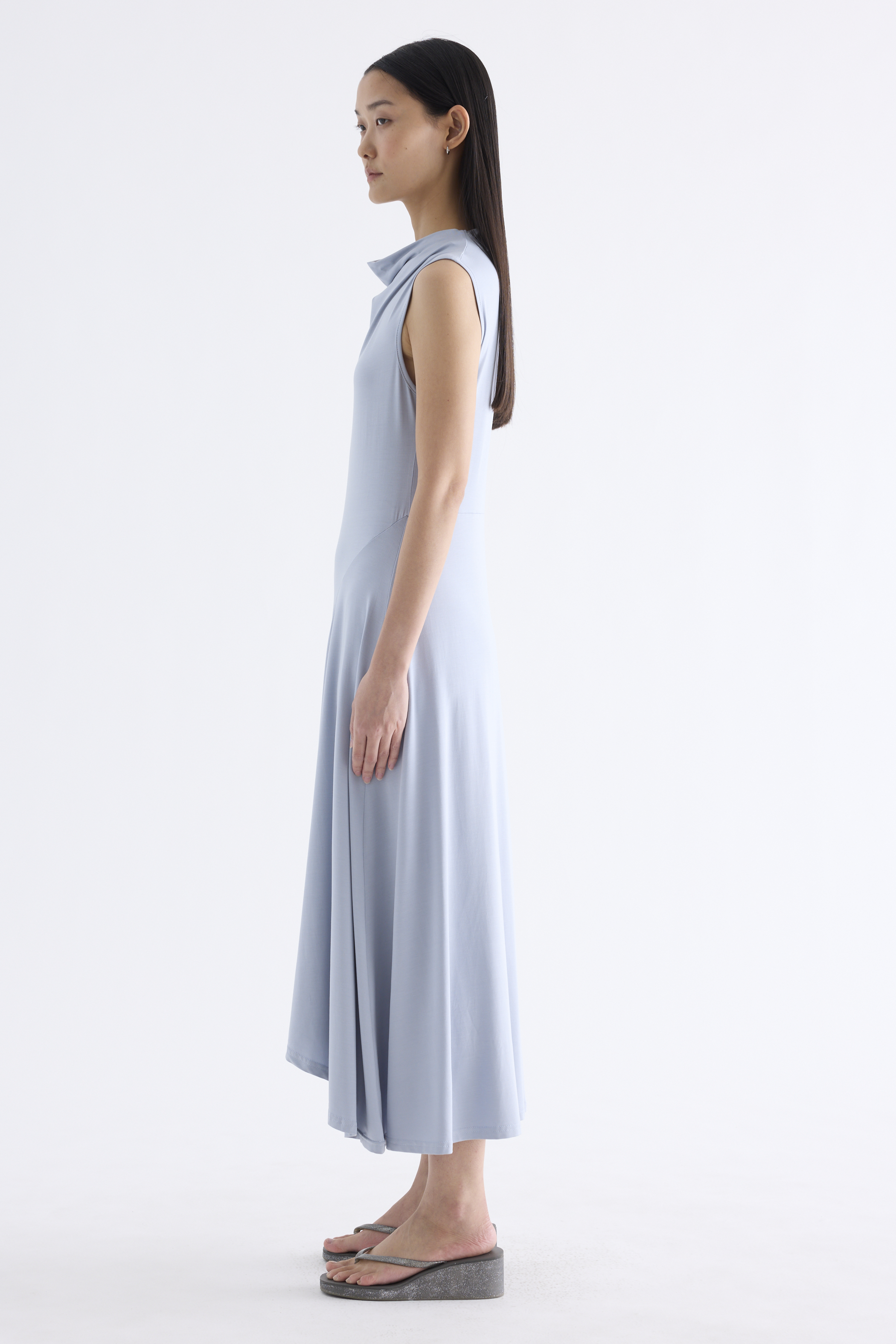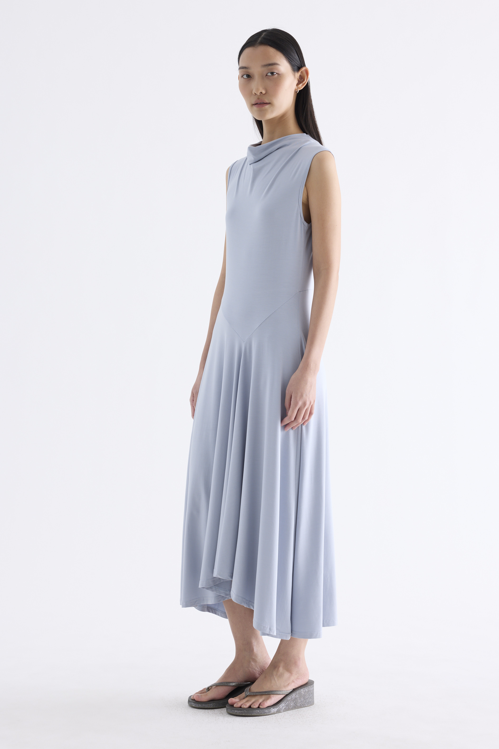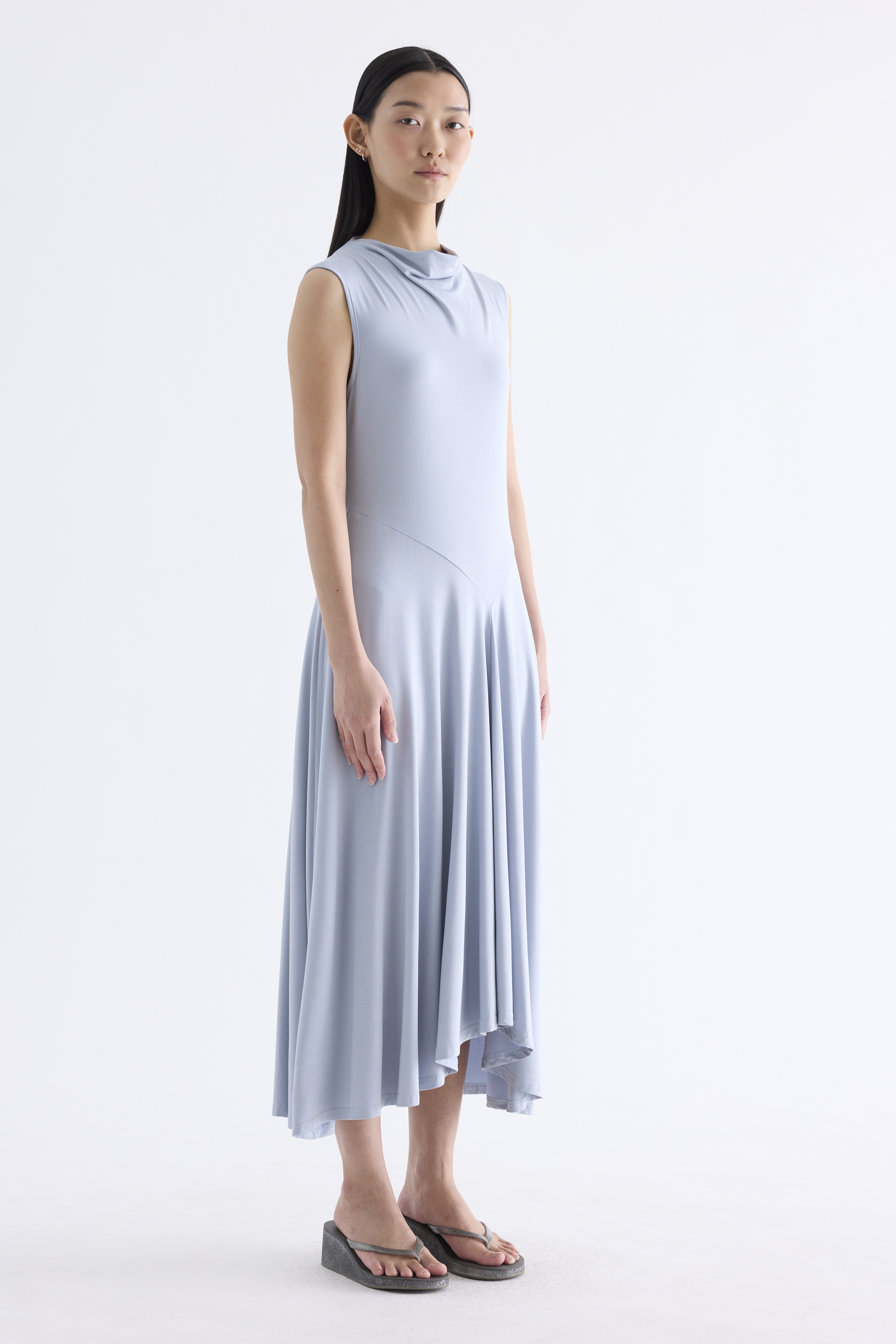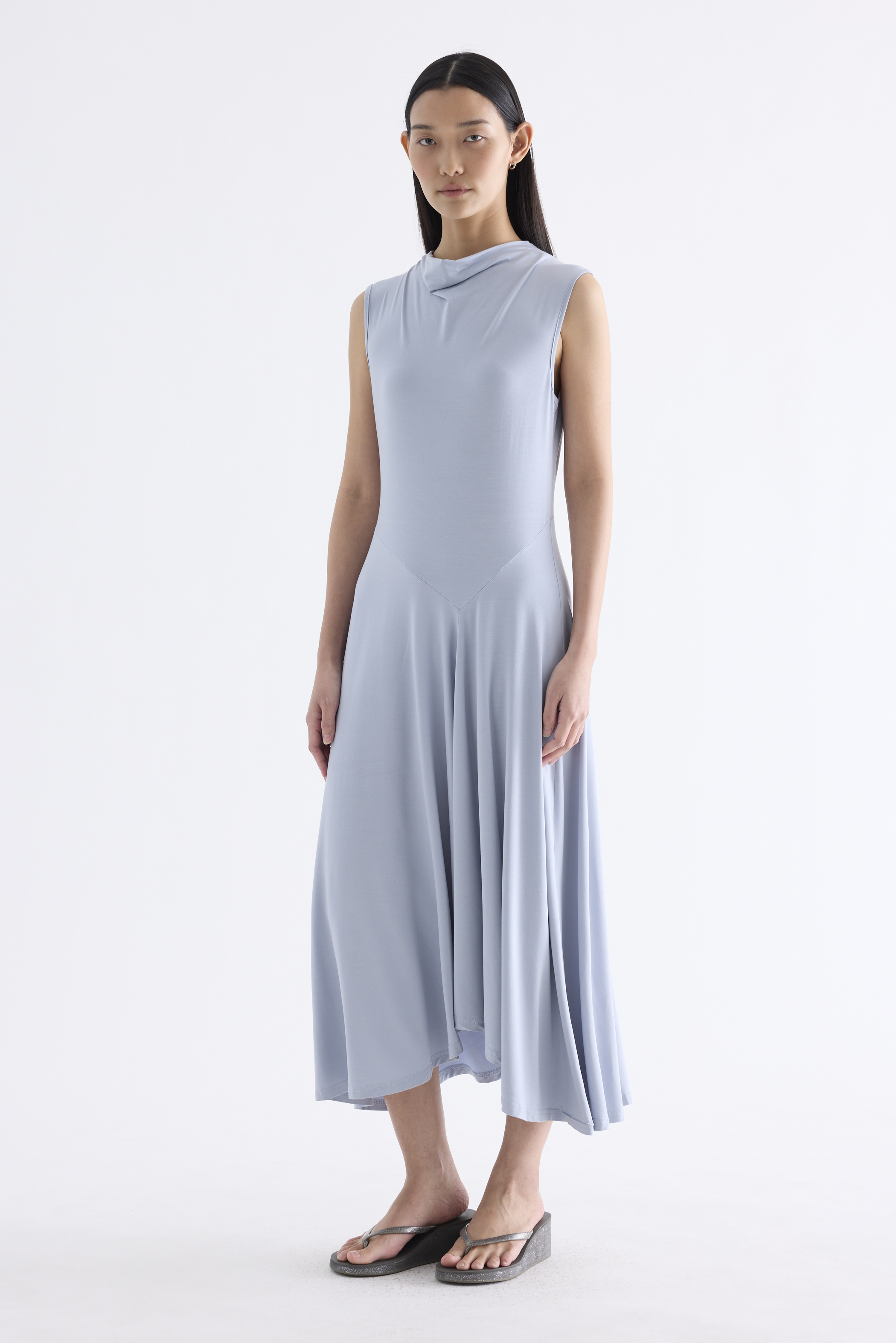 Go with the flow. Made from smooth and stretchy fabric, this sleeveless maxi dress features a draped neckline, an asymmetrical waist panel and a waterfall hem. Worn in a relaxed, body-skimming fit.