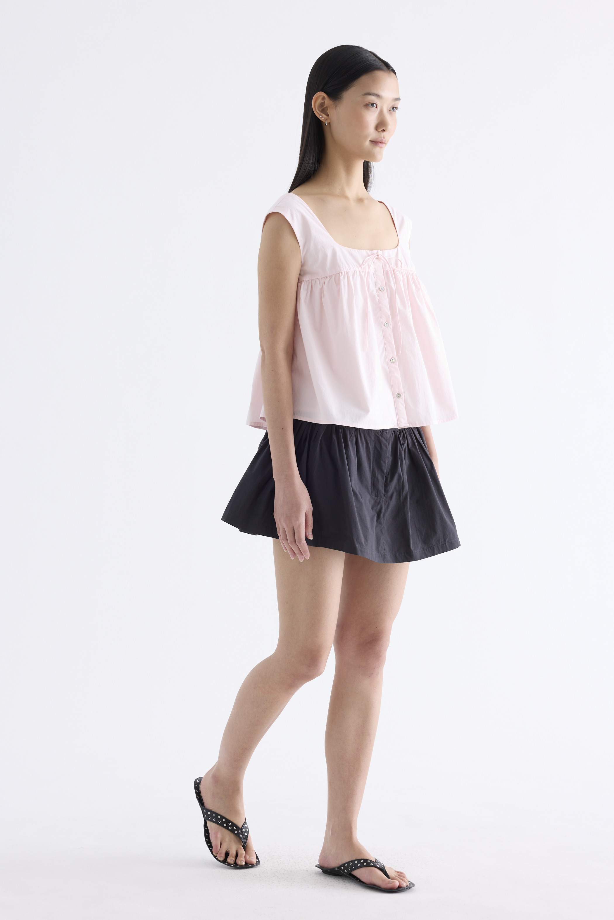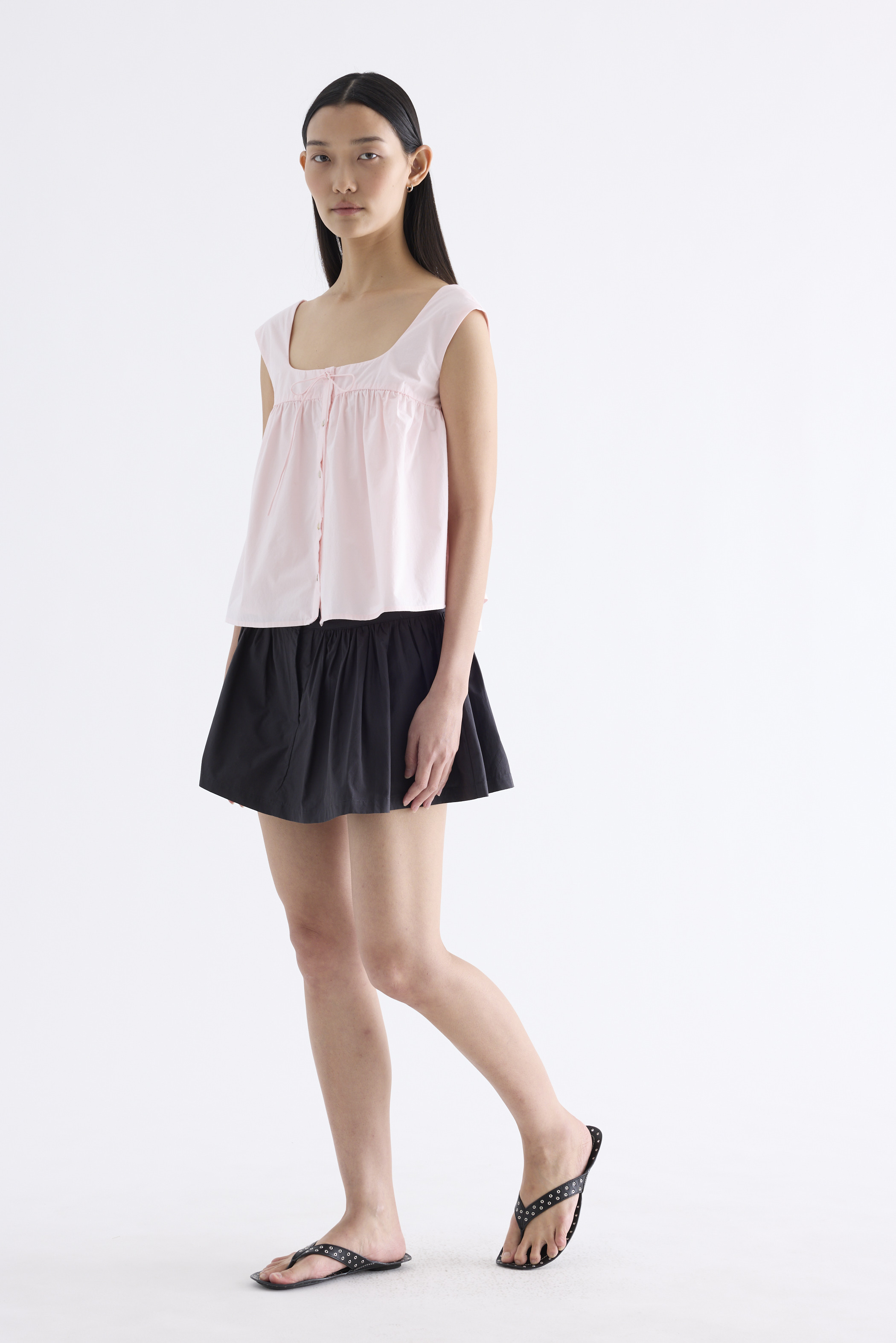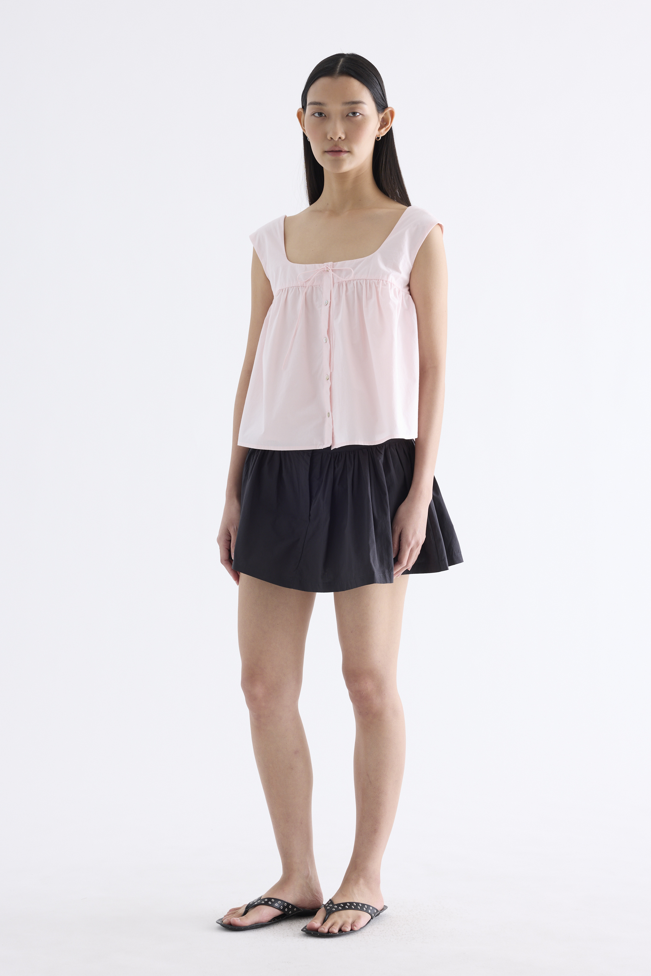 For the love of details. Made from crisp and softly structured cotton, this gathered top features a square neckline with a front tie-strap, cap sleeves and a button-down front. Fits relaxed in a flared silhouette.