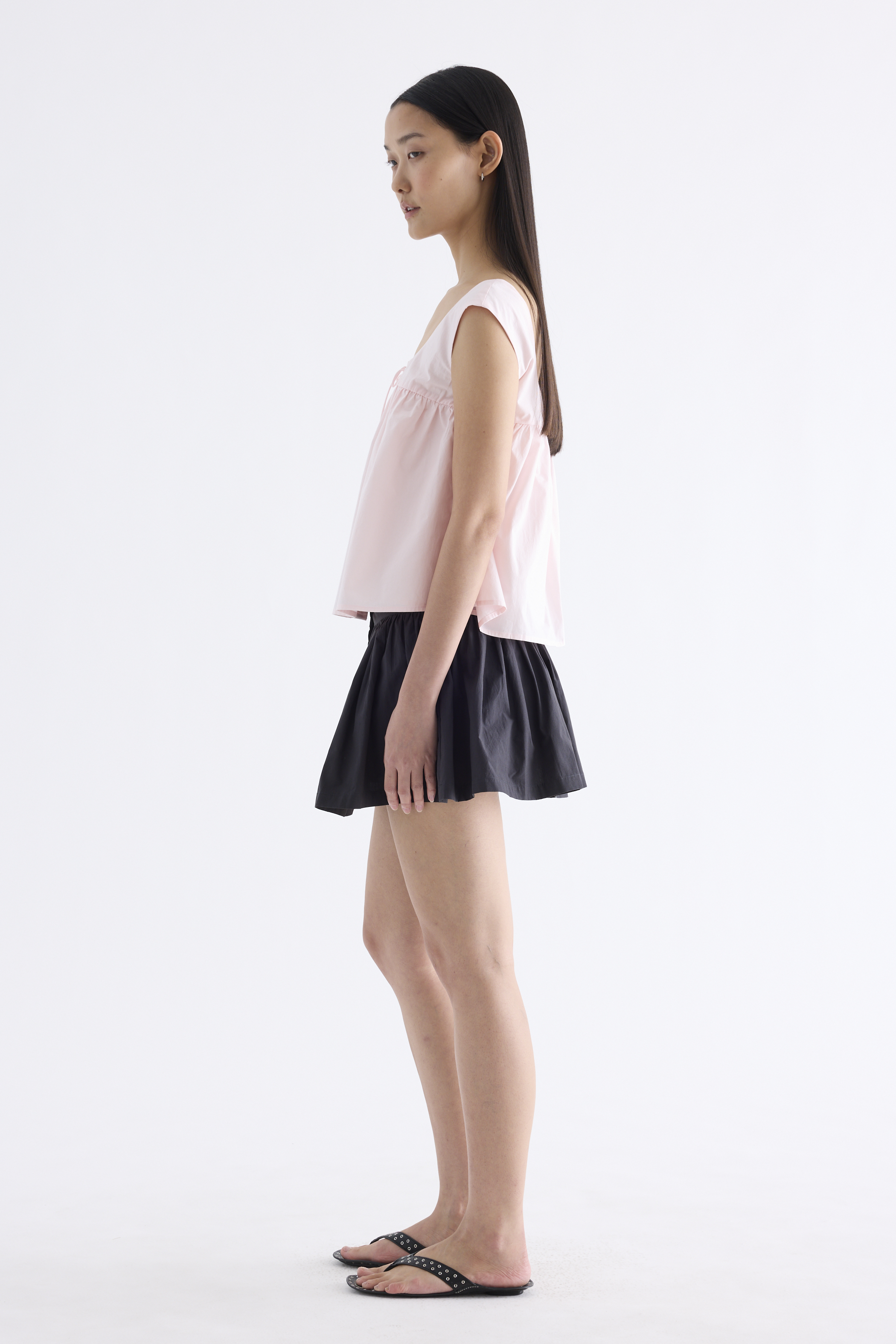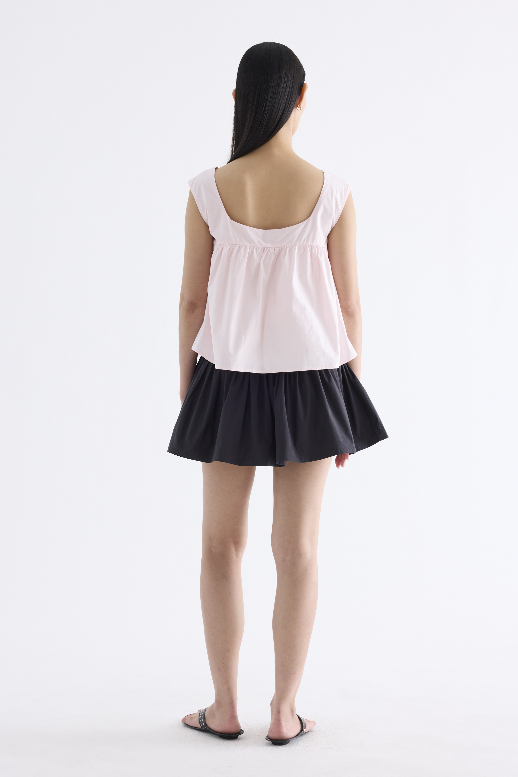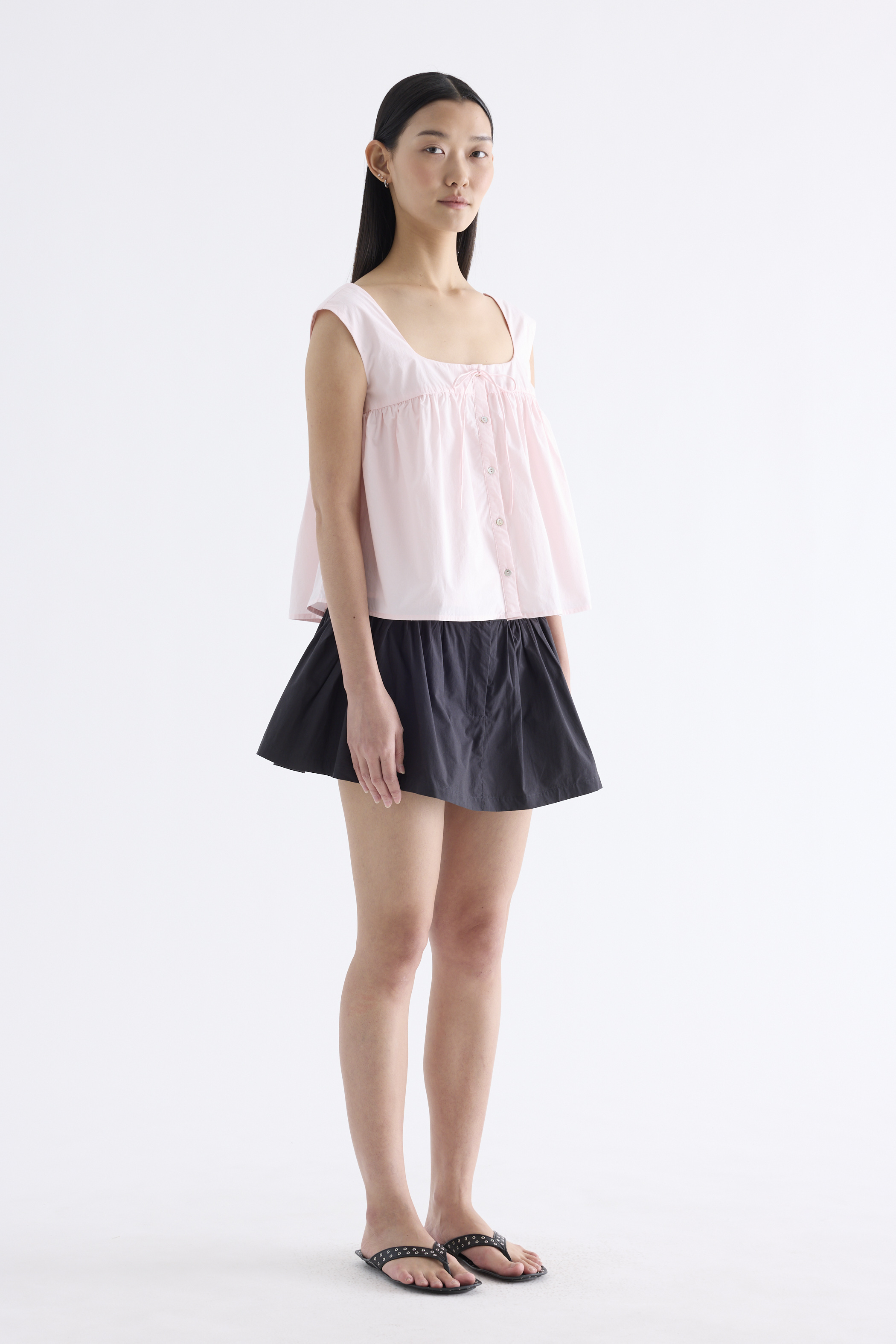 For the love of details. Made from crisp and softly structured cotton, this gathered top features a square neckline with a front tie-strap, cap sleeves and a button-down front. Fits relaxed in a flared silhouette.