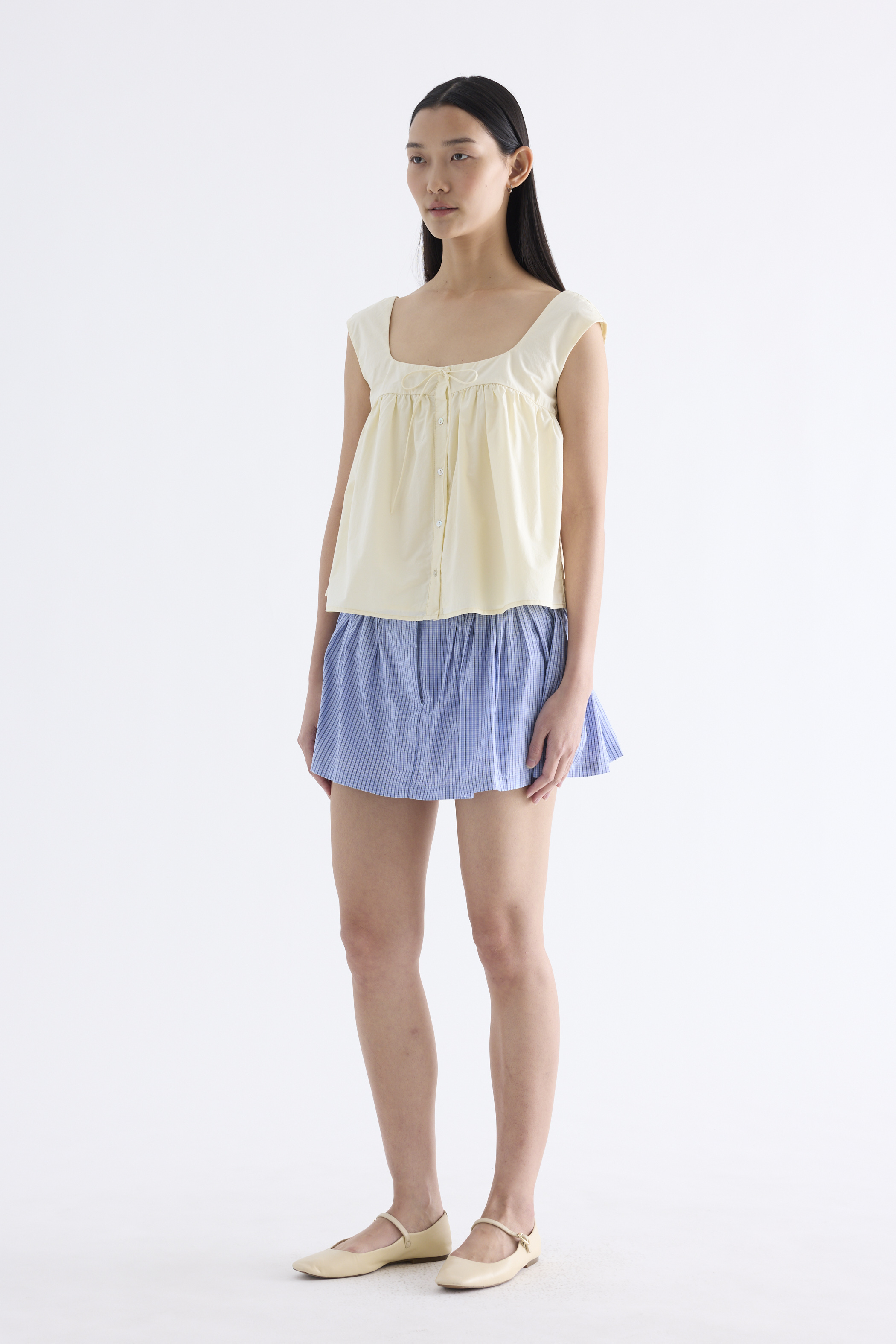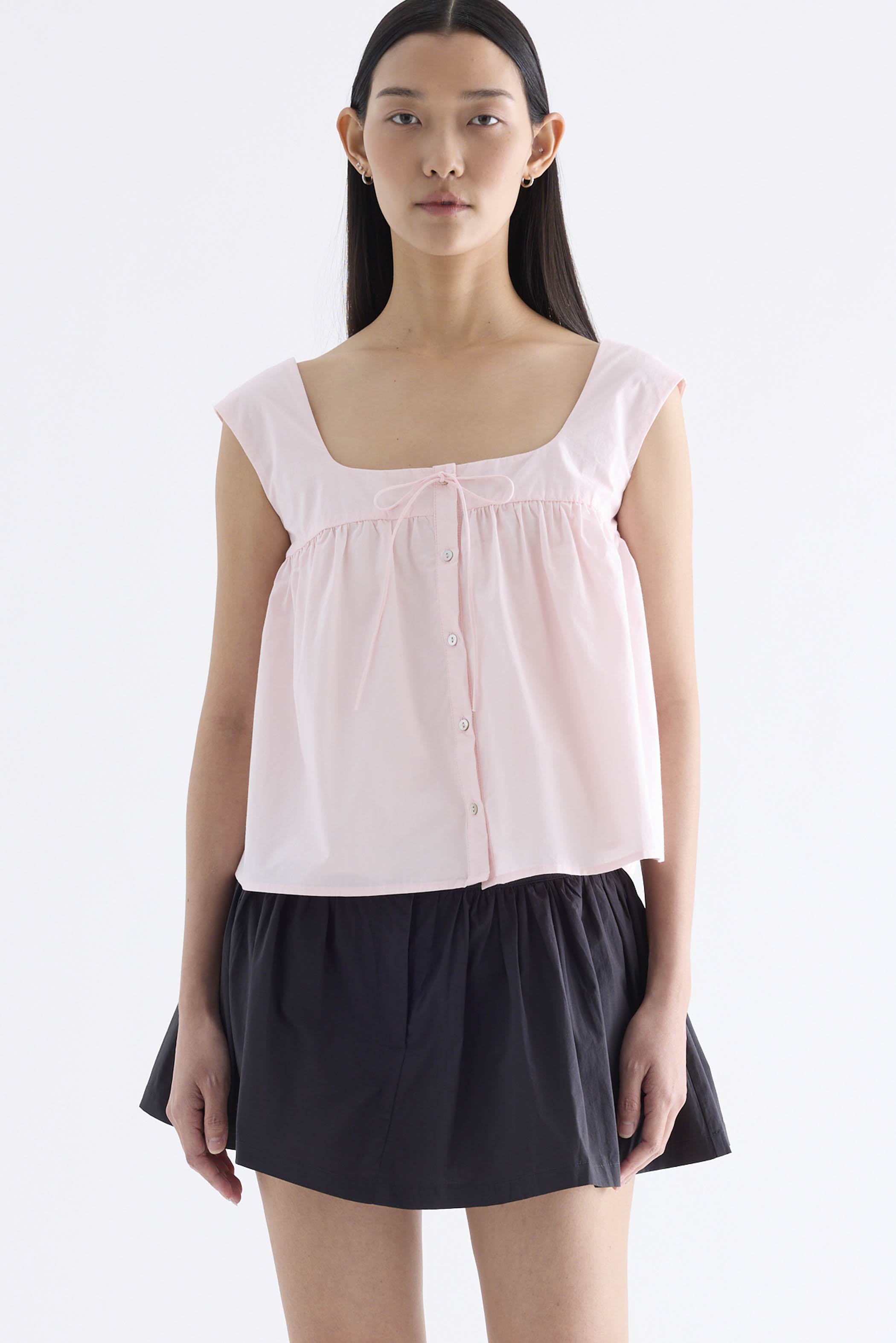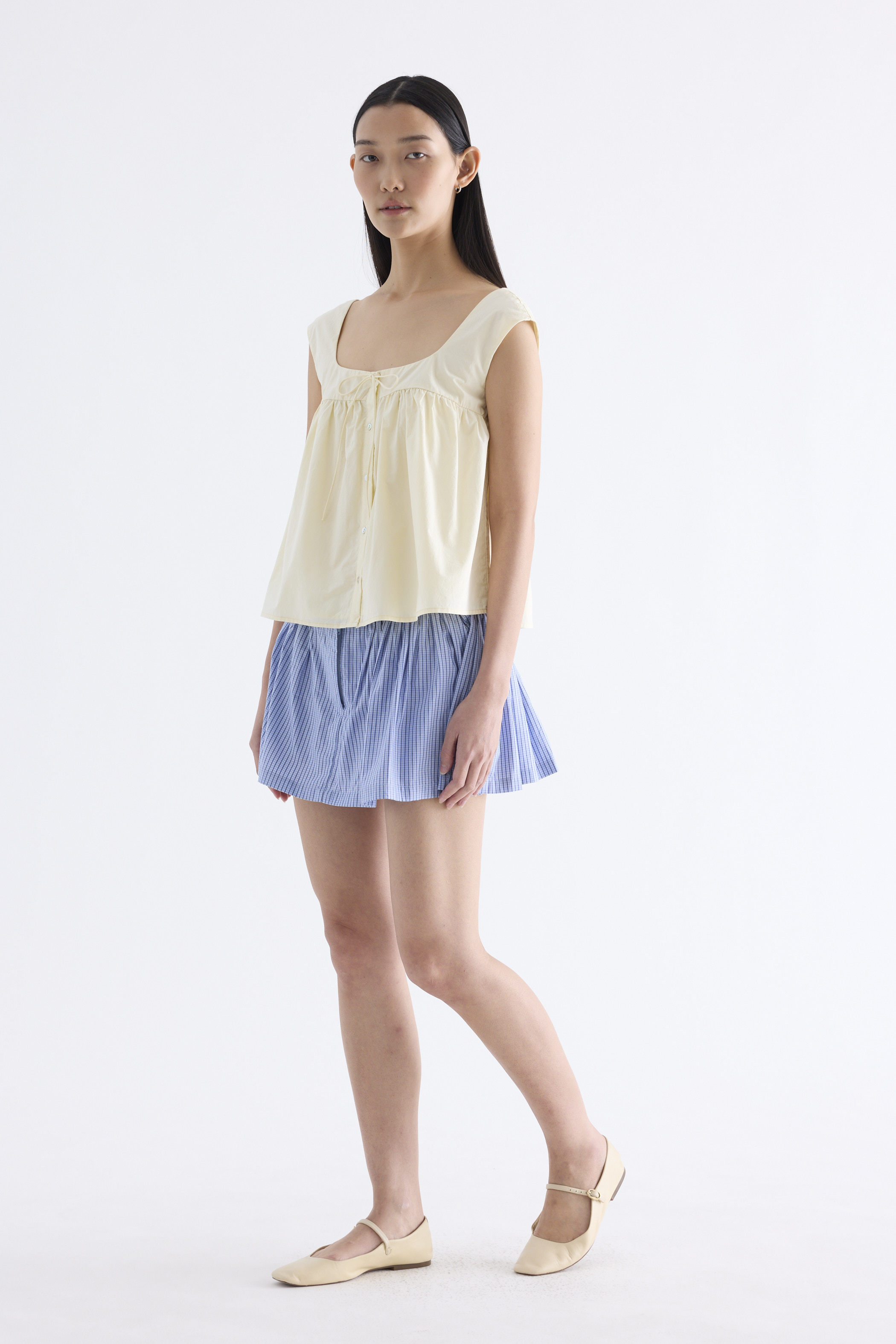 For the love of details. Made from crisp and softly structured cotton, this gathered top features a square neckline with a front tie-strap, cap sleeves and a button-down front. Fits relaxed in a flared silhouette.