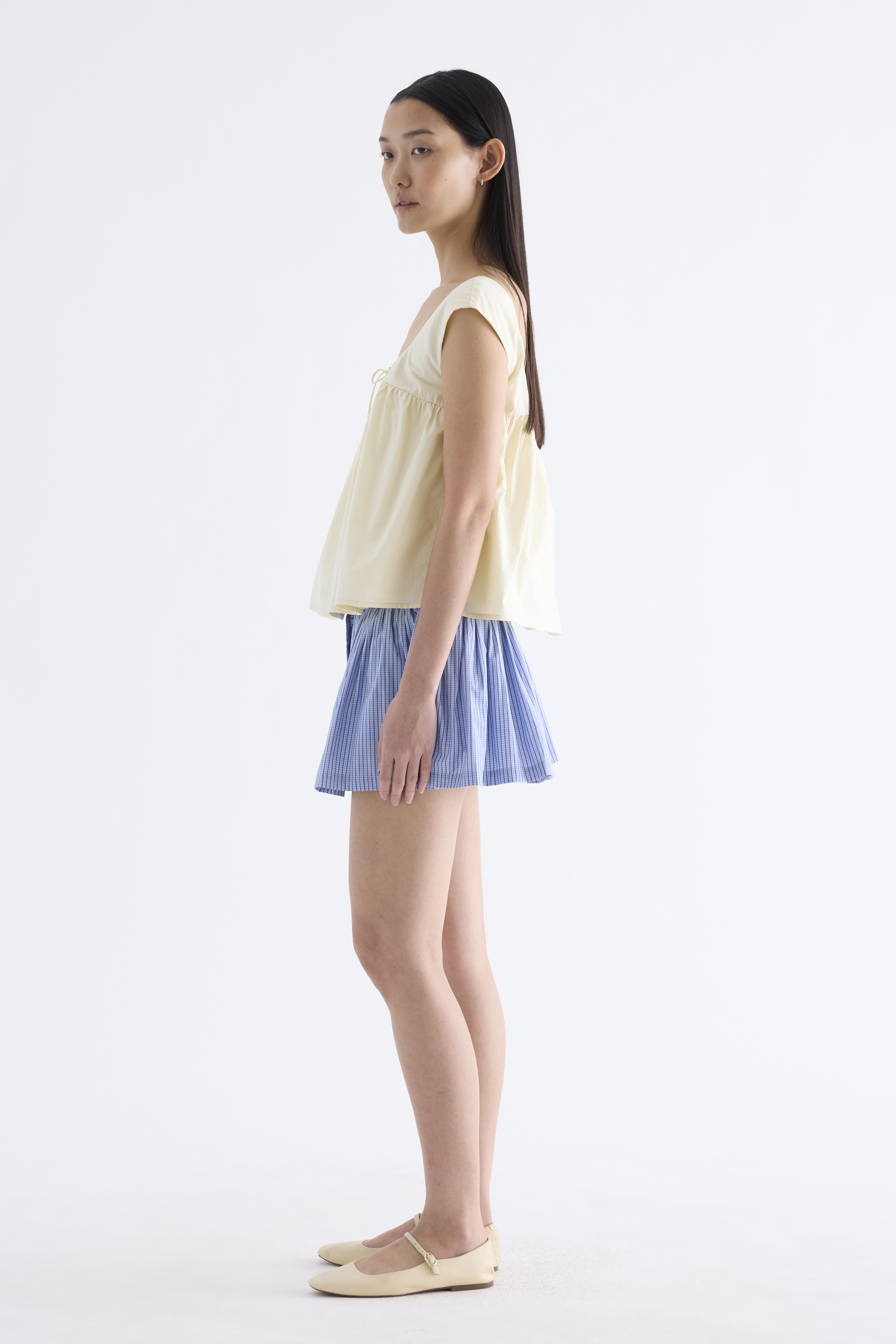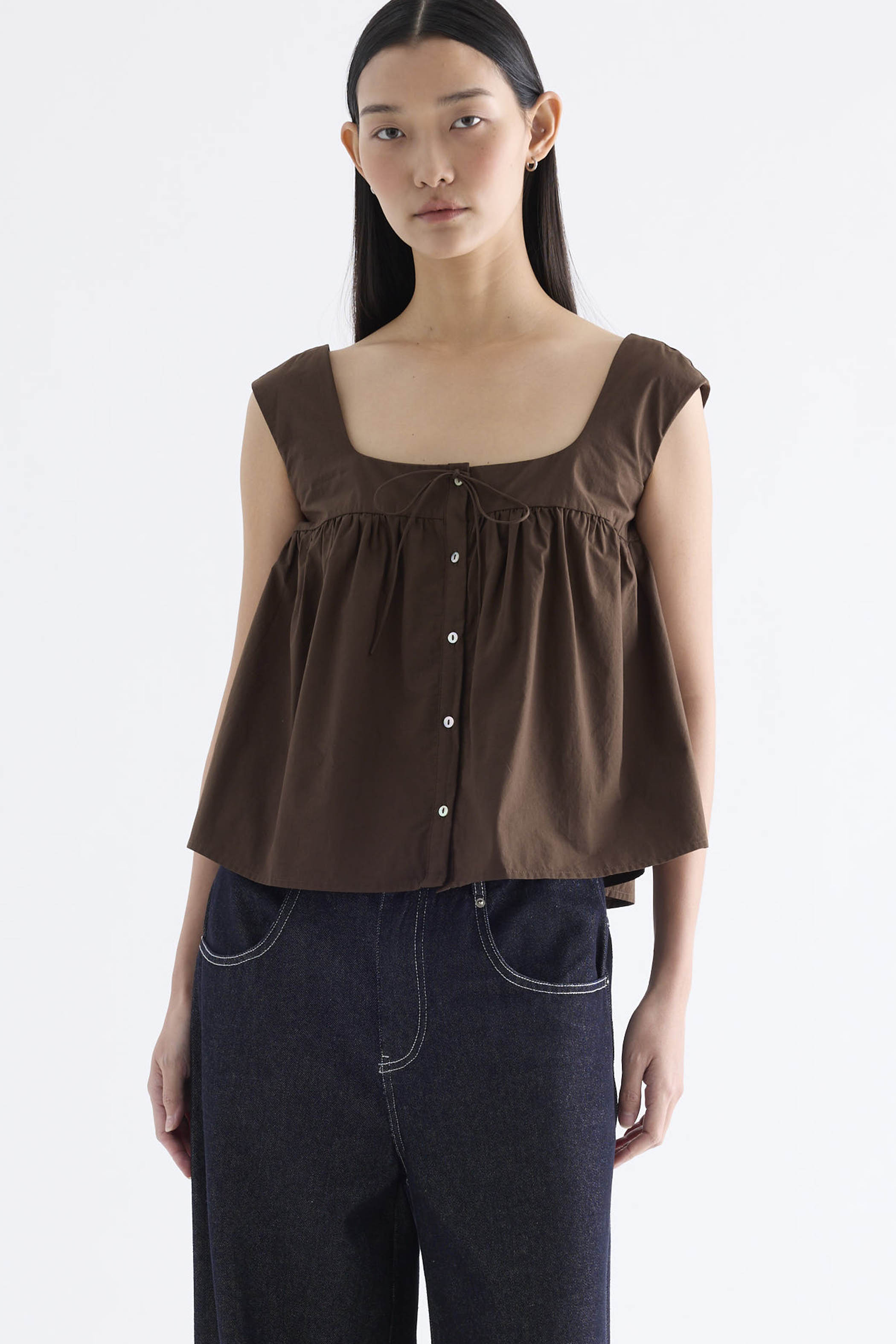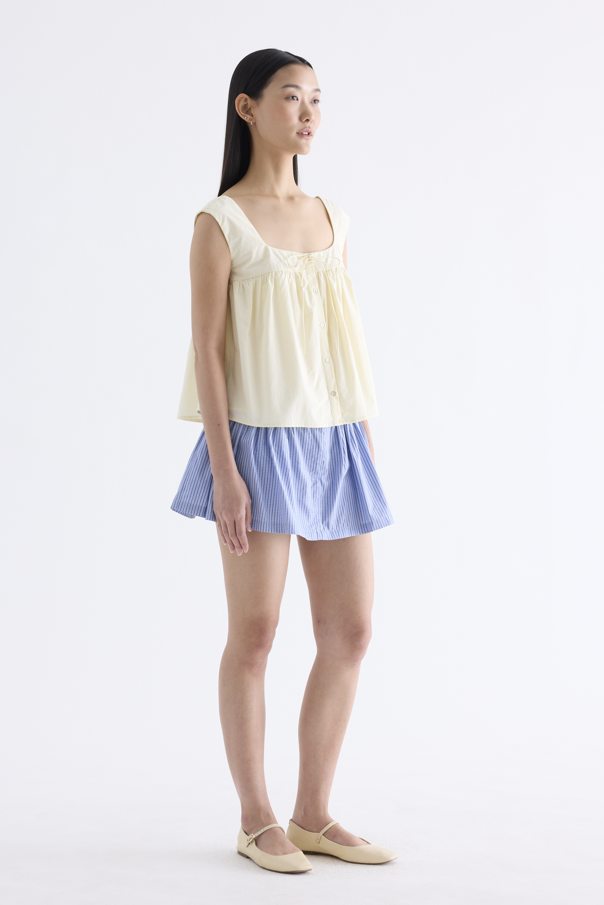 For the love of details. Made from crisp and softly structured cotton, this gathered top features a square neckline with a front tie-strap, cap sleeves and a button-down front. Fits relaxed in a flared silhouette.