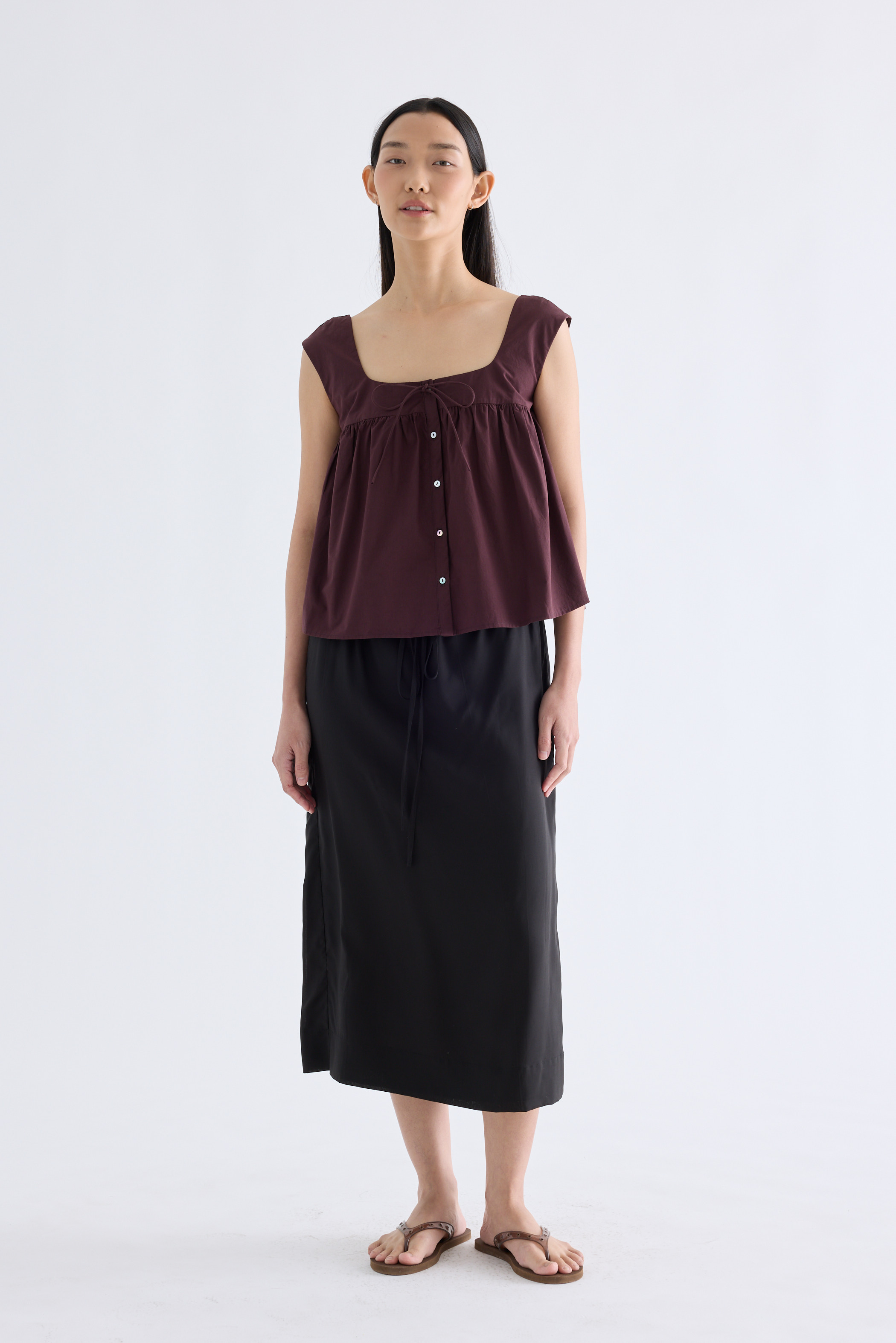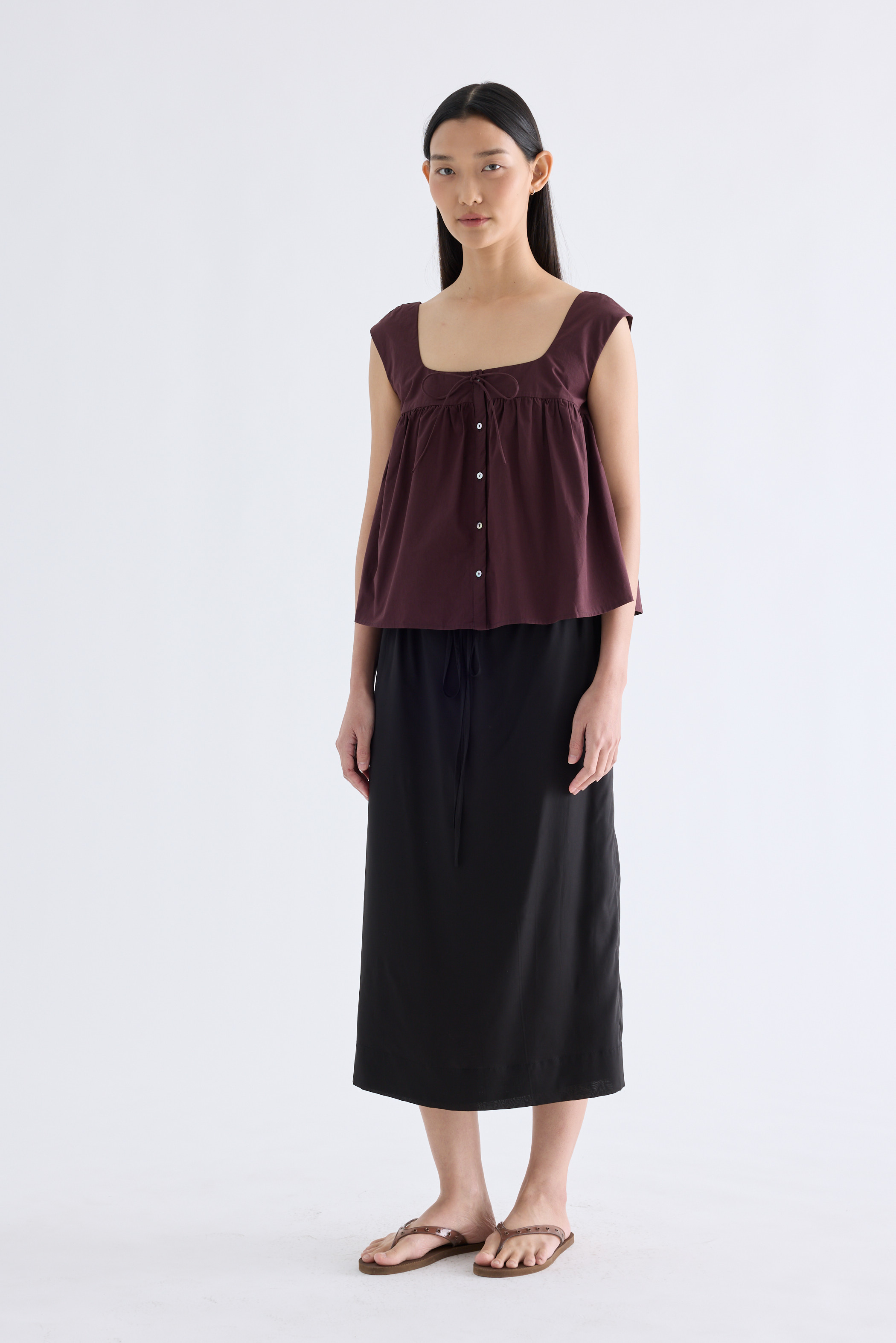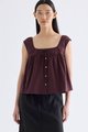 For the love of details. Made from crisp and softly structured cotton, this gathered top features a square neckline with a front tie-strap, cap sleeves and a button-down front. Fits relaxed in a flared silhouette.