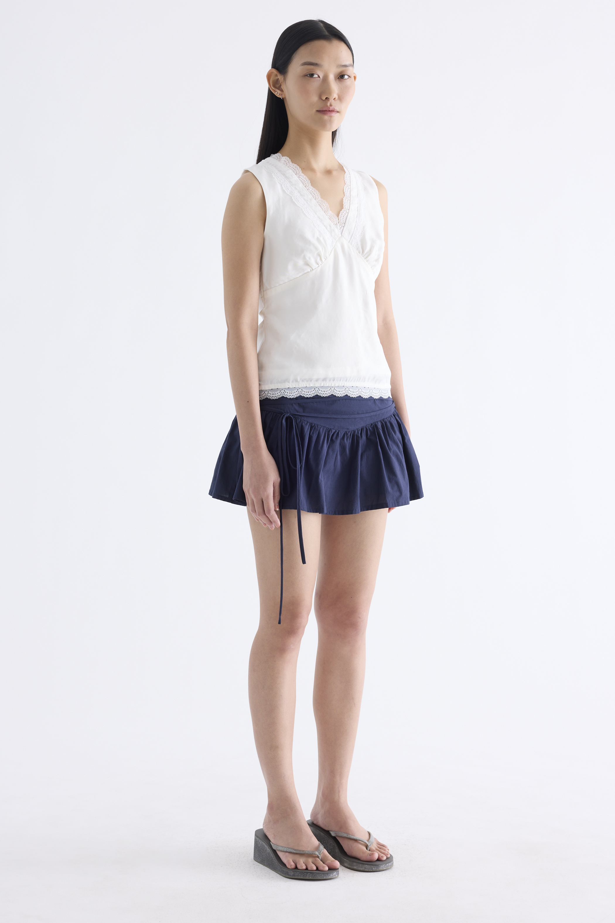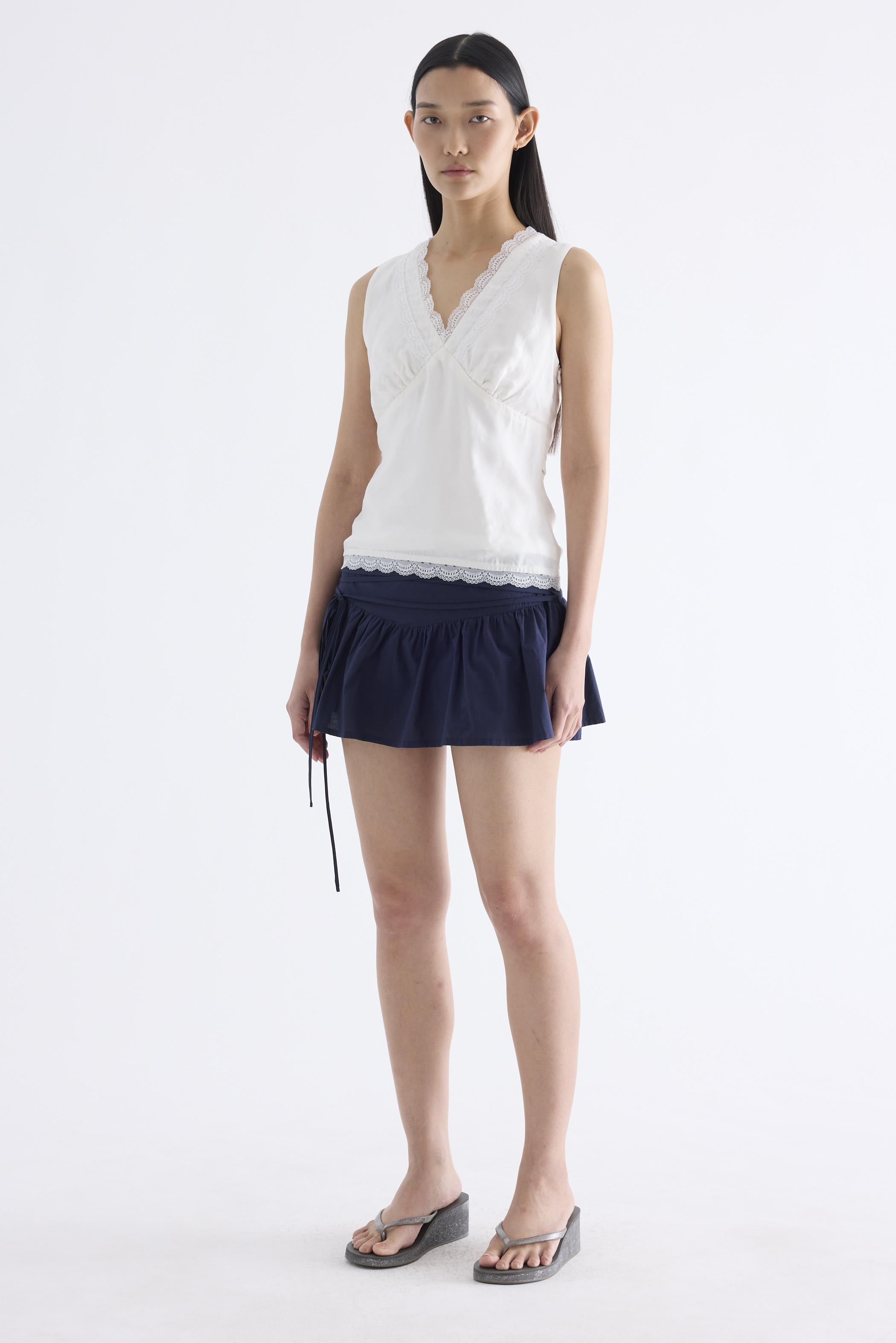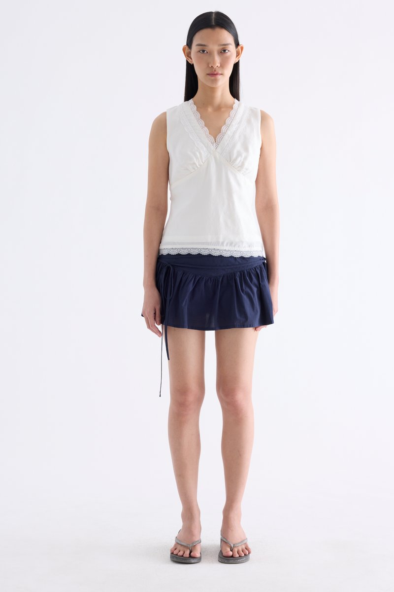Form flattering, Made from smooth and light fabric, this sleeveless top features a lace-trimmed V-neckline, ruched bust, side zip and fitted waist with back tie straps. Worn in a slim fit.