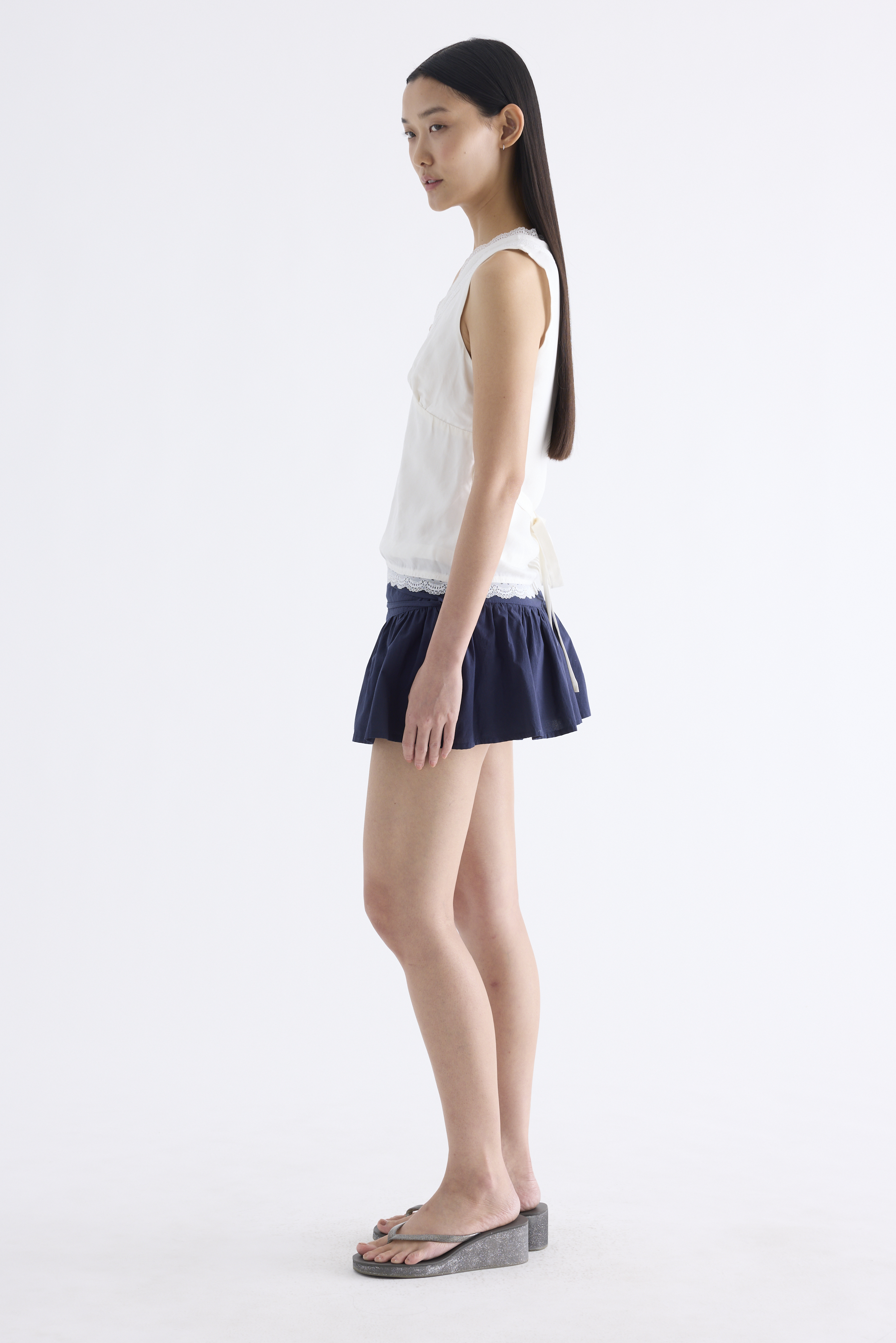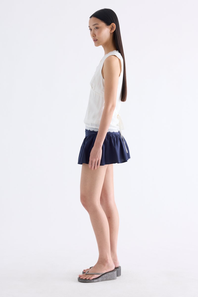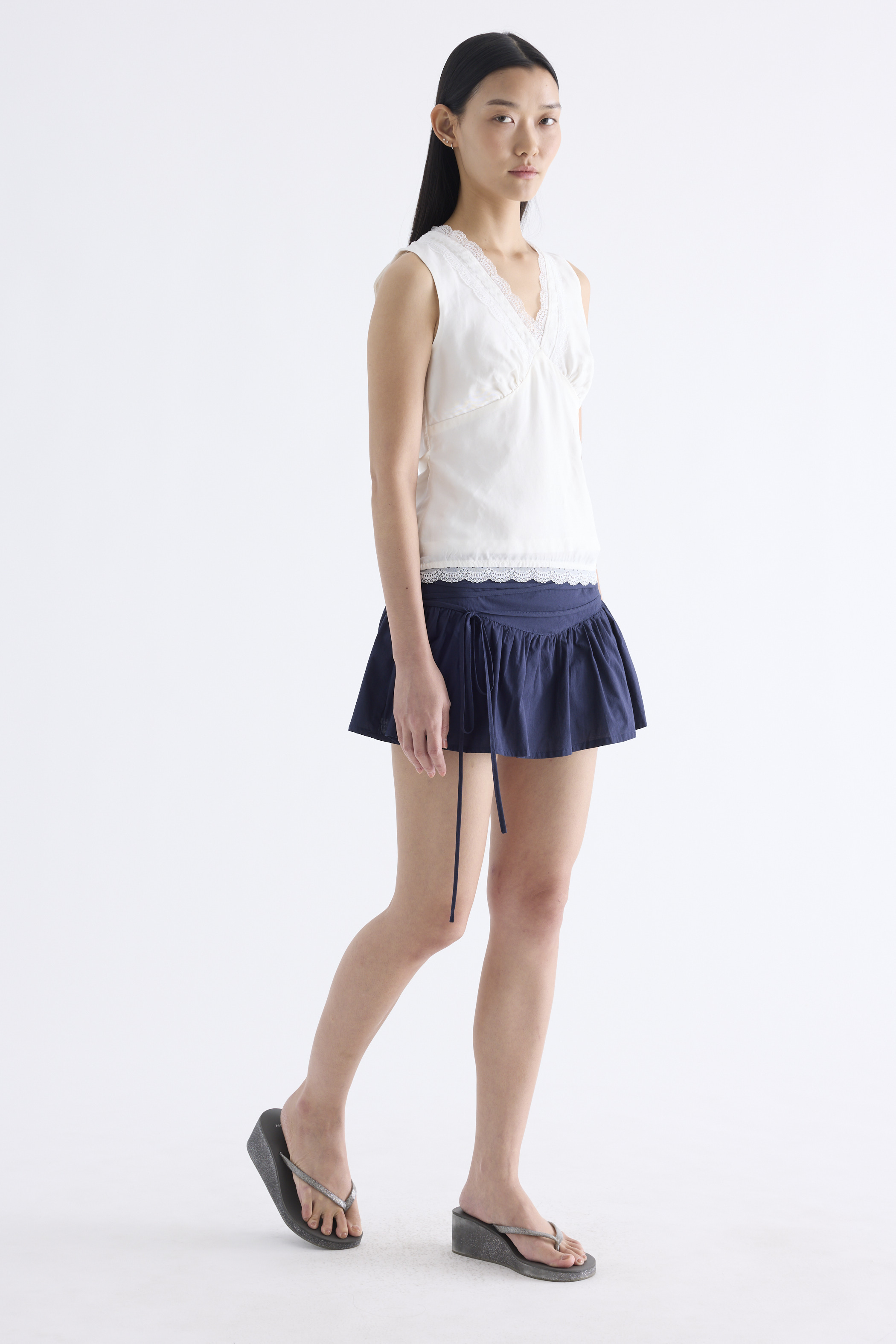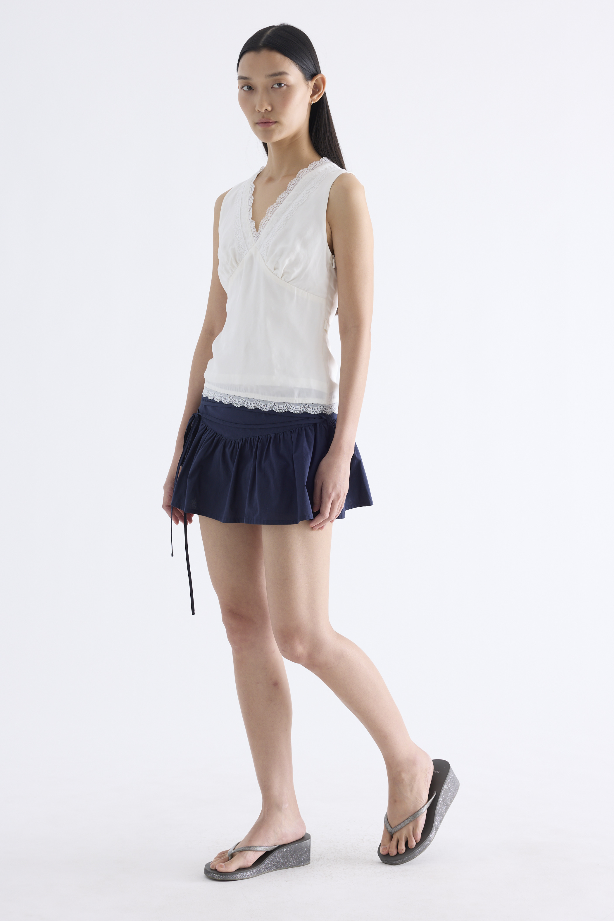 Form flattering, Made from smooth and light fabric, this sleeveless top features a lace-trimmed V-neckline, ruched bust, side zip and fitted waist with back tie straps. Worn in a slim fit.