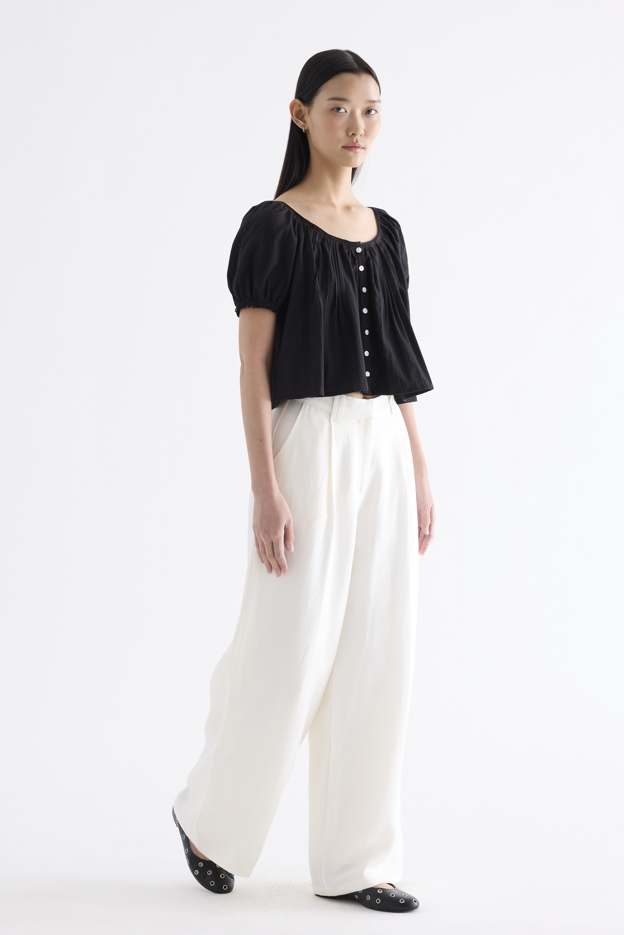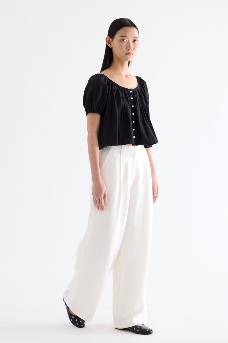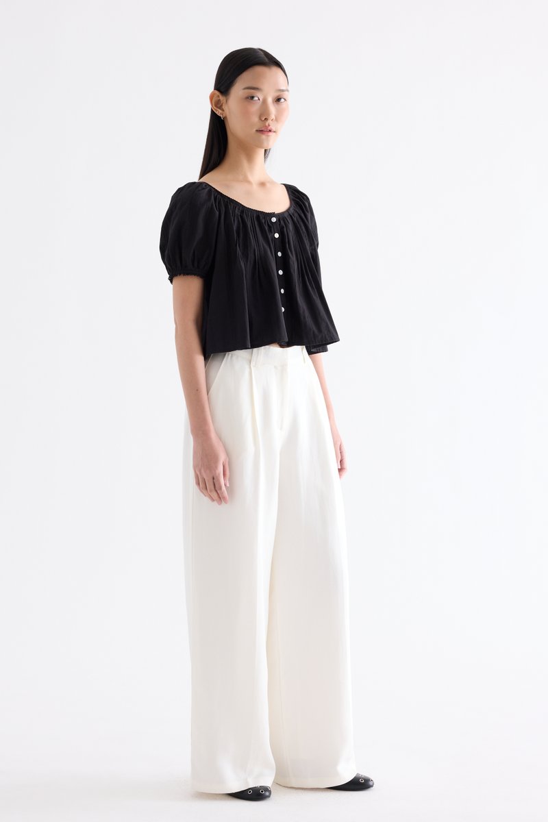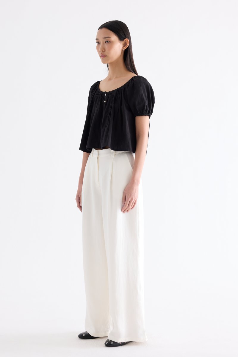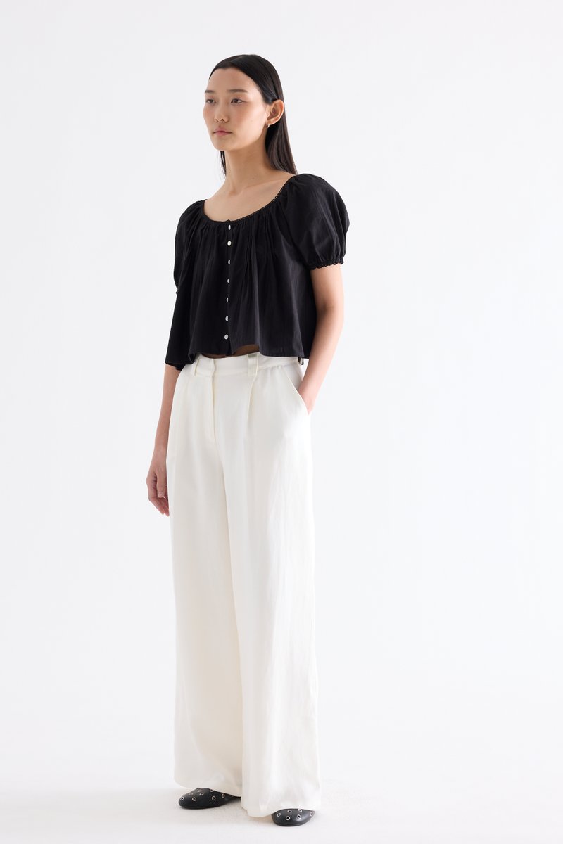 Volume up. Made from airy and striped cotton, this blouse features pleats, a lace-trimmed scoop neckline, short puffy sleeves with an elasticated lace-trimmed hem and a button-down front. Worn in a relaxed fit.