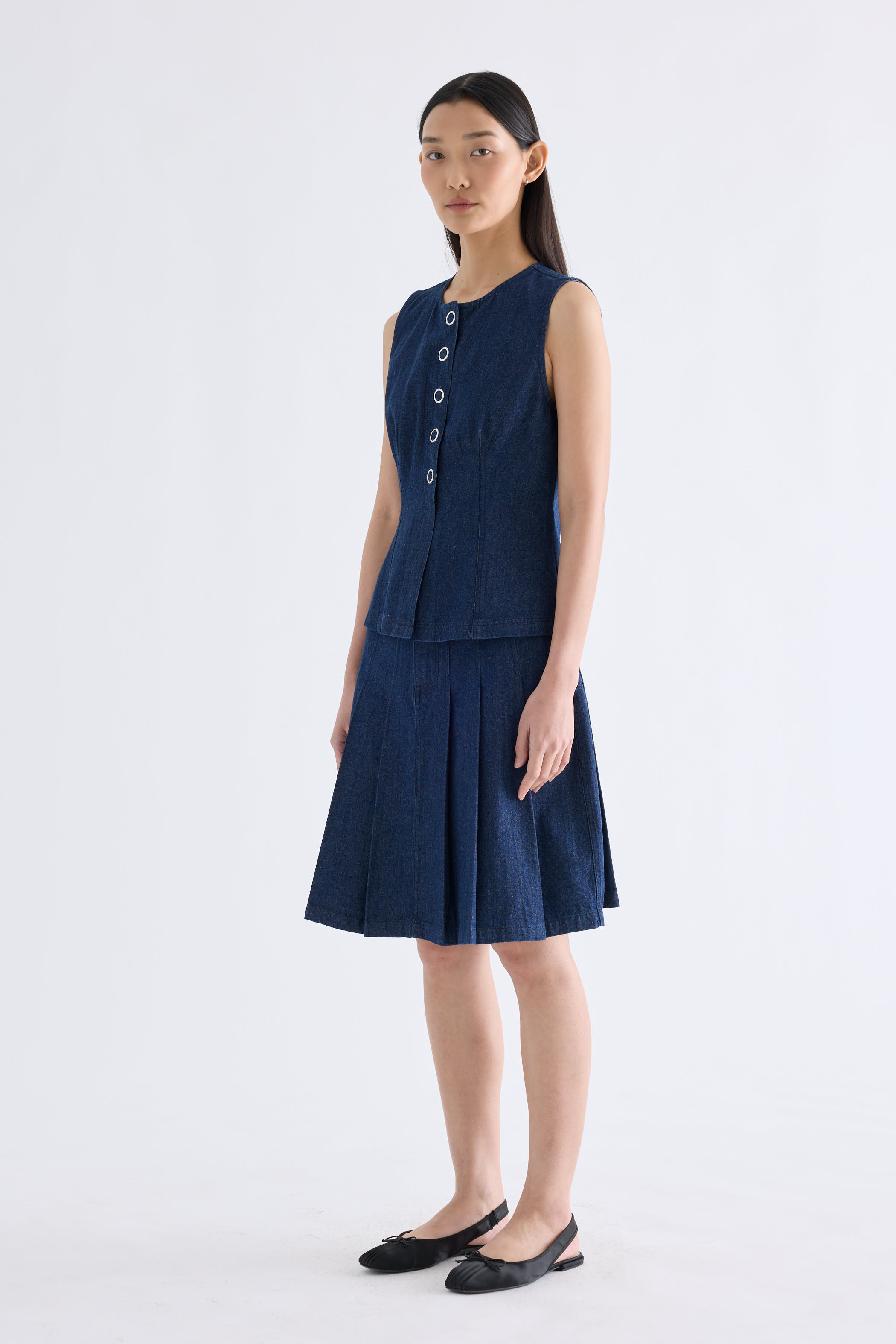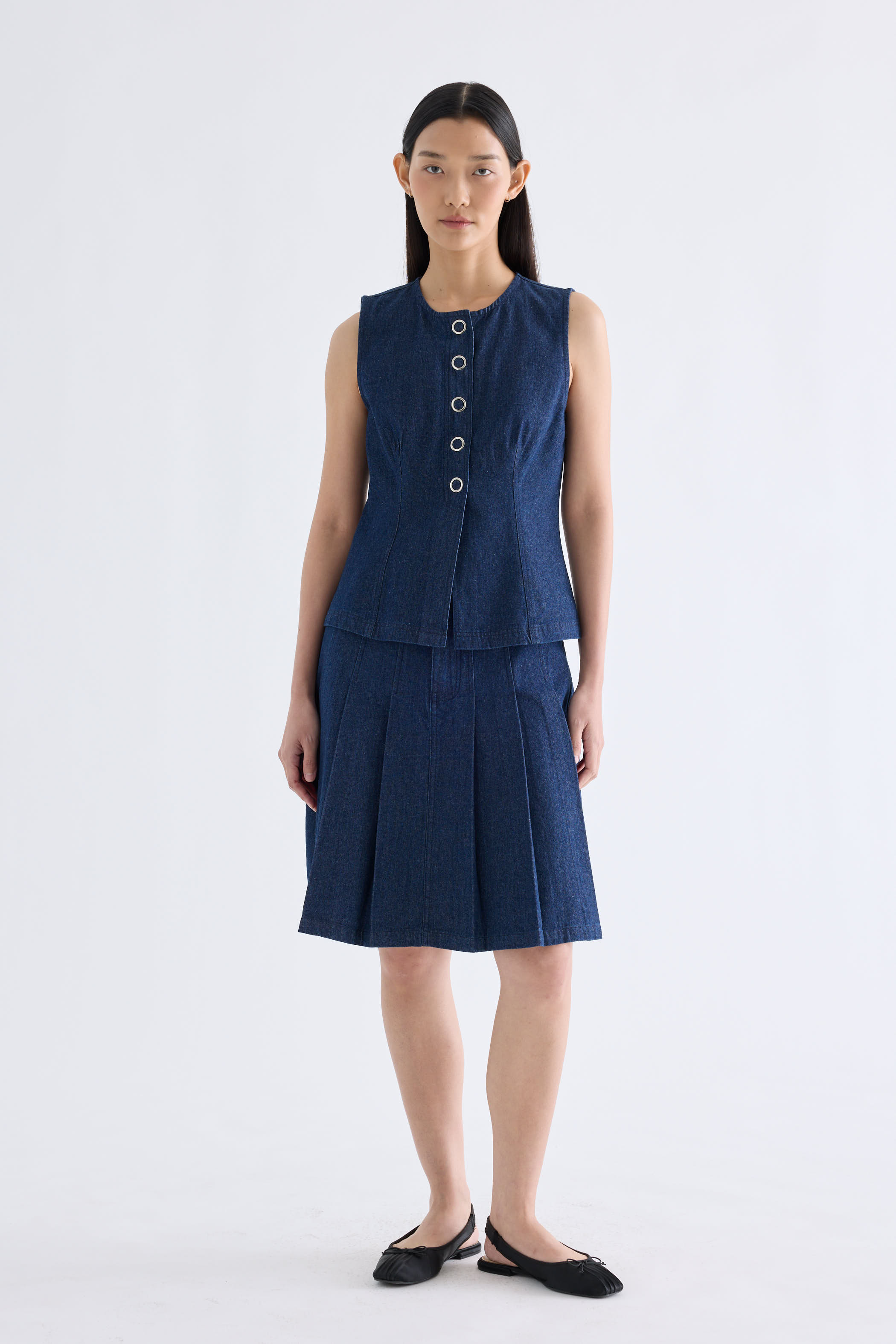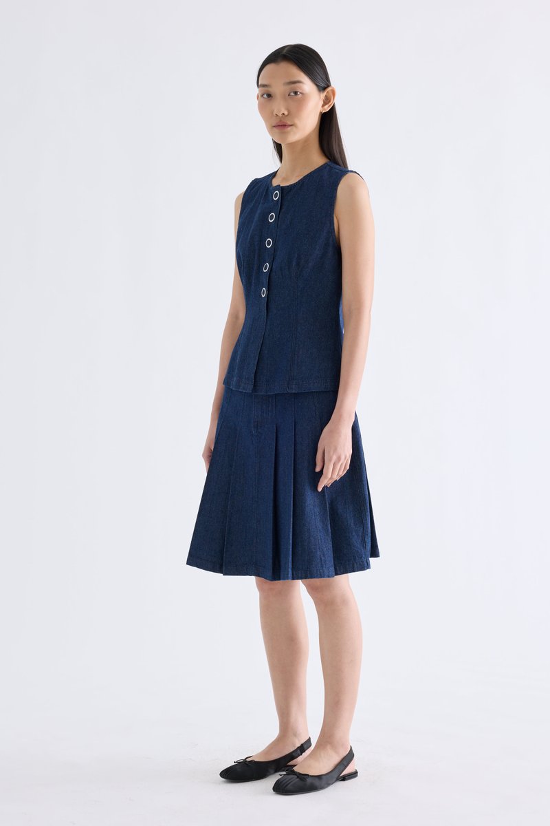 A true-blue essential. Made from softly structured cotton denim, this sleeveless top features a round neckline, sleek panelling and front snap buttons. Worn in a slim fit.