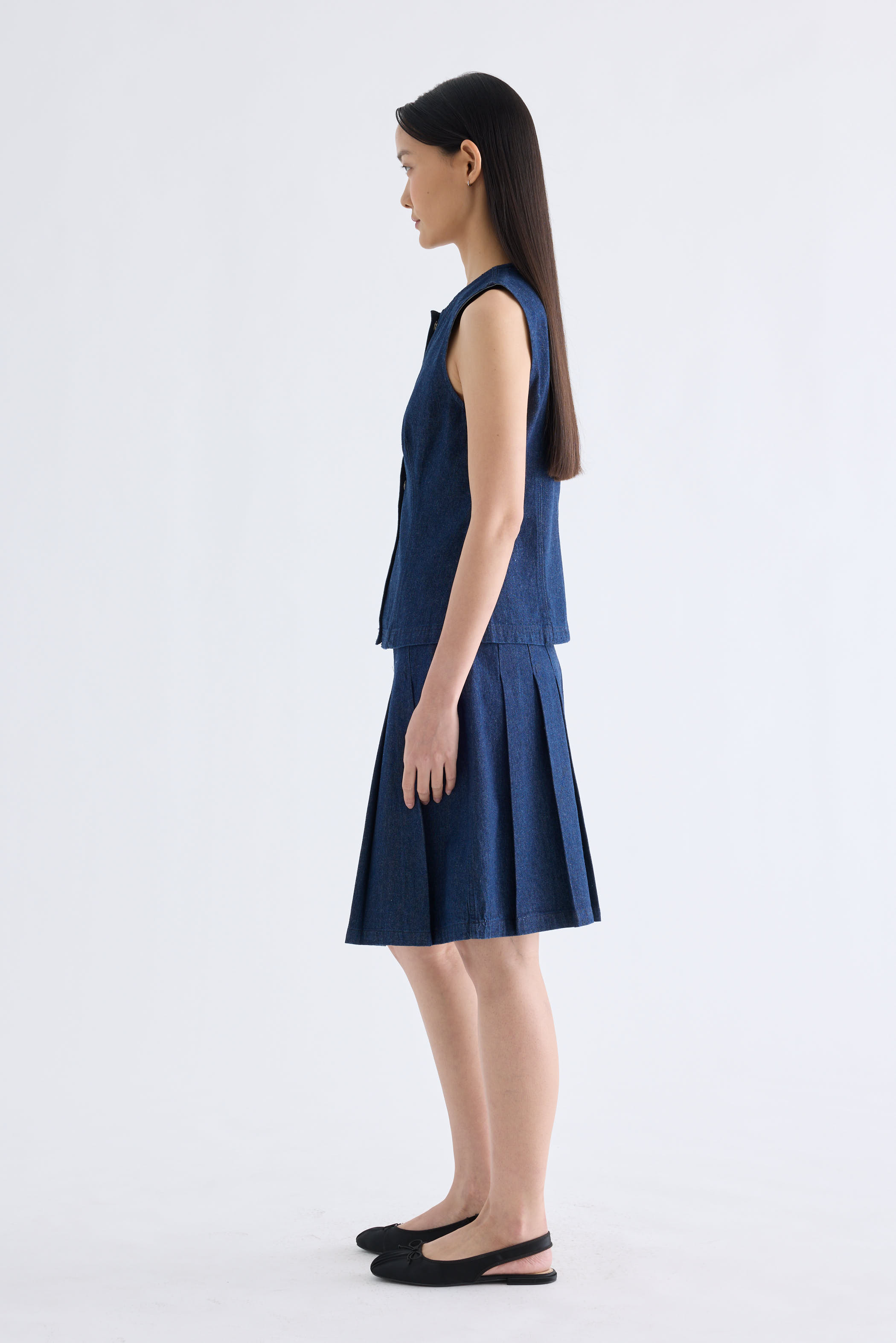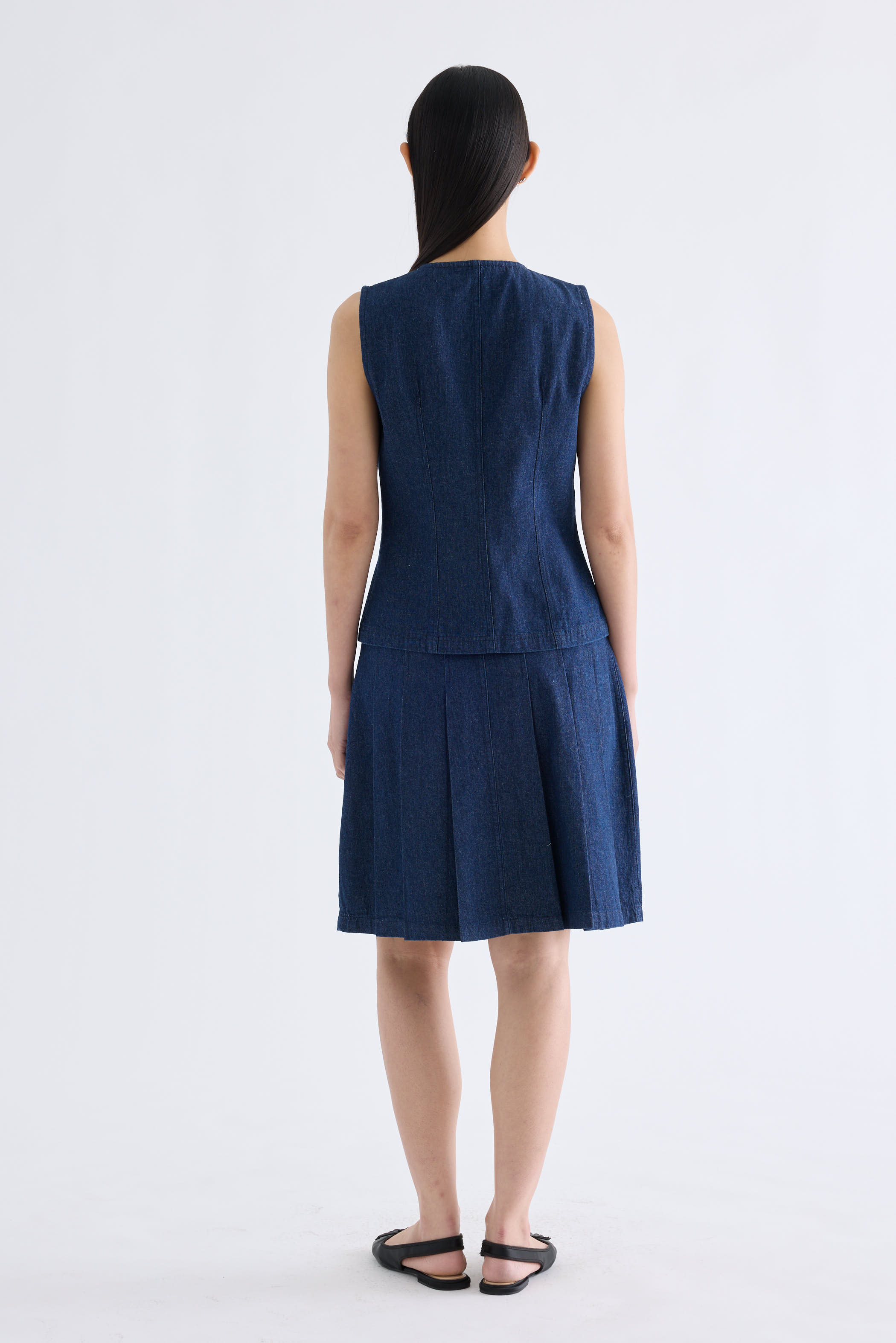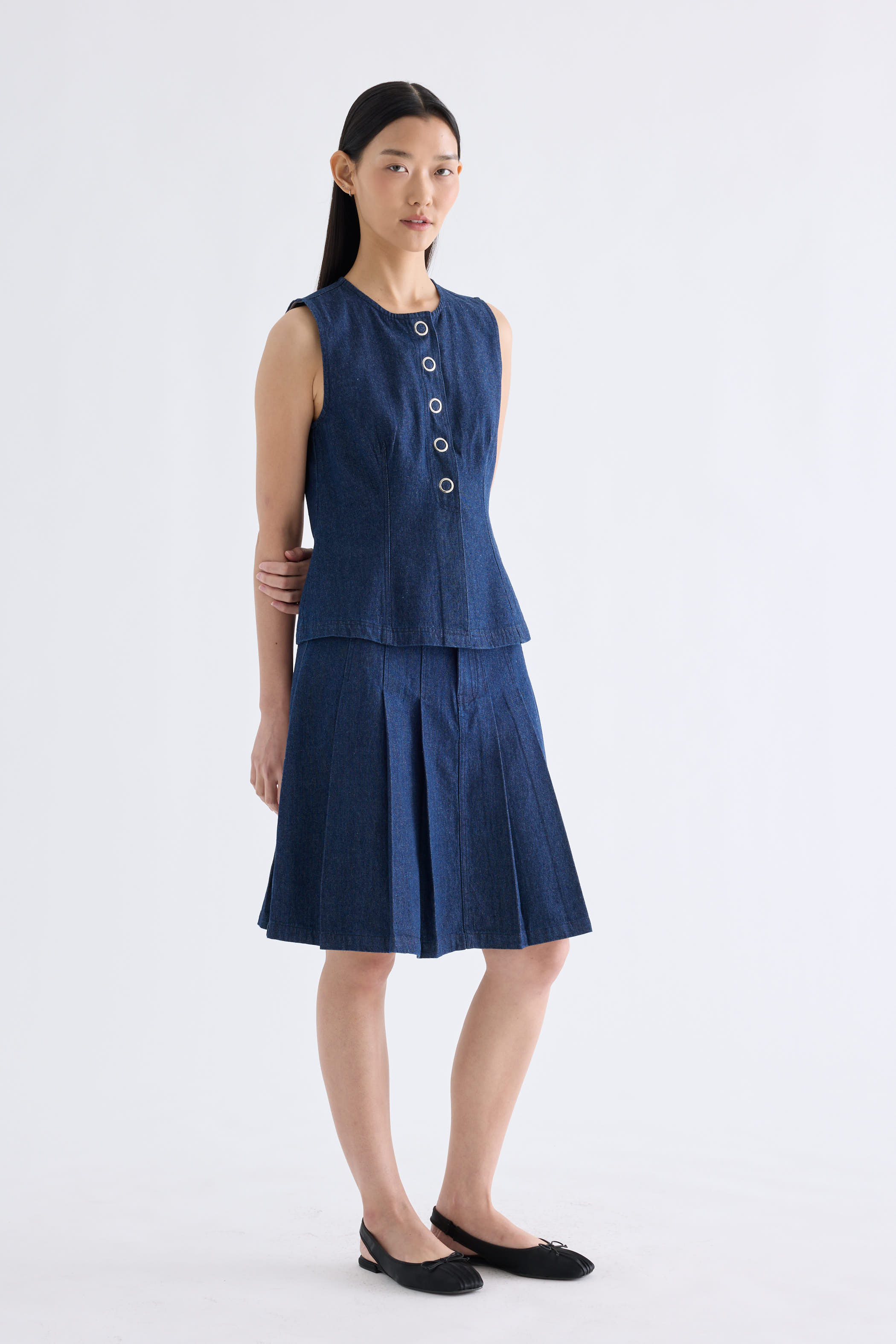 A true-blue essential. Made from softly structured cotton denim, this sleeveless top features a round neckline, sleek panelling and front snap buttons. Worn in a slim fit.