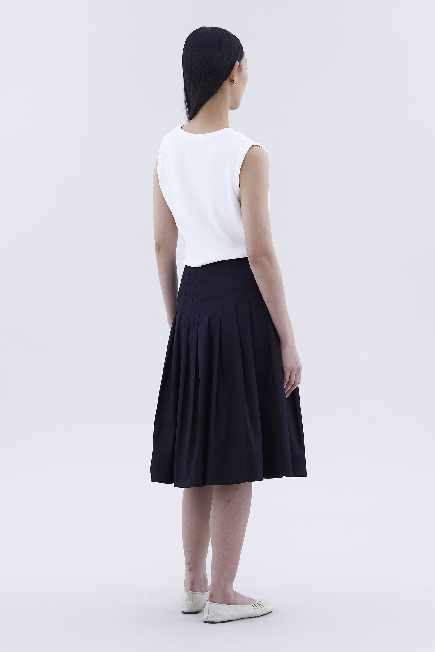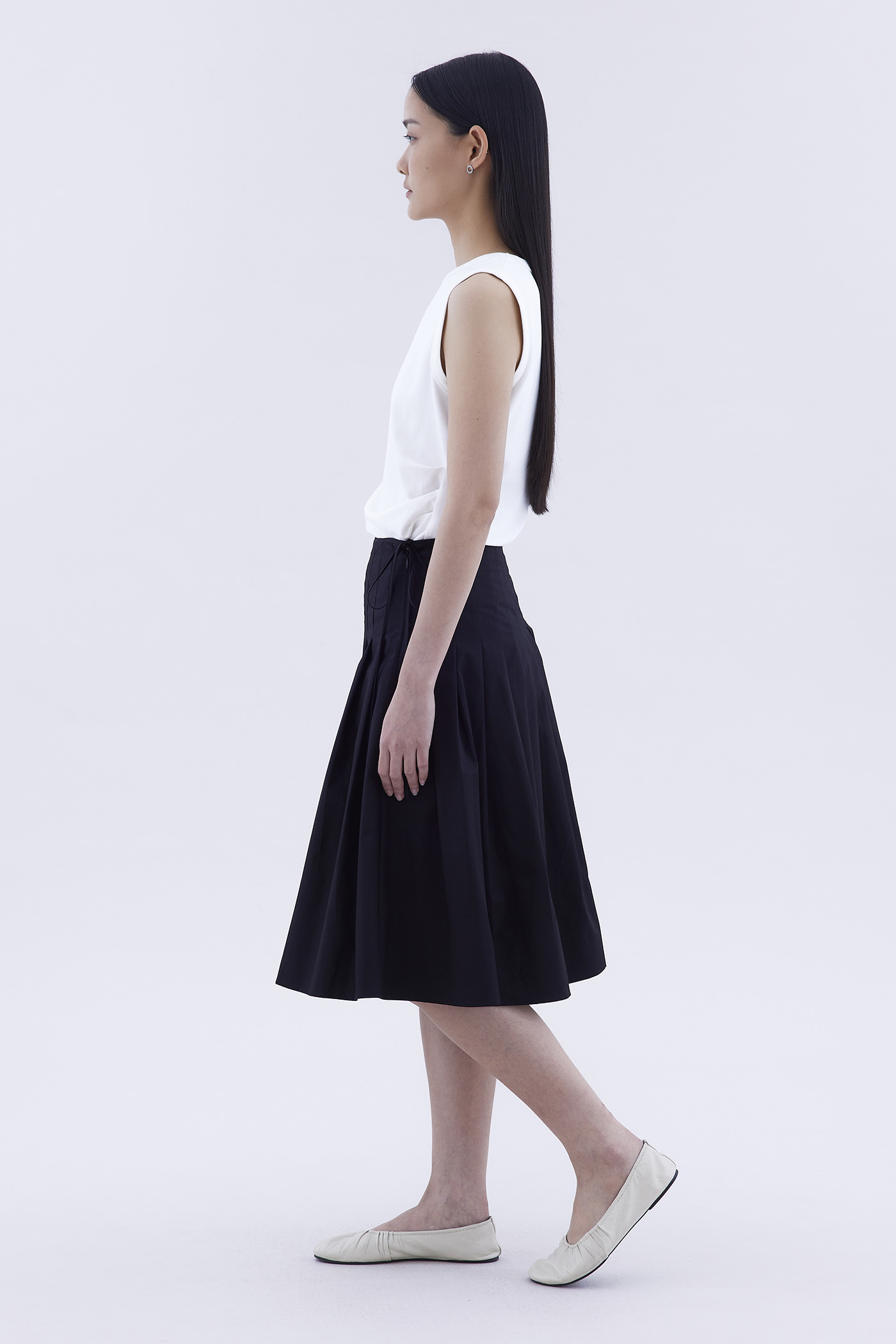 Feeling preppy. Made from crisp and softly structured cotton, this knee-length skirt features pleats, a waist tie-strap and a side zip closure. Fits slim in an A-line silhouette.