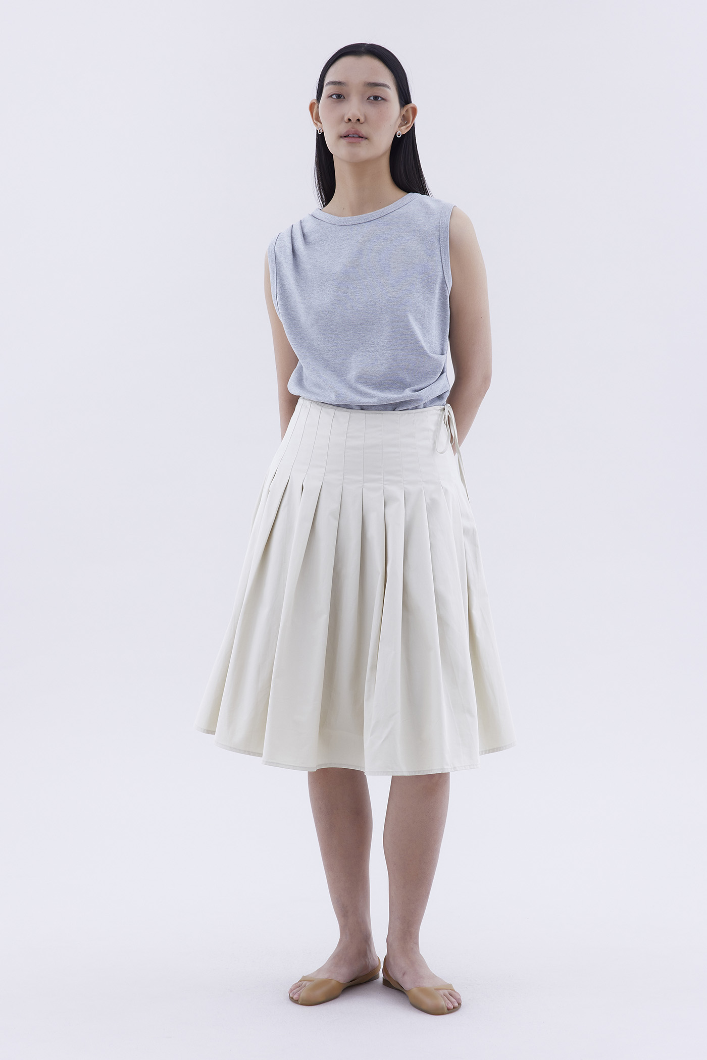 Feeling preppy. Made from crisp and softly structured cotton, this knee-length skirt features pleats, a waist tie-strap and a side zip closure. Fits slim in an A-line silhouette.