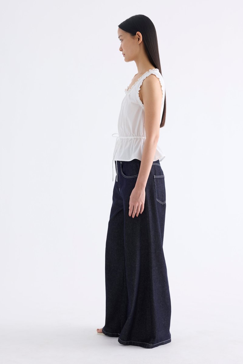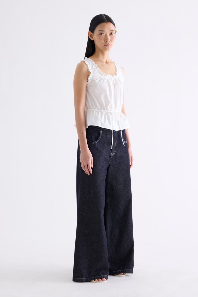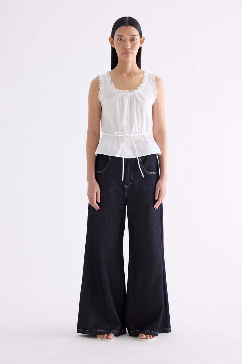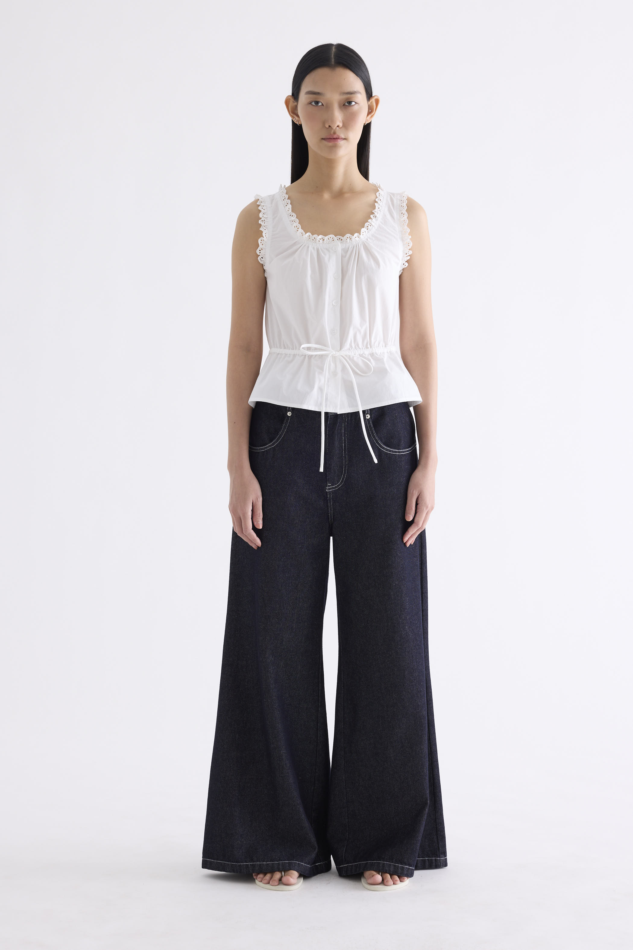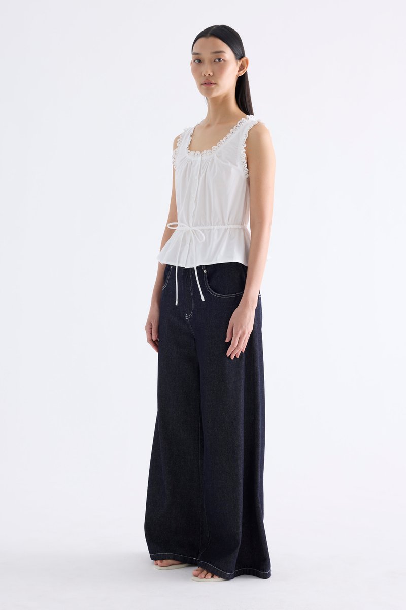 Details first. Made from smooth and softly structured cotton, this sleeveless top features a lace-trimmed U-shaped neckline, lace-trimmed shoulder straps, an adjustable drawstring waist-tie and a button-down front. Worn in a slim fit.