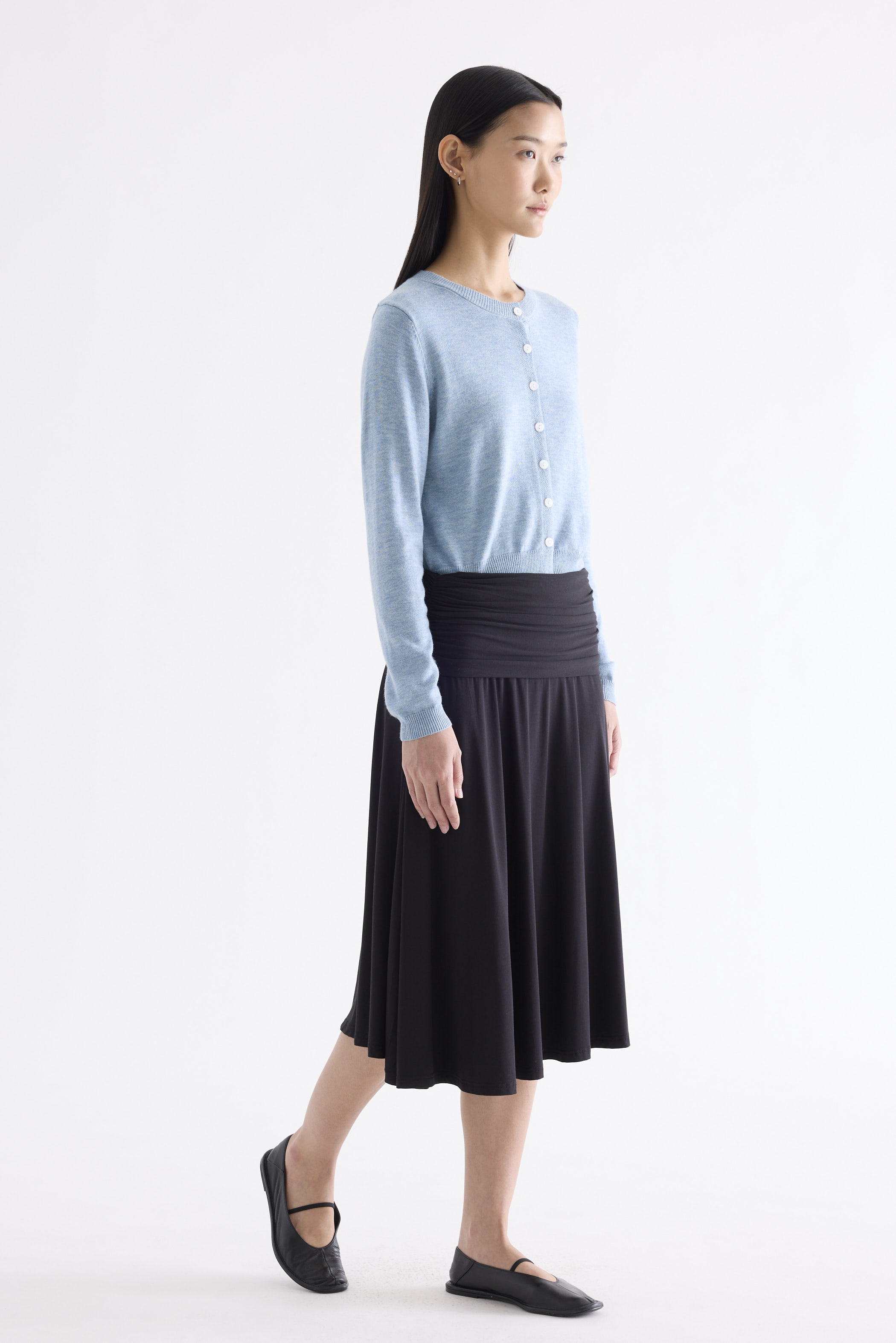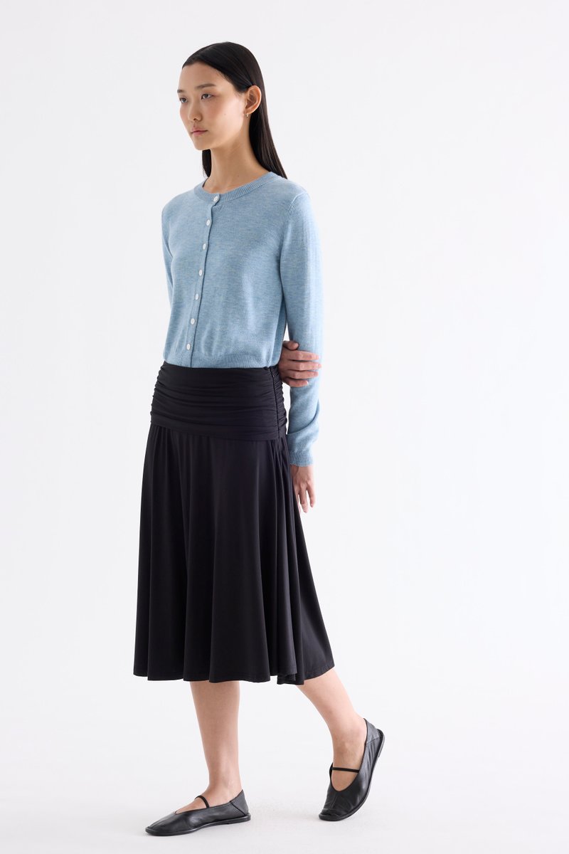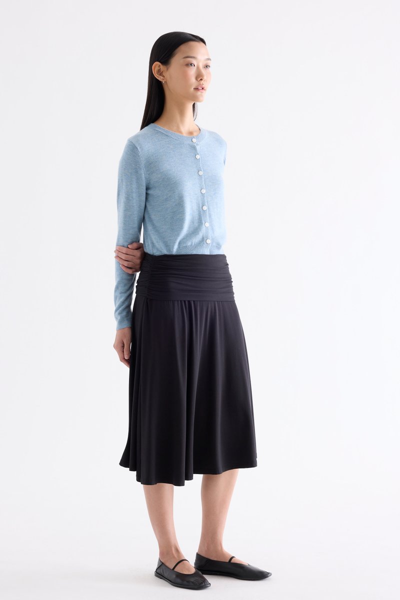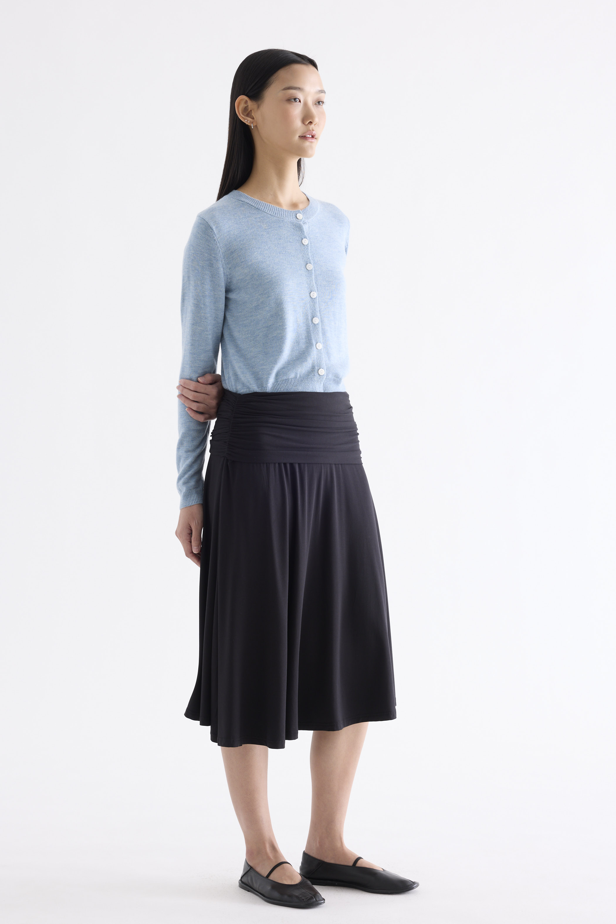 Fluid forms. Made from smooth and flowy fabric, this midi skirt features a stretchy and ruched foldover waist, as well as a side zip closure. Worn in a slim fit.