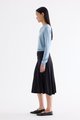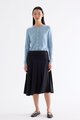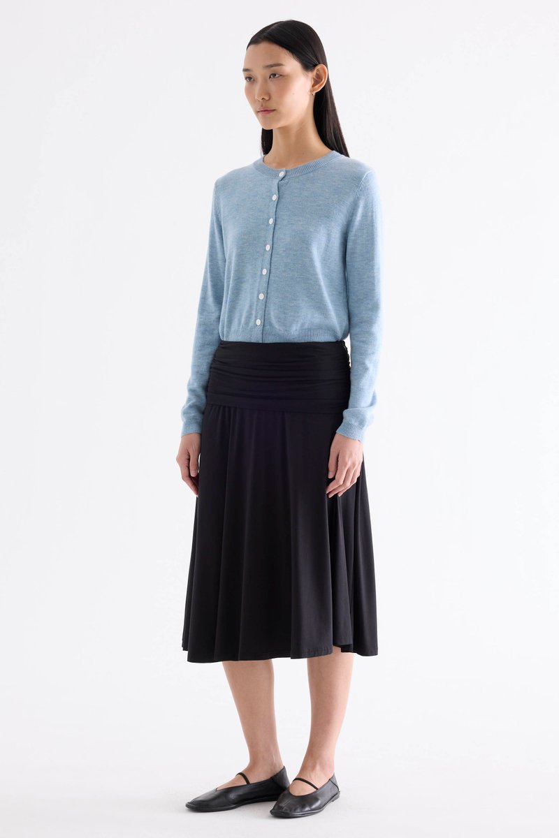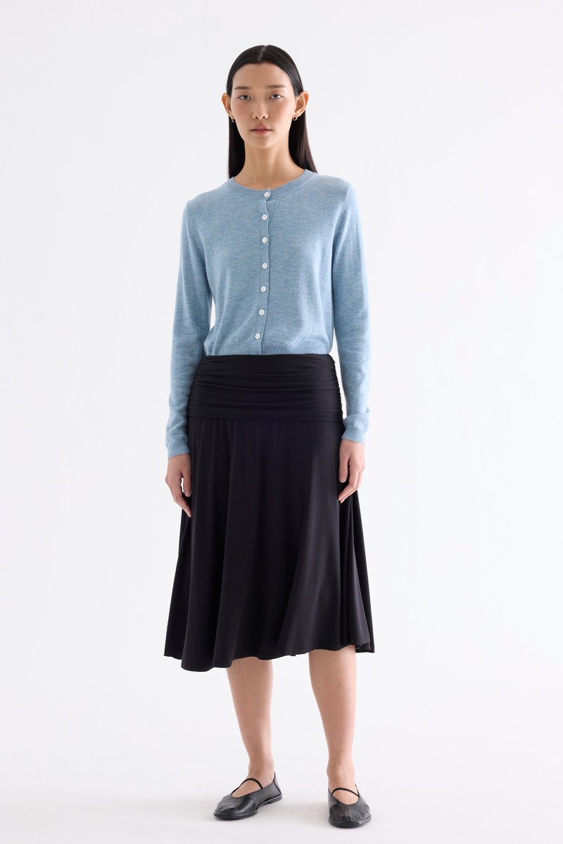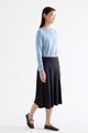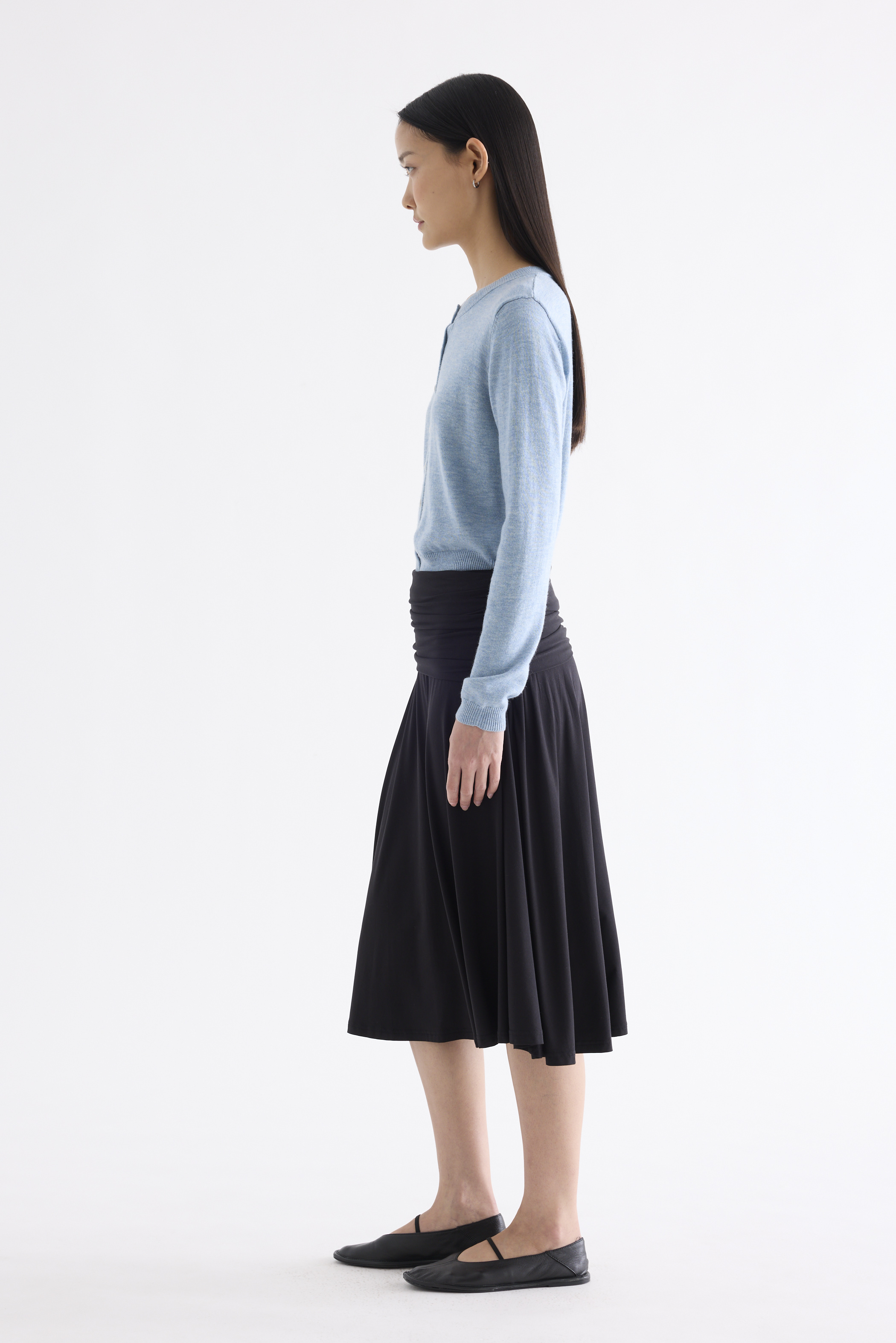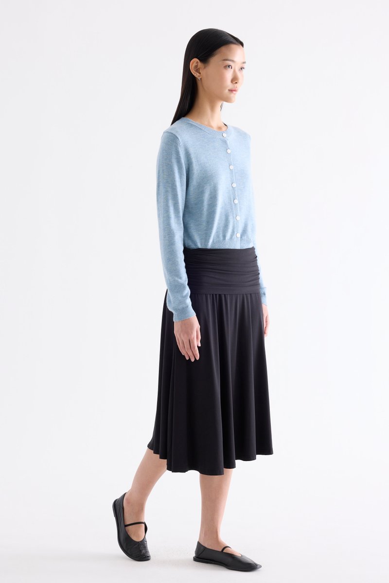 Fluid forms. Made from smooth and flowy fabric, this midi skirt features a stretchy and ruched foldover waist, as well as a side zip closure. Worn in a slim fit.