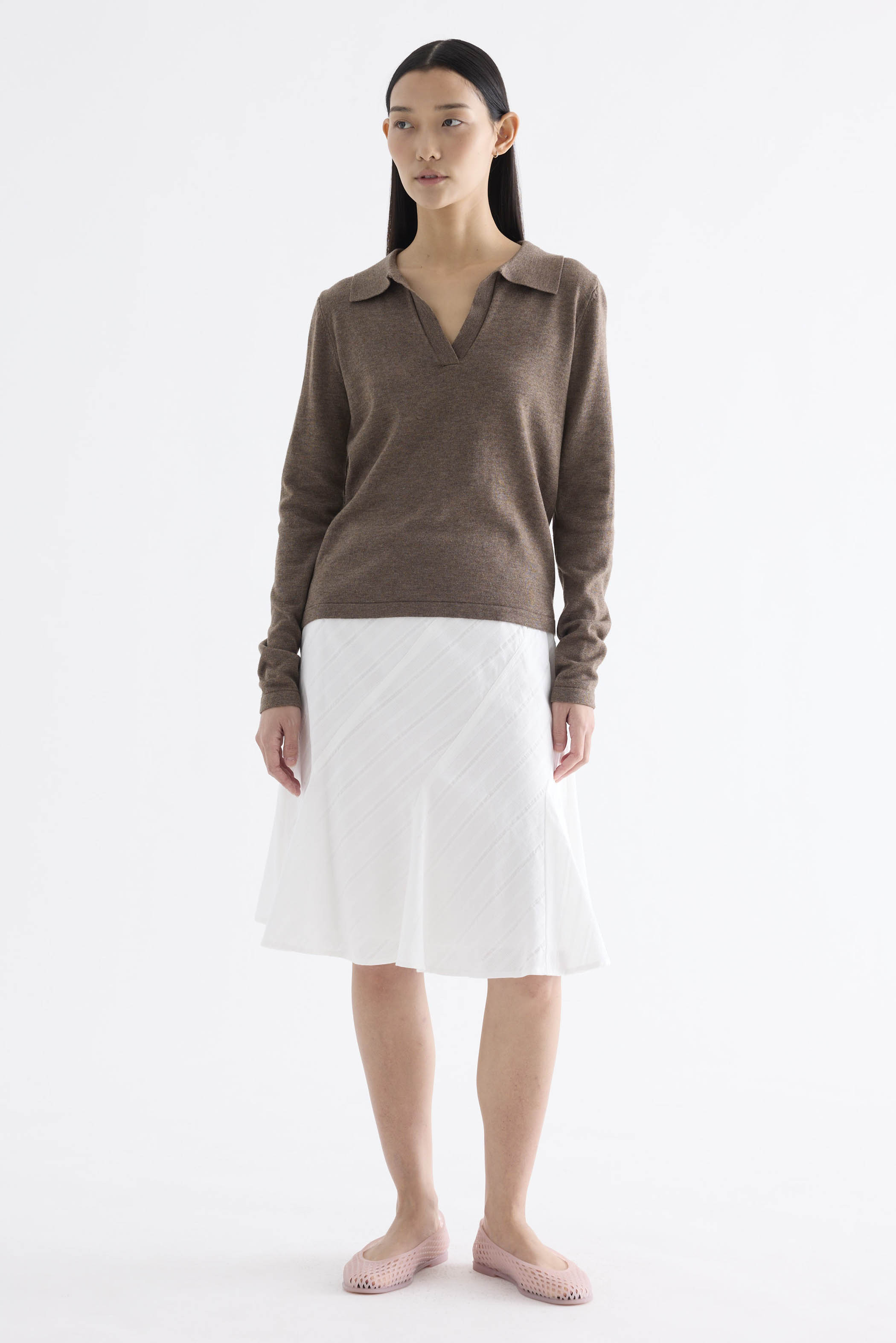 Snug enough. Made from soft and cosy knit, this sweater top features a collared V-neckline and slim fit.