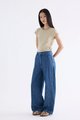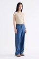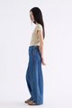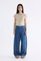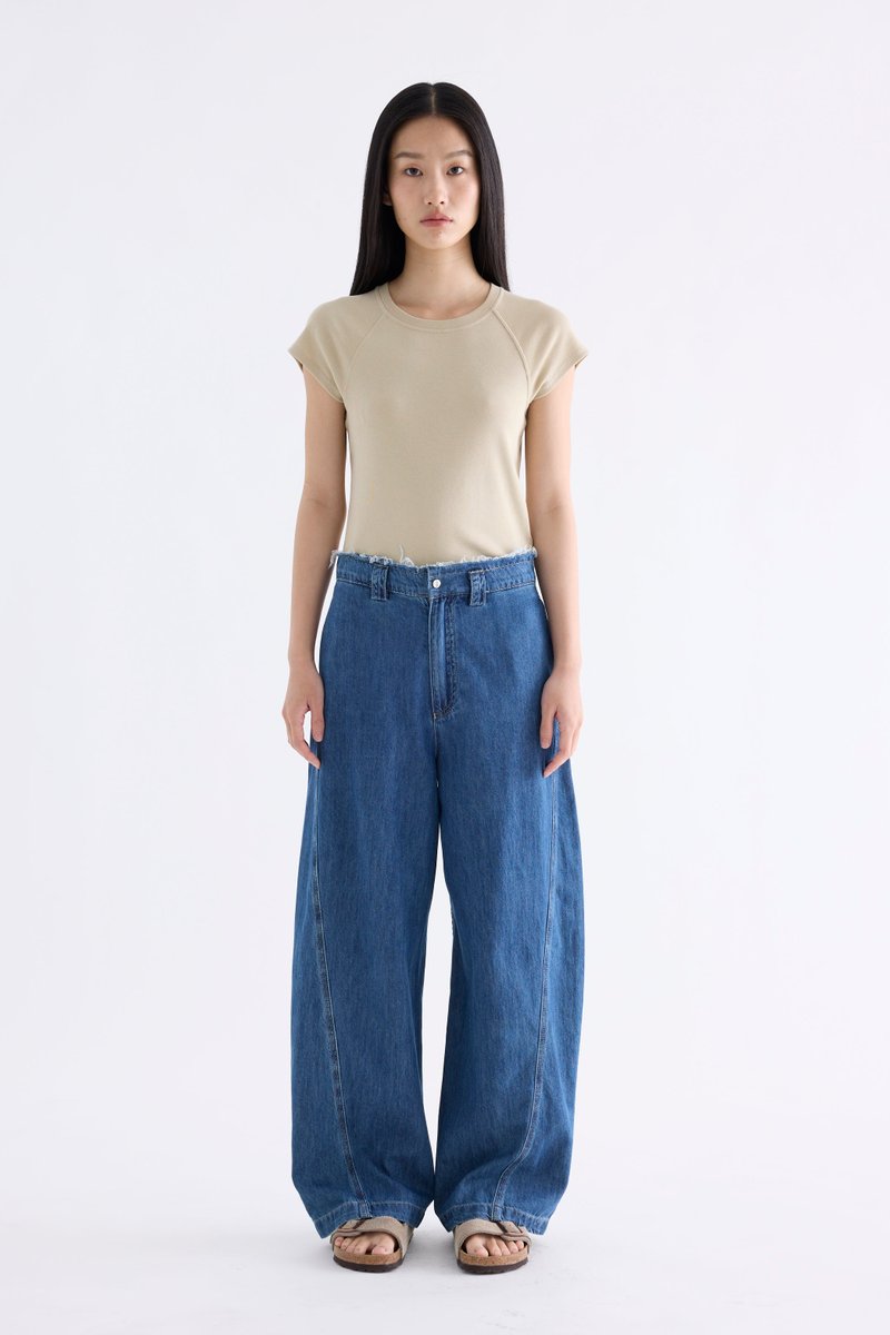 From the Postscript collection. These jeans feature contrast stitching, a raw waistband with broad belt loops and wide legs with an angled seam. Fits relaxed with a front zip and button closure.