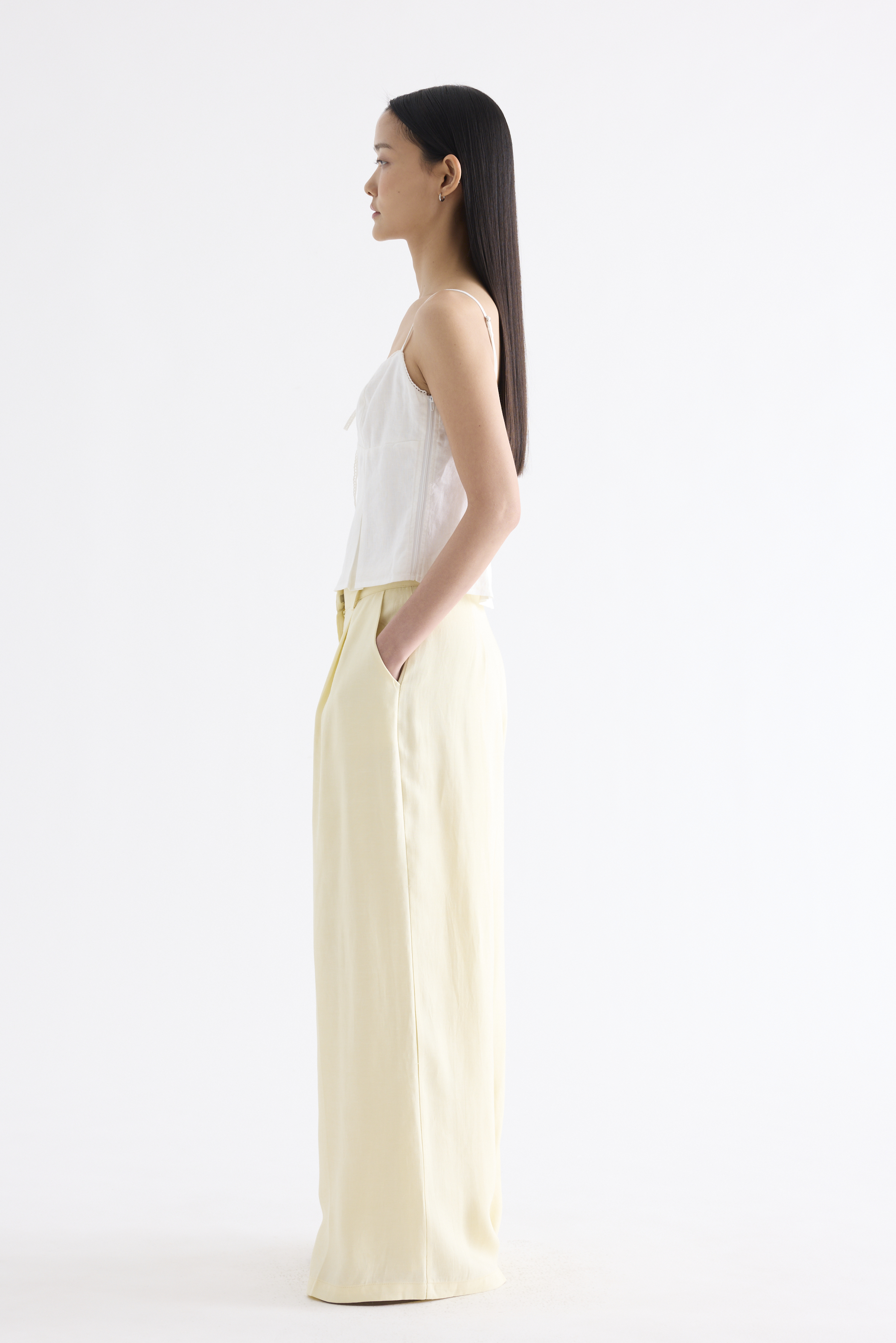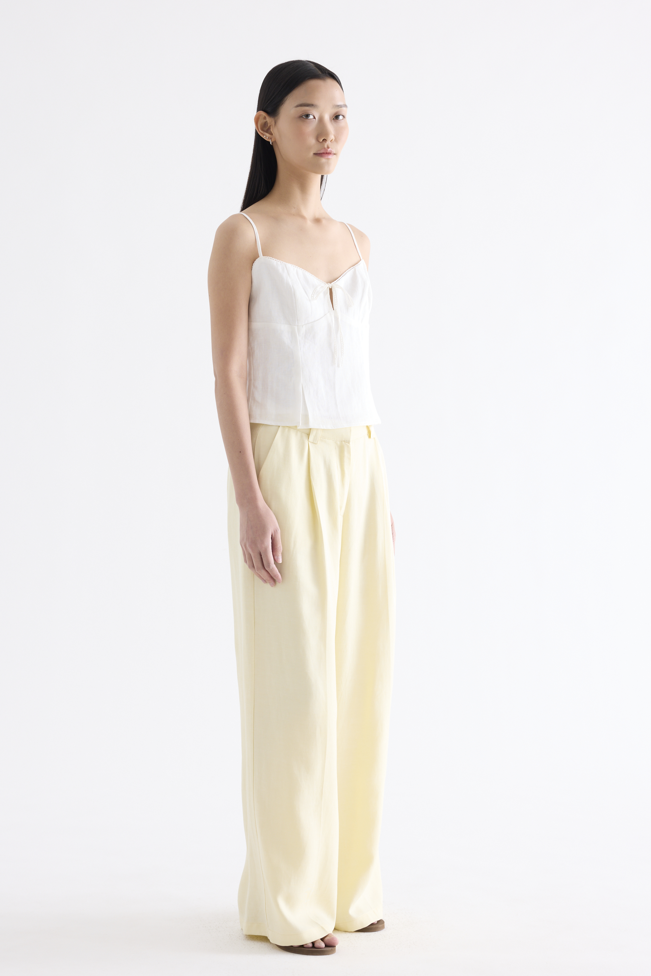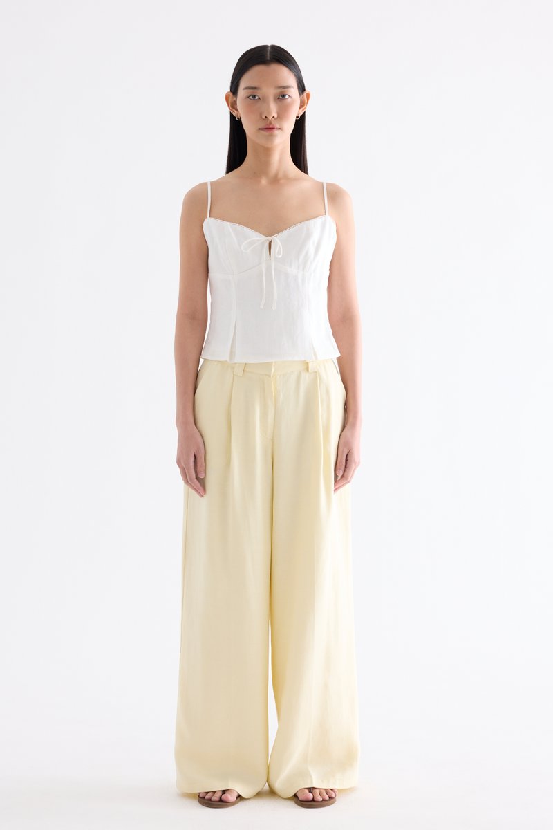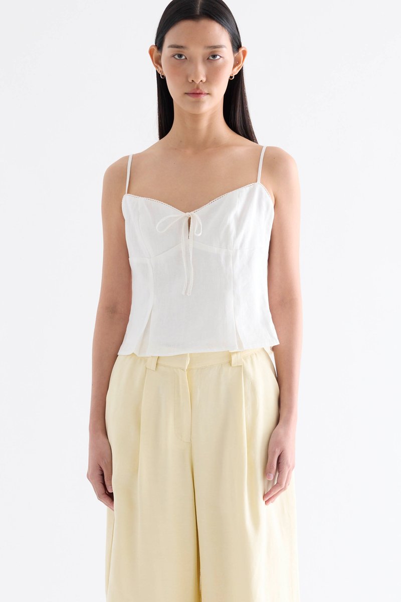 Fit and flatter. Cut from airy and gently tailored 100% linen, this sleeveless top features a crochet-trimmed bustier neckline, a front keyhole opening with a tie-strap closure, slim adjustable shoulder straps and a pleated bodice. Fits slim with a side zip closure.