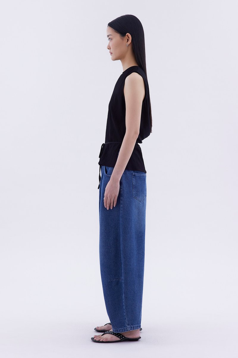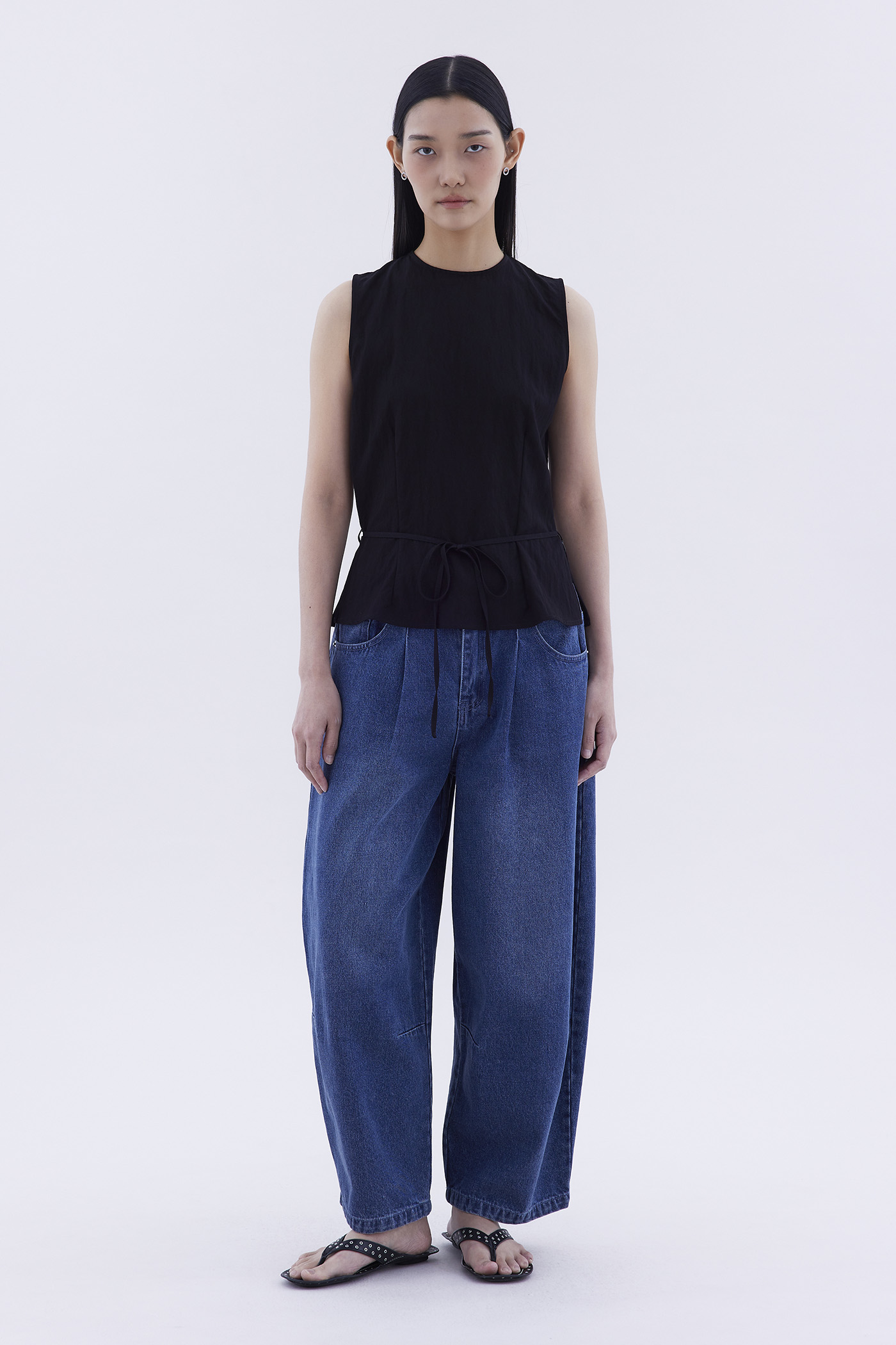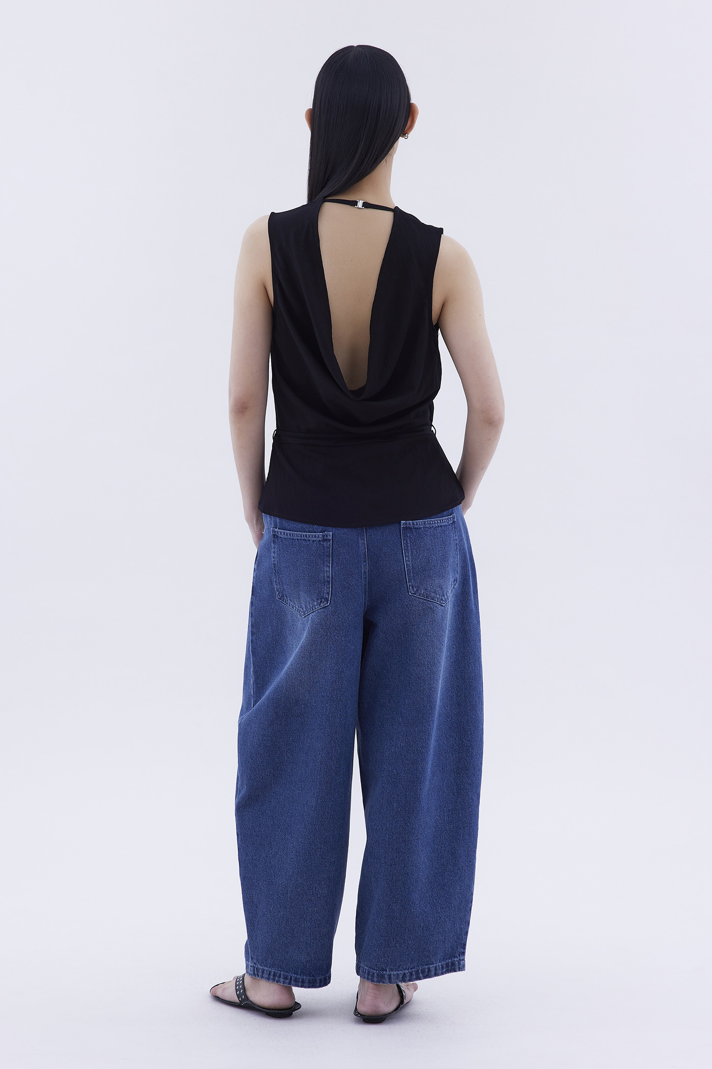 One top, two sides. Made from smooth and airy fabric, this sleeveless top features a round neckline, waist tie-strap, as well as a drapey back opening with a connecting strap. Worn in a relaxed silhouette.